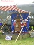 Buttato un occhio curioso ma disinteressato ai due negozi di paccottiglia militare che si affacciano sulla piazza principale del paese, ho ignorato il museo presente all’ingresso dello stesso per dedicarmi ad una lunga visita del campo allestito appena fuori i sobborghi di Sainte-Mère-Église ed occupato da veicoli storici e dalle tende dei loro proprietari. Questi campi sarebbero diventati una piacevole costante dei miei giorni in Normandia e, nonostante il gran numero, erano sempre molto emozionanti e ricchi di suggestioni permettendo quello che può essere onestamente considerato un salto indietro nel tempo. Nel caso in specie, la sensazione era ulteriormente rafforzata dalla presenza di un enorme camion fungente anche da palco per un cantante che, in opportuna divisa, cantava le più famose canzoni degli anni ’40. Si è trattato di una lodevole iniziativa apprezzata da tutti i presenti e che con rammarico non ho trovato in nessun altro accampamento successivo.
