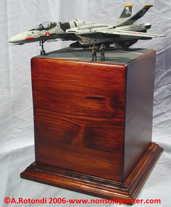 Il modello è stato completato con una base avente lo scopo di limitare il più possibile i due principali difetti legati alla messa in scena di un aereo: l’appiattimento dovuto ai pochi centimetri di altezza del velivolo e l’ampiezza degli spazi orizzontali necessari ed occupati solo in minima parte da ali genericamente lunghe e strette. Per fare tutto ciò, ho realizzato un basamento molto alto allo scopo da elevare il centro dell’attenzione e più stretto della superficie occupata dall’aereo le cui ali, coda e muso sporgono al di fuori dello stesso. In questo modo la scena gode di una altezza in grado catalizzare l’attenzione dell’osservatore coadiuvata da una sensazione di leggerezza garantita dal ristretto volume complessivo.