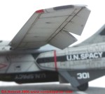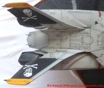 Oltre ad evidenziare i contorni delle pannellature con colori ad olio (nero e bruno Van Dyck) molto diluiti, ho, probabilmente sotto l’influsso di radicate abitudini tratte dal modellismo militare, realizzato anche un lungo quanto accurato lavoro mirato a riprodurre colature di sporco lungo tutta la superficie dell’aereo. Anch’esse sono state realizzate a pennello tirando verso la direzione desiderata i colori ad olio citati (in questo caso lasciati ad una maggior consistenza) ma ammetto che, pur essendo il VF-0S un caccia operativo nella sola atmosfera e quindi soggetto agli agenti atmosferici, attualmente non rifarei più un lavoro simile e di tale intensità.