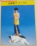 Ovviamente la stampa ed il dettaglio sono a dir poco elementari, eppure c’è della genialità in questo vecchio kit. L’amministratrice della malandata pensione Ikkoku, è rappresentata intenta in una delle sue attività più caratteristiche: spazzare il vialetto di accesso alla casa con indosso il tipico grembiule giallo su cui è ricamato un pulcino pigolante. Posa azzeccattissima in quanto capace istantaneamente di identificare personaggio e contesto. Grazie e teste e braccia opzionali, è anche possibile scegliere di riprodurre due differenti posture di Kyoko, aumentando in tal modo il pregio della scatola di montaggio.