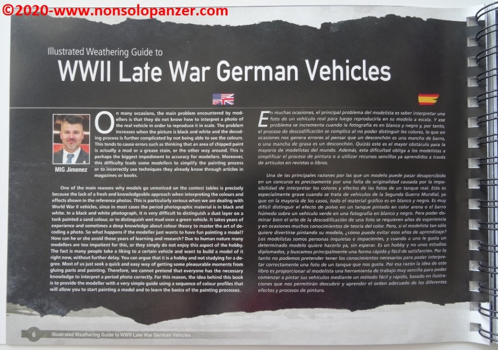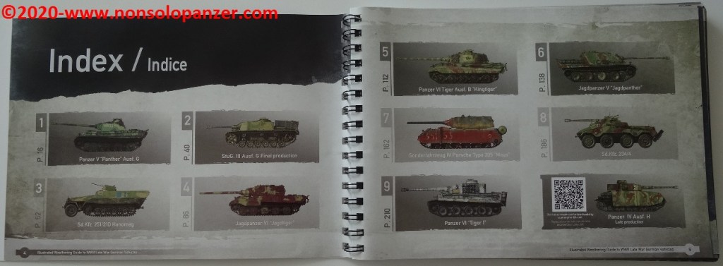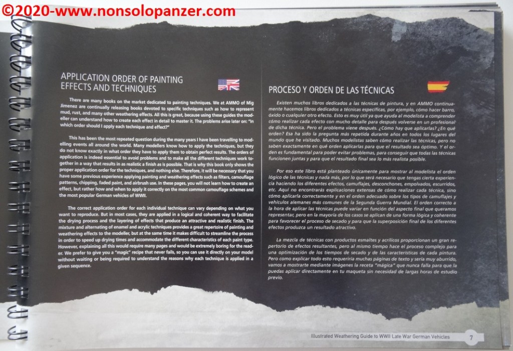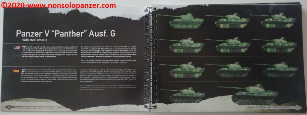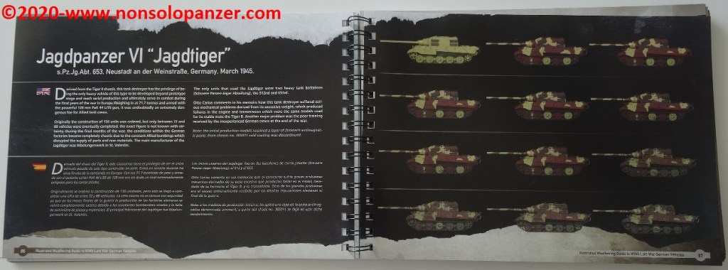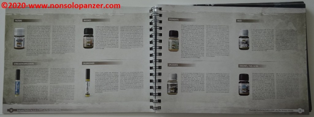 Che tipo di pubblicazione è “Illustrated Weathering Guide to WWII Late War German Wihicles“? Certamente non è un manuale che insegna ad usare una tecnica particolare. Non sono presenti step by step fotografici che mostrino nel dettaglio i vari passaggi nella costruzione, colorazione ed invecchiamento di un veicolo militare. Non aspettatevi, quindi, di imparare il Chipping con questa pubblicazione. E’ un catalogo che mostra e pubblicizza i prodotti Ammo nel tentativo di renderveli indispensabili nella realizzazione di un modello? Obiettivamente, sì. Considerando che l’editore è la stessa Ammo, pretendere diversamente sarebbe ipocrita. Non mi sento nemmeno di escludere che il costo contenuto di una pubblicazione tanto voluminosa (circa 25 Euro) sia anche dovuto alla finalità promozionale dell’intero volume.