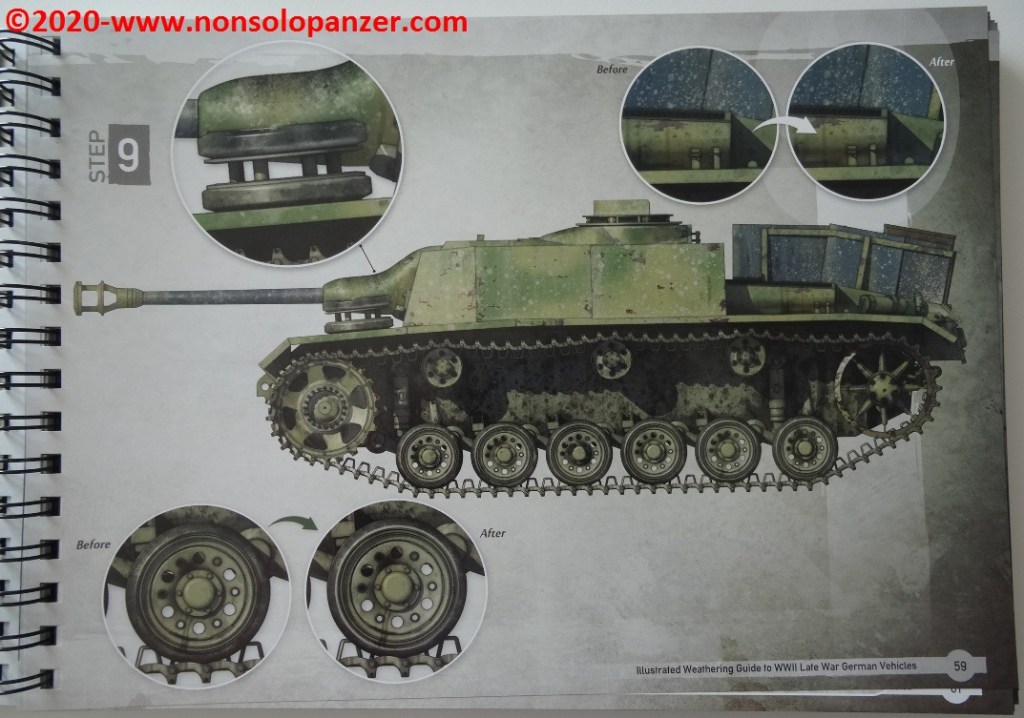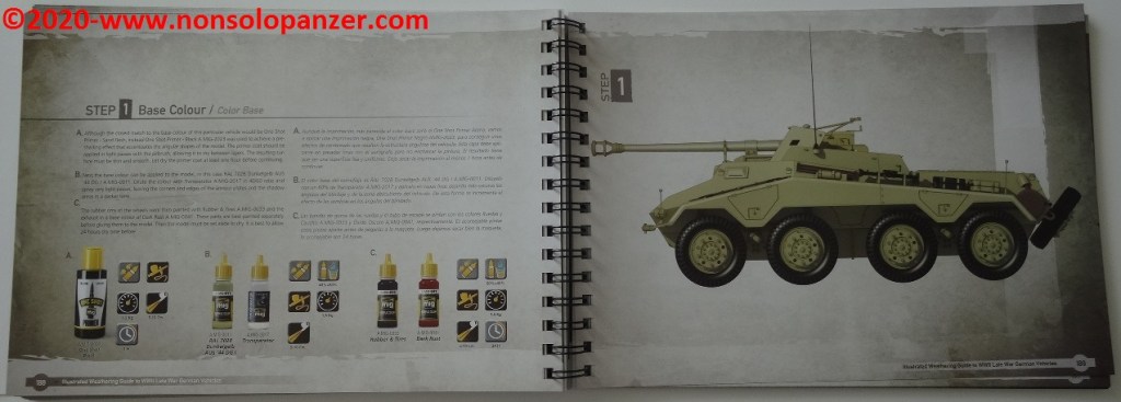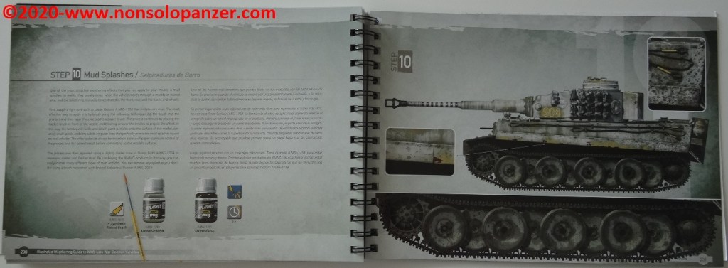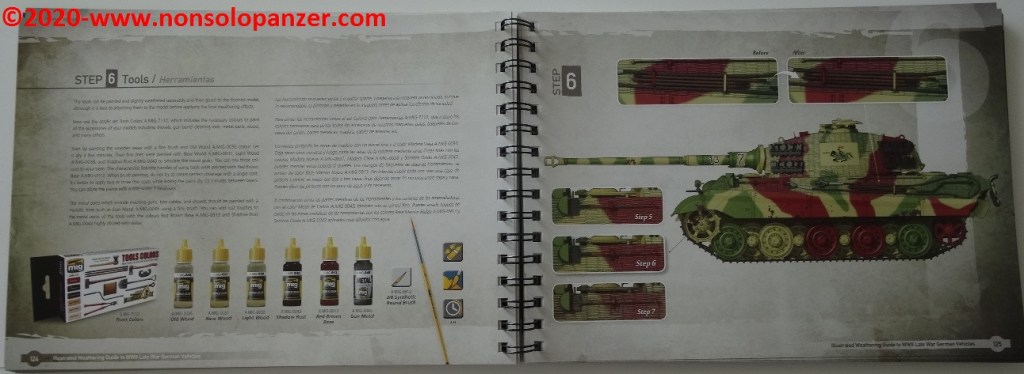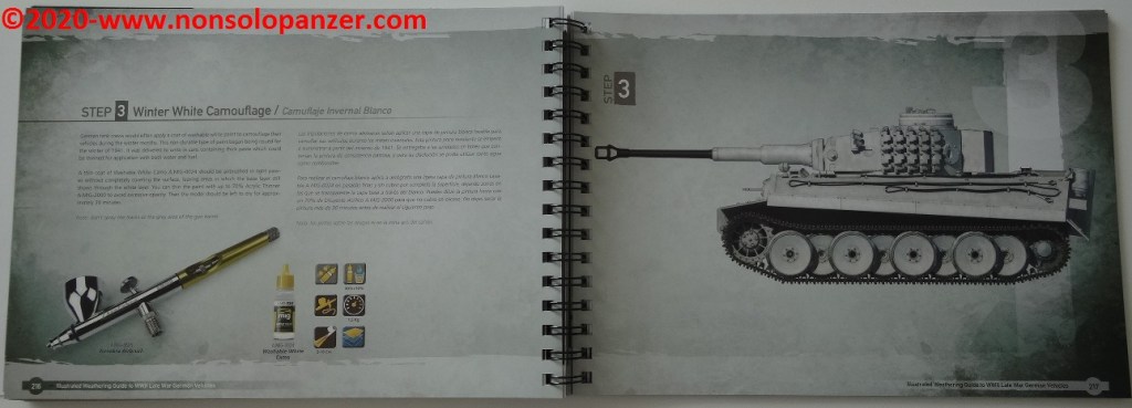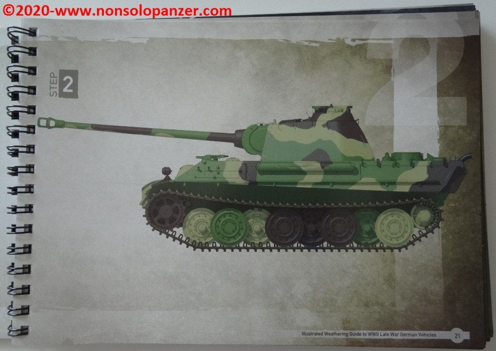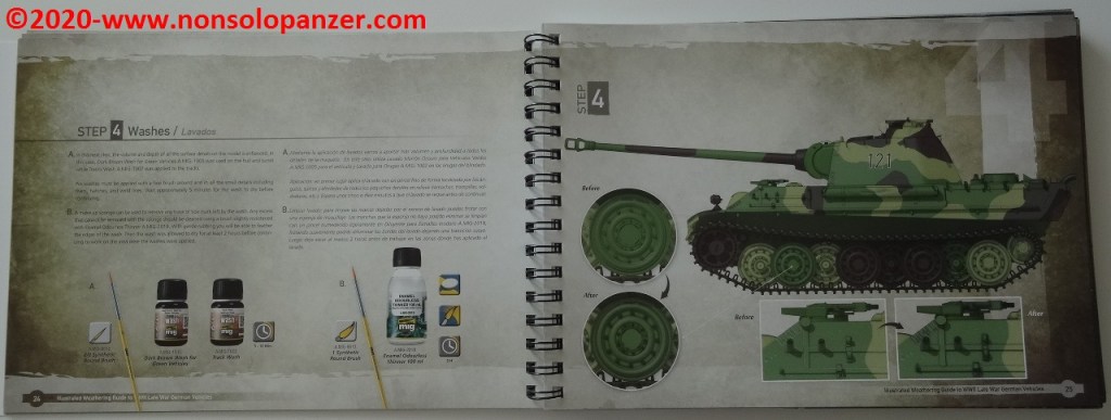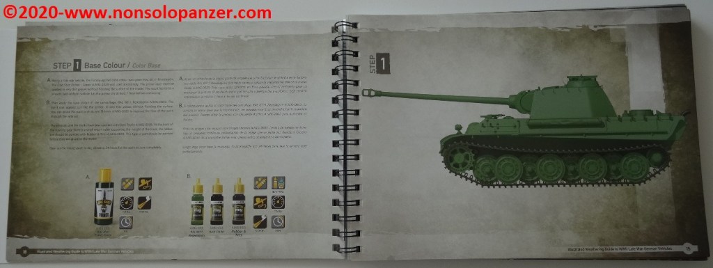 Ciò detto, che utilità ha questa guida illustrata all’invecchiamento dei veicoli tedeschi di fine guerra? La domanda è legittima visto che non intende essere un manuale. Identifico tre finalità. La prima è di chiarire che tipo di prodotti propone Ammo per ogni specifica fase che compone il processo d’invecchiamento di un modello. La seconda è di mostrare quale effetto riproducono tali prodotti e, ultimo ma non per importanza, “Illustrated Weathering Guide to WWII Late War German Wihicles“, in modo semplice ed efficace, mostra in che ordine devono essere applicate le varie tecniche di invecchiamento.