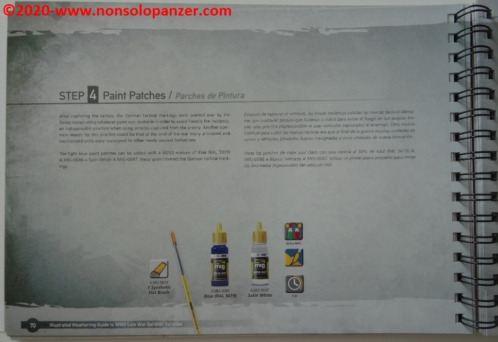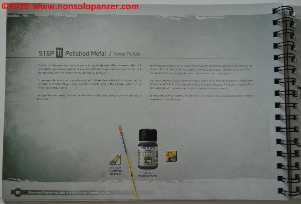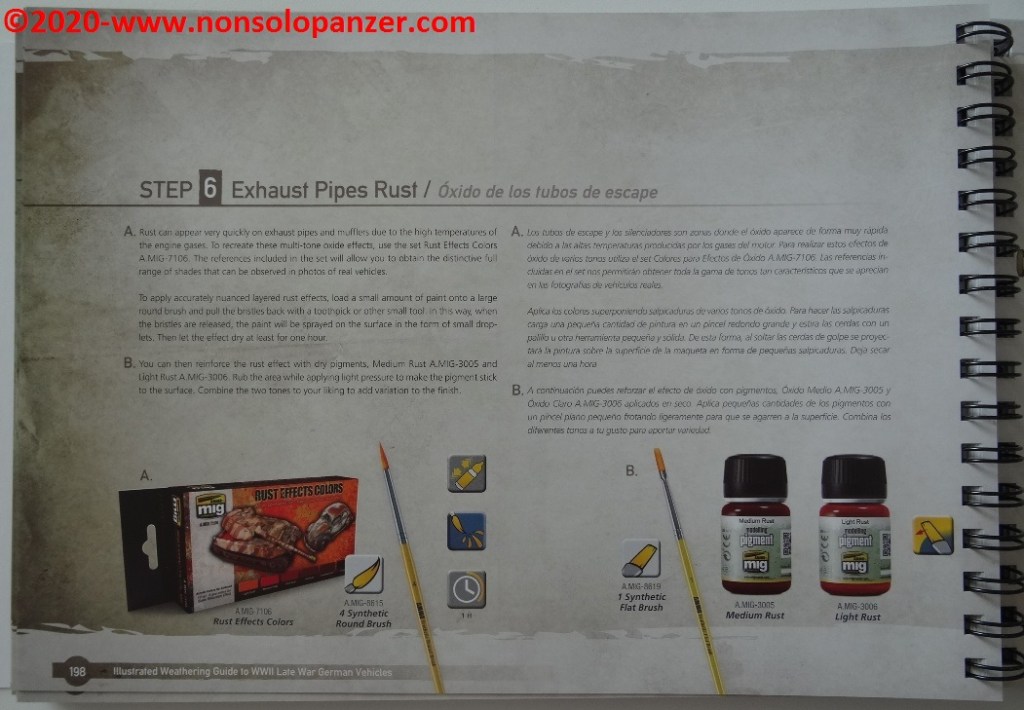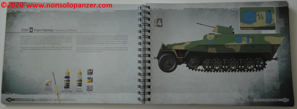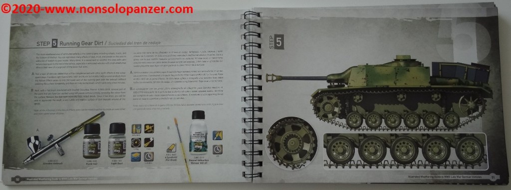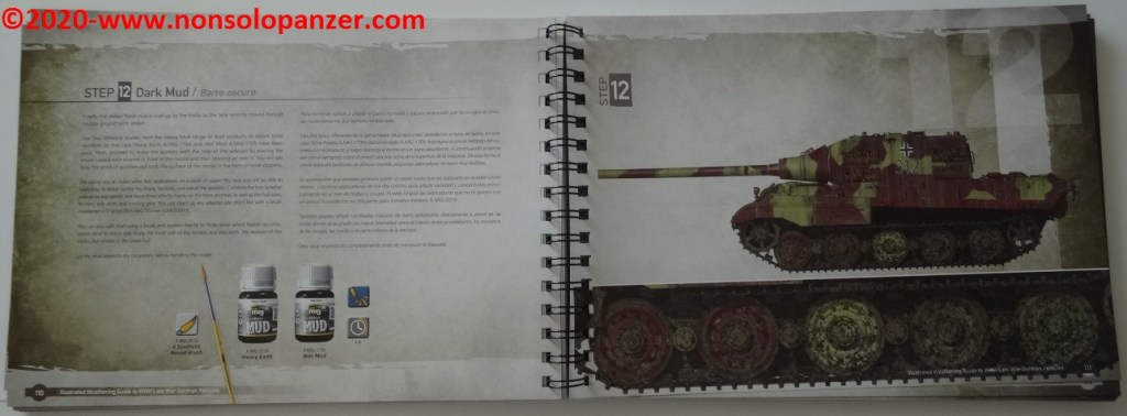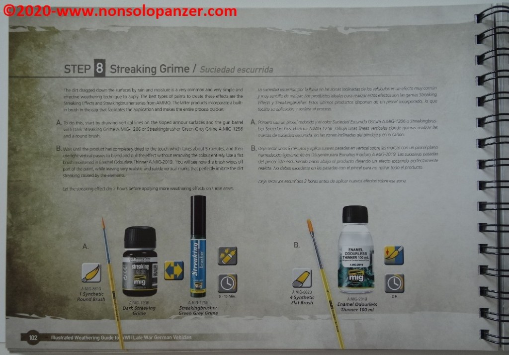 Ciò detto, che utilità ha questa guida illustrata all’invecchiamento dei veicoli tedeschi di fine guerra? La domanda è legittima visto che non intende essere un manuale. Identifico tre finalità. La prima è di chiarire che tipo di prodotti propone Ammo per ogni specifica fase che compone il processo d’invecchiamento di un modello. La seconda è di mostrare quale effetto riproducono tali prodotti e, ultimo ma non per importanza, “Illustrated Weathering Guide to WWII Late War German Wihicles“, in modo semplice ed efficace, mostra in che ordine devono essere applicate le varie tecniche di invecchiamento.