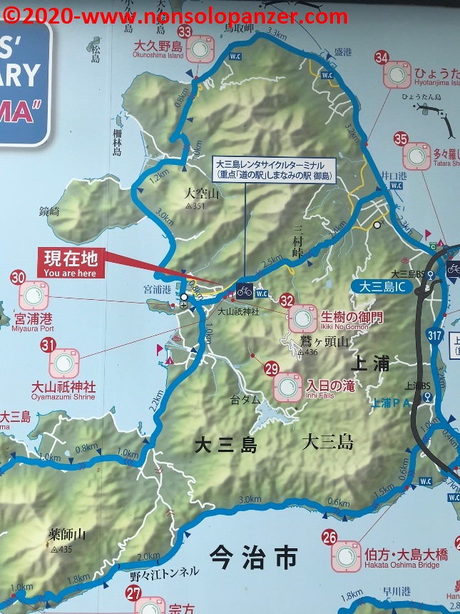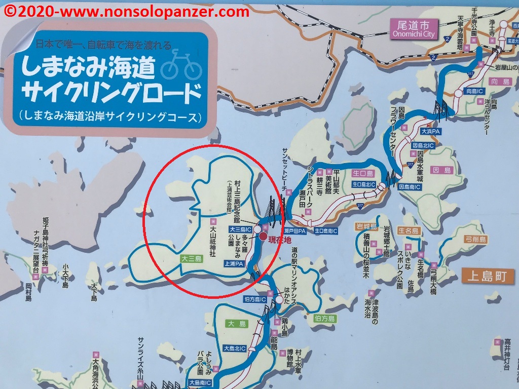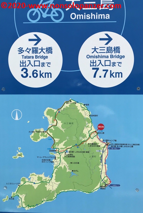 Dopo i racconti delle mie scorribande ciclistiche sull’isola di Oshima e di Hakata, eccomi a tornare nello Shimanami Kaido per ripercorrere con la memoria quanto visto e fatto sull’isola di Omishima nel corso della mia vacanza in Giappone del 2019. Devo, per prima cosa, confermare che, a dimostrazione dell’intensità con cui ho vissuto l’esperienza, i ricordi di quei giorni sono ancora molto vivi in me nonostante sia passato più di un anno. Penso non si possa chiedere di più da una vacanza! Come anticipato, Omishima è stata la terza isola da me esplorata sulle due ruote ma, a differenza dei casi precedenti, non l’ho percorsa in lungo ed in largo a causa del tempo incerto e piovigginoso che condizionò inevitabilmente il programma della giornata. Preferii, per ovvie ragioni, sfruttare una ciclabile che, passando per l’interno dell’isola, mi ha condotto direttamente alle due principali attrattive del luogo: il tempio di Oyamazumi ed il porto di Miyaura.