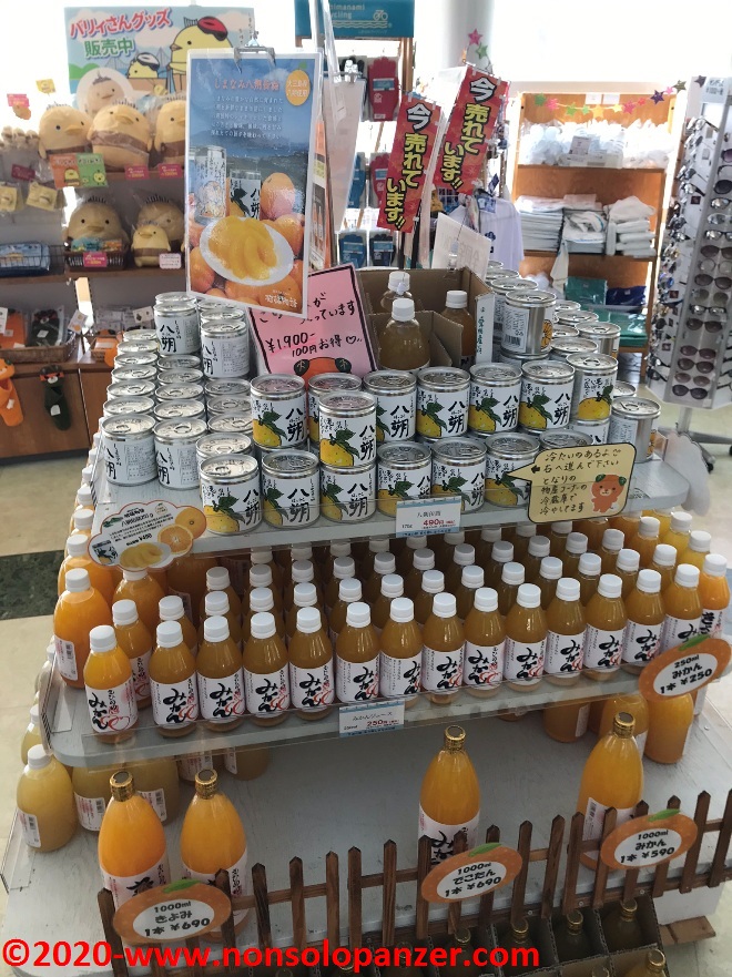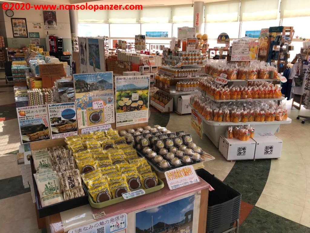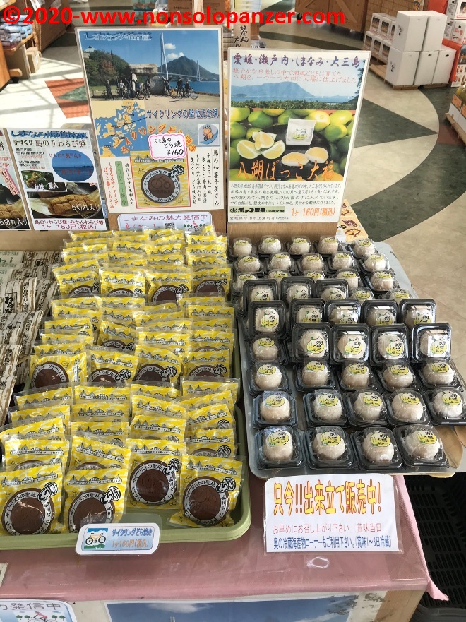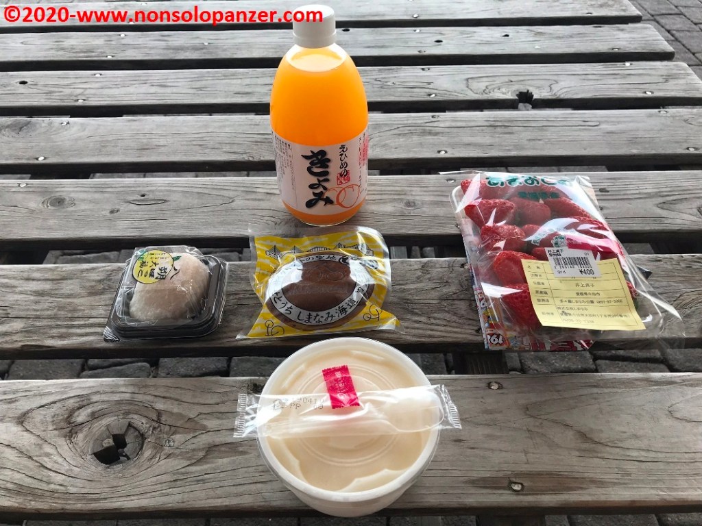 Come ormai usuale, sono partito la mattina presto da Imabari e sono arrivato in autobus alla fermata di Omishima. Qui, come da prassi consolidata, ho trovato la stazione di noleggio pubblico dove ho preso in consegna la bici che mi avrebbe accompagnato per il resto della giornata ed ho visitato il mercatino di prodotti locali che non manca mai in questi contesti. Sarò ripetitivo e scontato ma subisco sempre il fascino delle merci giapponesi, delle loro confezioni e del modo in cui vengono esposti. Spesso, quindi, finisco per scattare foto agli scaffali. Immagini che non posso certo esimermi dal mostrare qui sotto. Non ho perso occasione di acquistare il necessario per una colazione vista mare, opportunità impreziosita dalla disponibilità di una confezione di fragole comprata ad un banchetto di un agricoltore locale.