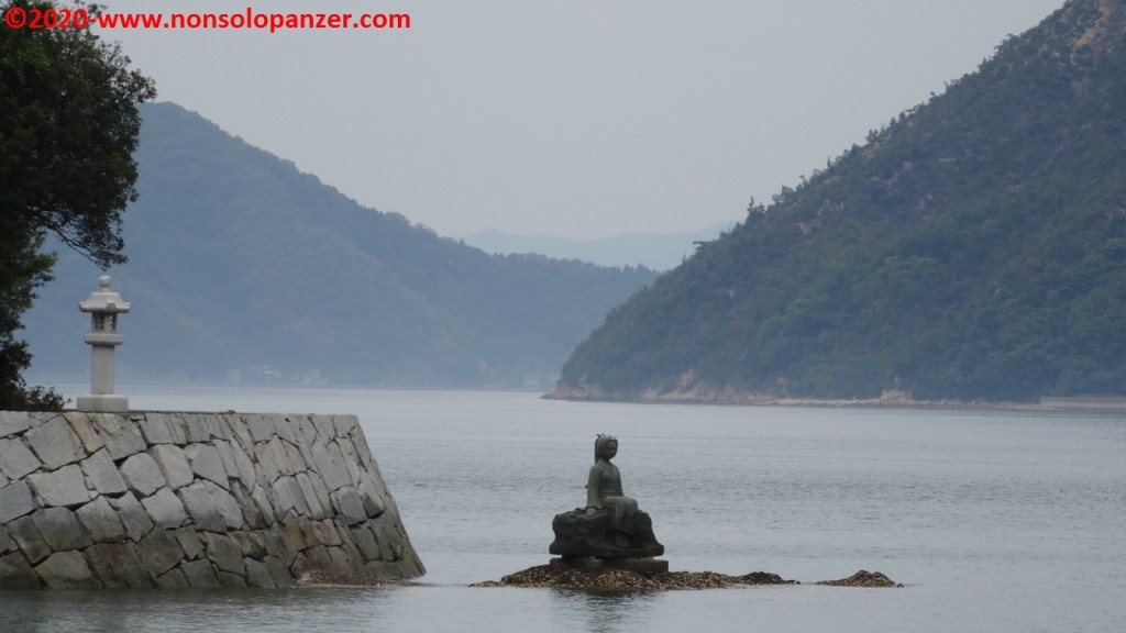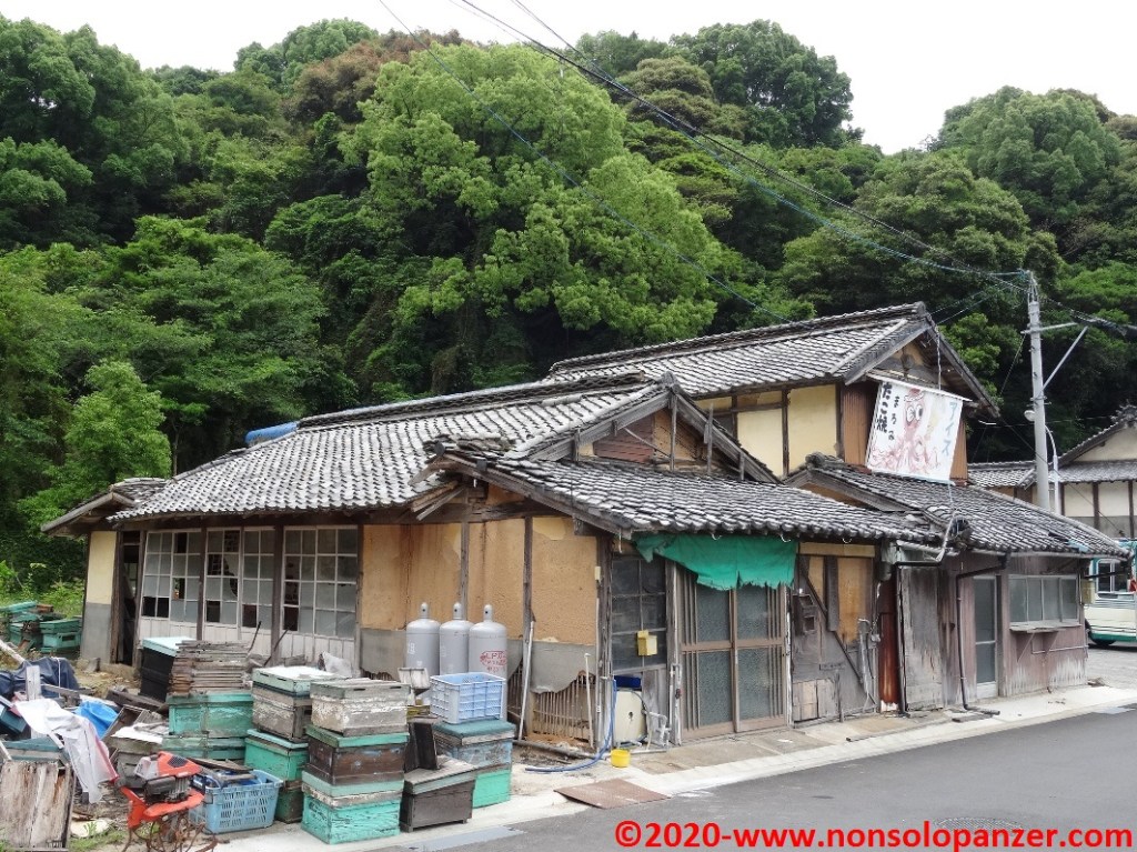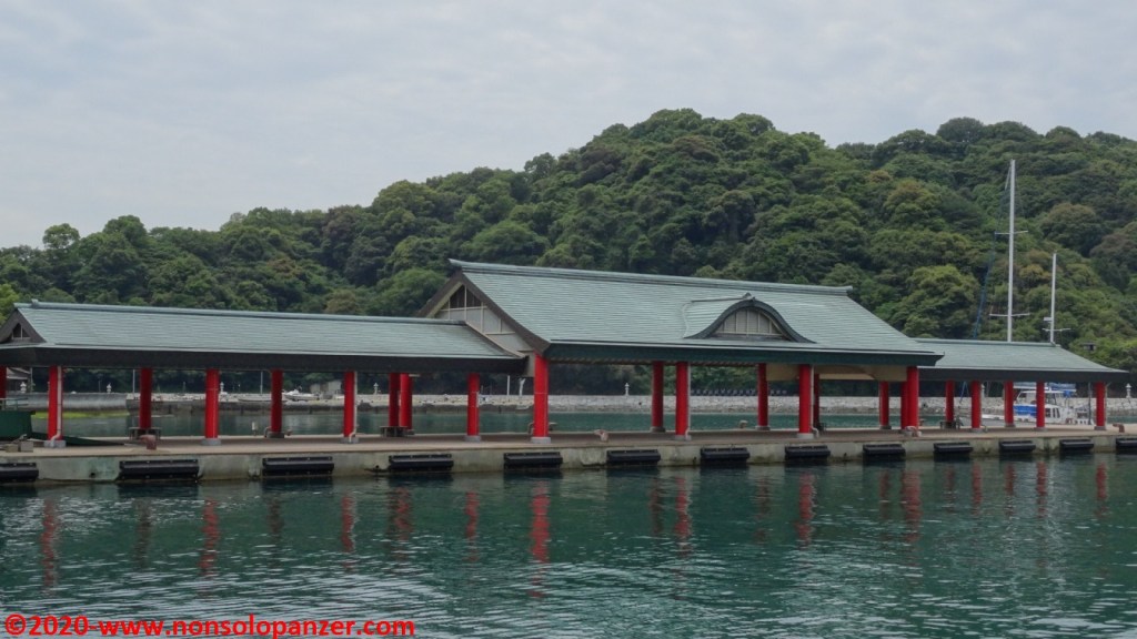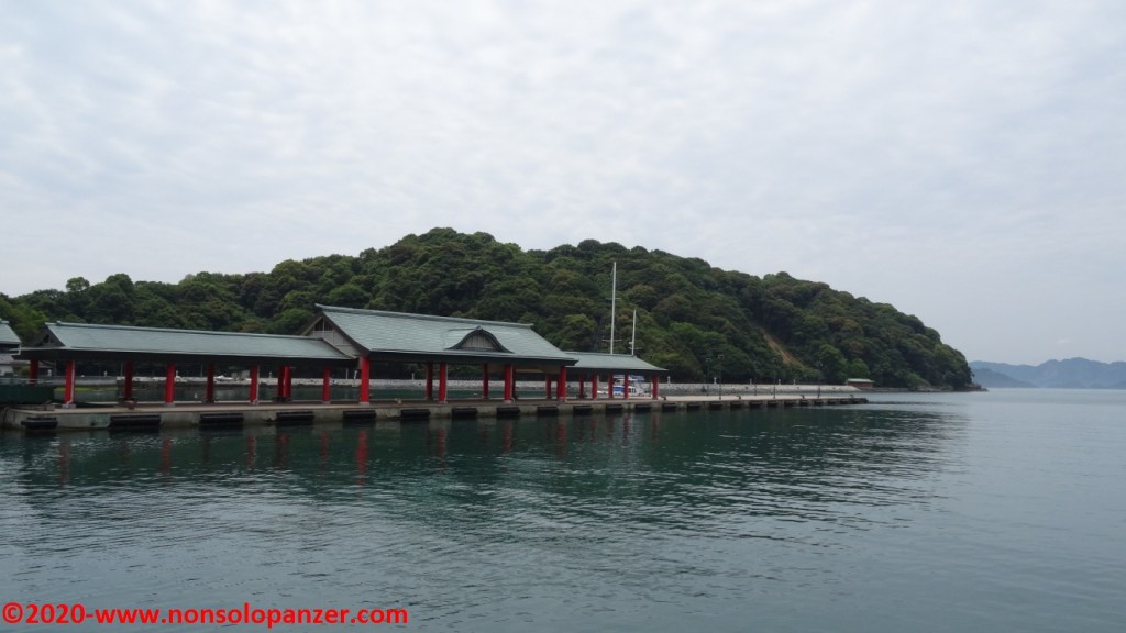 Inforcata di nuovo la bici, sono arrivato al porto di Miyaura la cui originale banchina di attracco intende evidentemente richiamare lo stile ed i colori delle caratteristiche porte d’ingresso ai templi shintoisti. Immagino che lo scopo sia quello di accogliere in modo consono i visitatori via mare del vicino tempio di Oyamazumi. Per il resto Miyaura non offre particolari attrattive, il paesino sonnecchia pacifico al centro di un’insenatura che ha certamente favorito i trasporti marittimi passati, ciononostante piccole perle si nascondono dove meno te le aspetti come dimostreranno le righe seguenti.