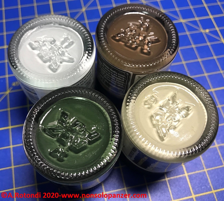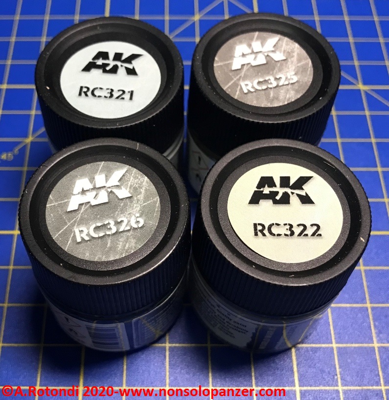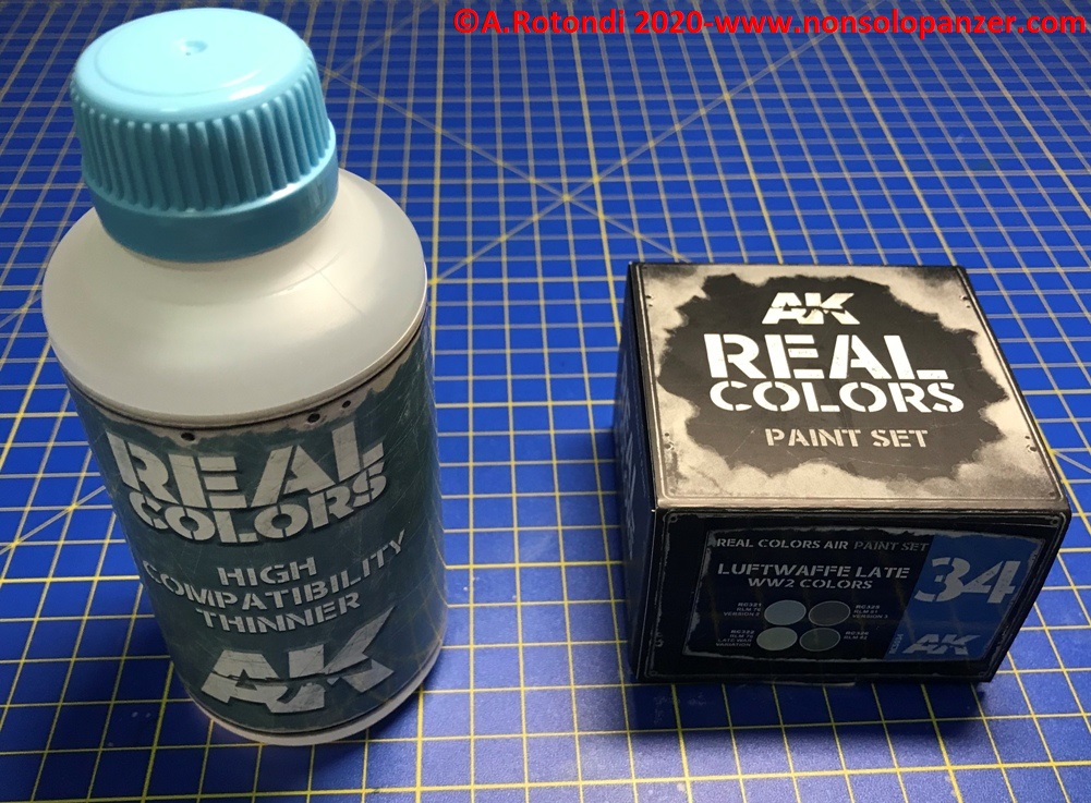 Non avendo precedenti esperienze significative nella costruzione di aerei della Luftwaffe, ho bypassato gli inevitabili problemi inerenti la scelta dei colori corretti procurandomi il set n. 34 “Luftwaffe Late WW2 Colors” (e relativo diluente) della serie Real Colors della AK Interactive. Si tratta di una recentissima linea di colori a base di acetone che ha goduto di una forte promozione pubblicitaria nel settore e che ha, in linea generale, buone recensioni. Non ho nulla da aggiungere a quanto già facilmente disponibili su Internet. Mi permetto solo di confermare l’ottima qualità dei colori in oggetto con una resa finale all’altezza delle aspettative.