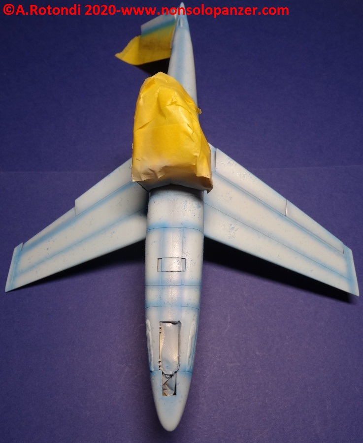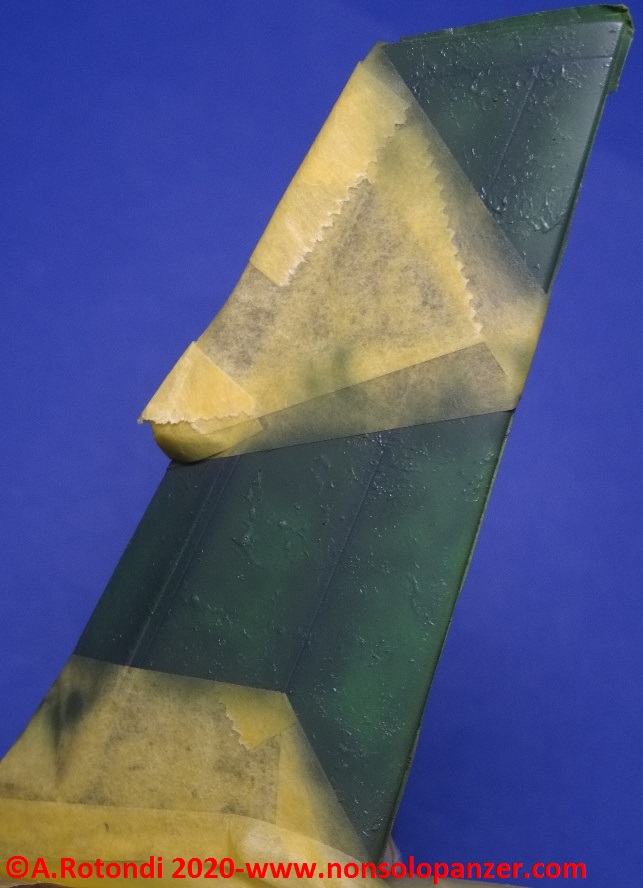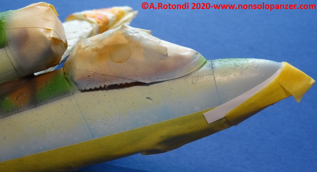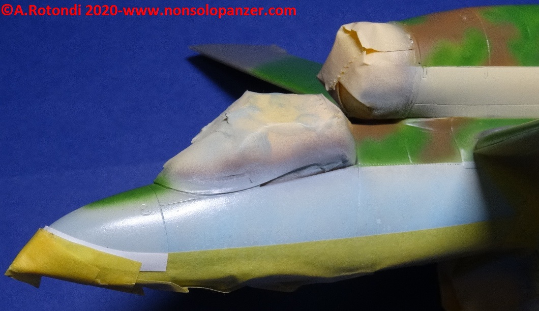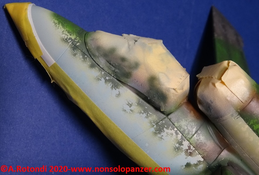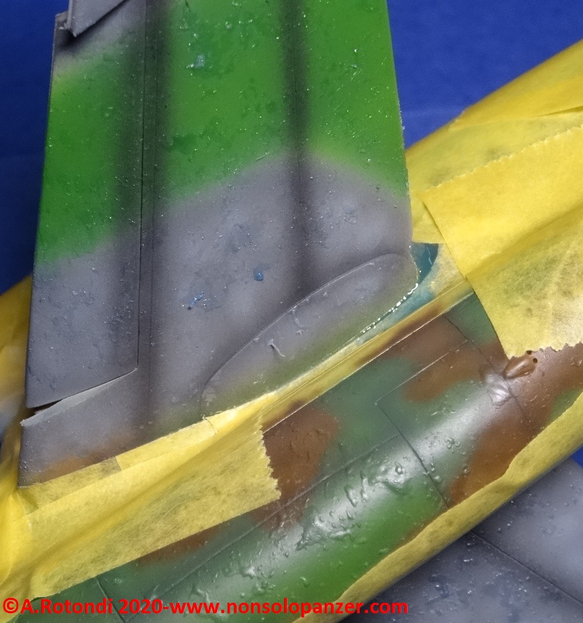 Giunto il momento di dedicarsi alle superfici superiori del caccia, ho, per prima cosa, protetto le parti inferiori in RLM76 con dello scotch a bassa adesività per poi spruzzare di nuovo il primer allo scopo di riottenere una superficie intonsa.