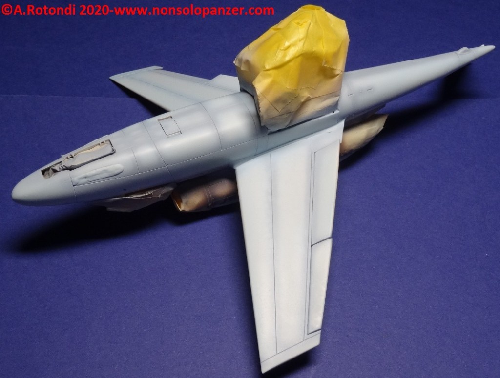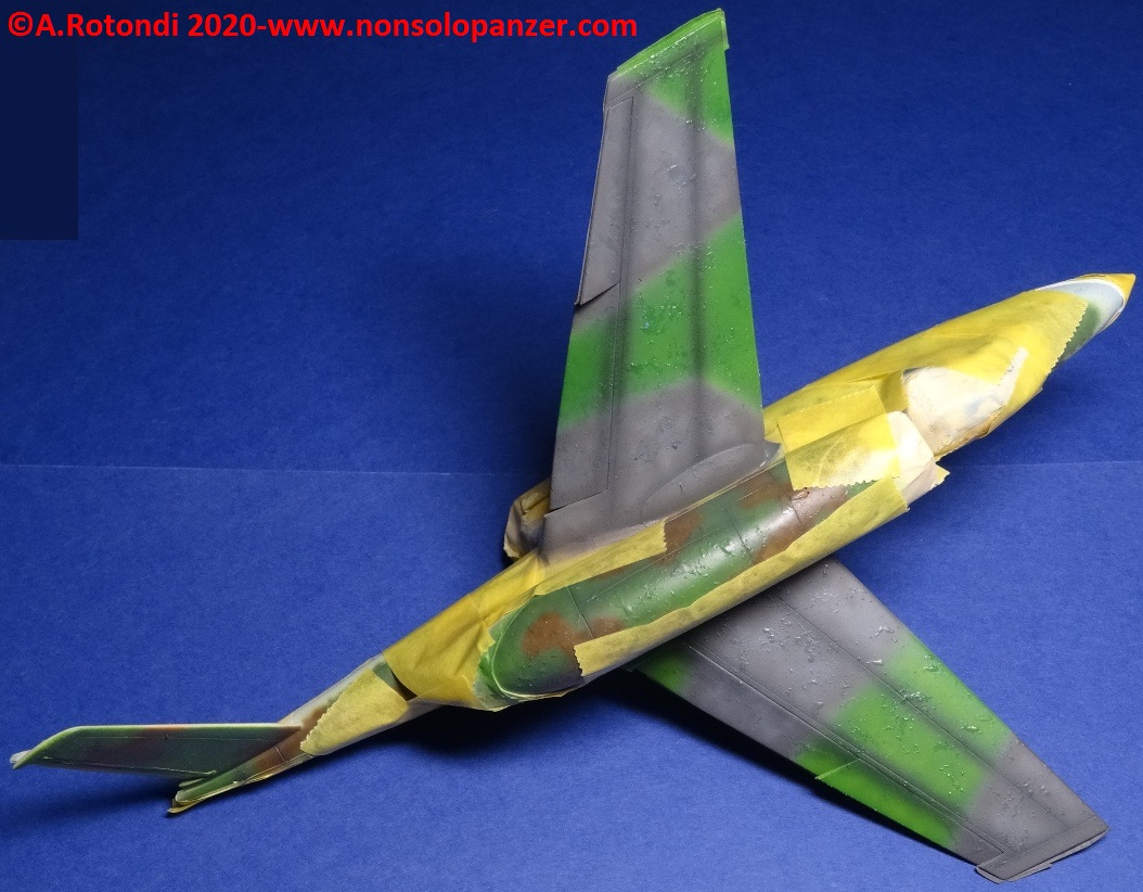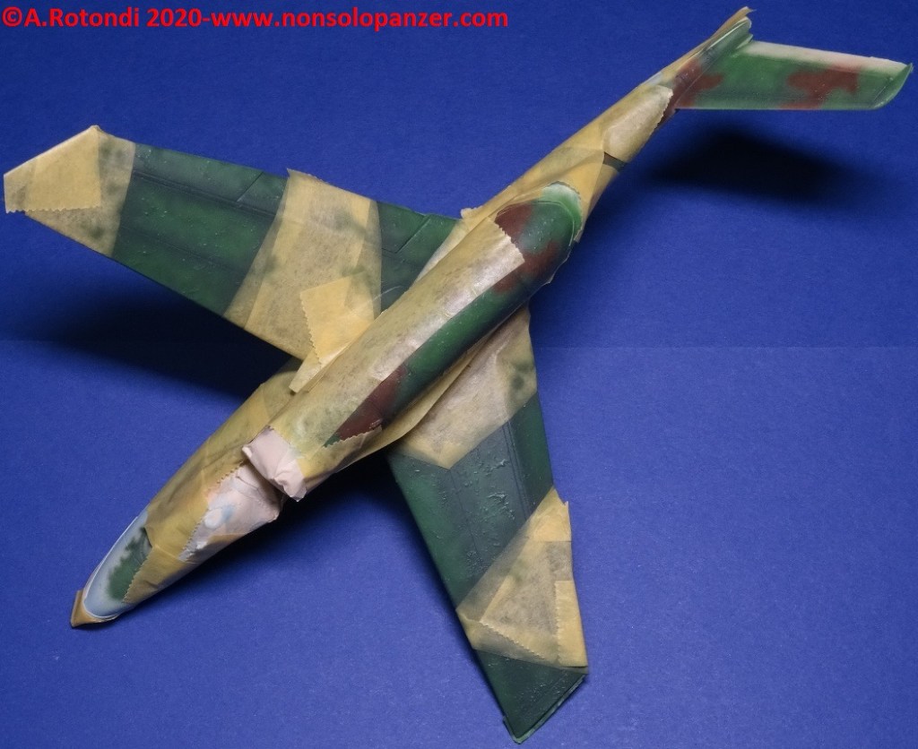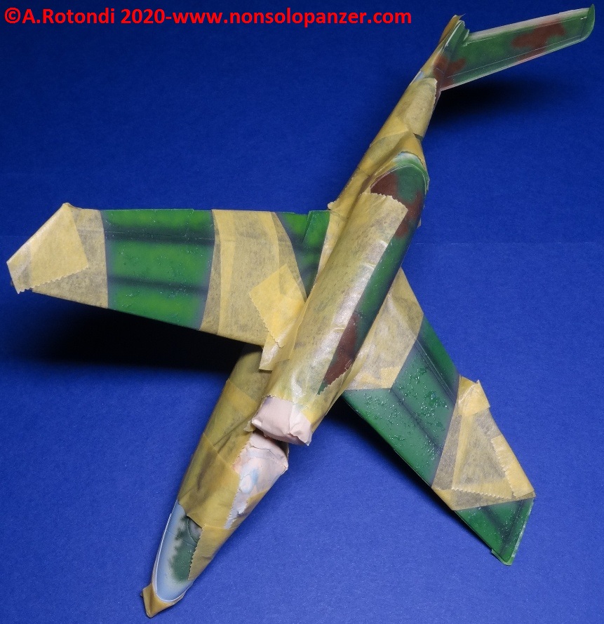 Giunto il momento di dedicarsi alle superfici superiori del caccia, ho, per prima cosa, protetto le parti inferiori in RLM76 con dello scotch a bassa adesività per poi spruzzare di nuovo il primer allo scopo di riottenere una superficie intonsa.