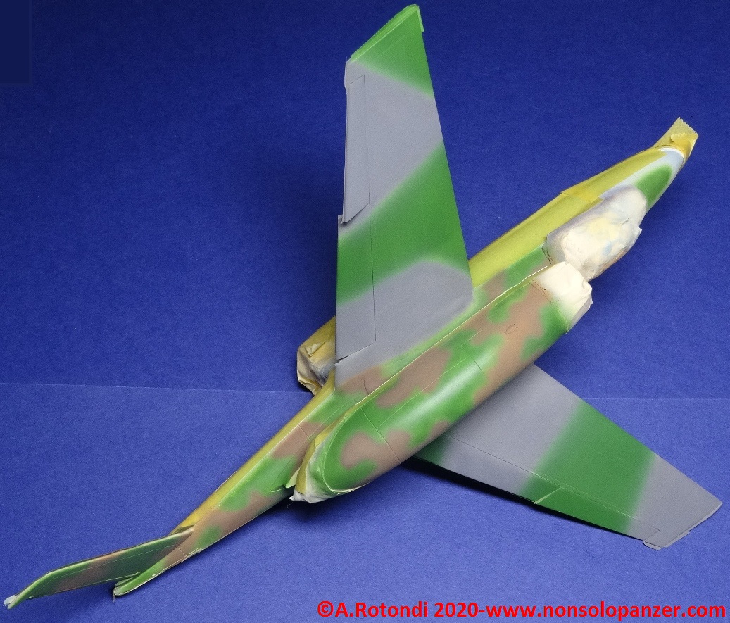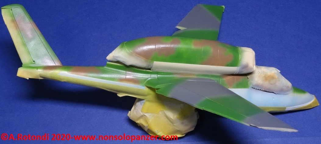 Mascherate le ali, ho steso l’RLM82 e l’RLM81, rispettivamente il verde ed il marrone Luftwaffe di fine guerra su tutto il caccia.