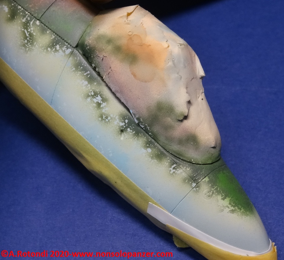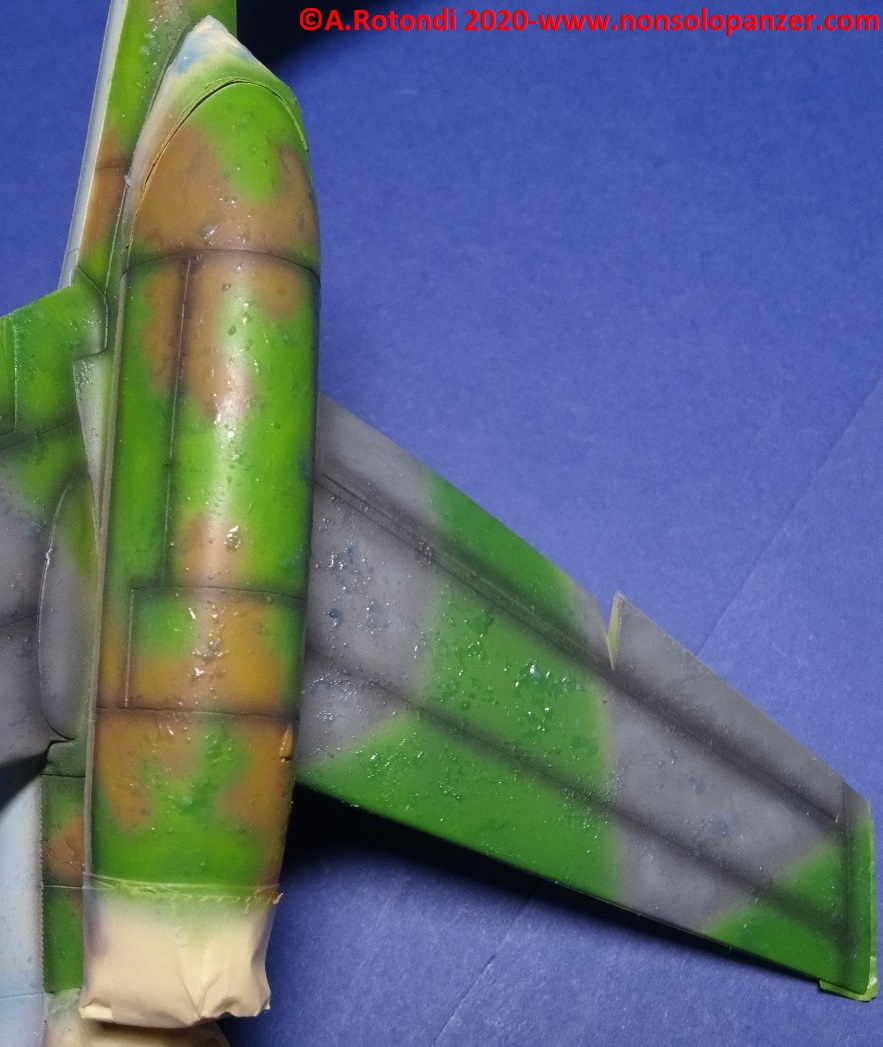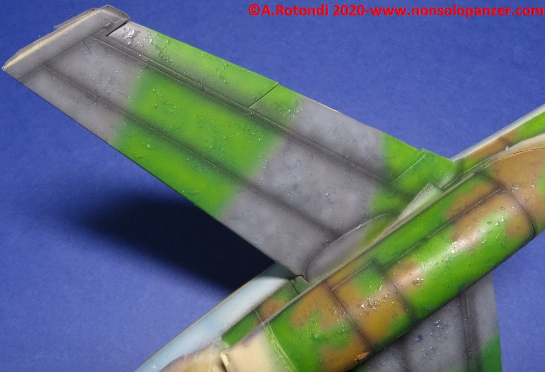 Giudicando l’esito promettente ma troppo accentuato, ho deciso di stendere di nuovo l’RLM82 e l’RLM81 in veli molto diluiti allo scopo di smorzare ma non cancellare l’effetto di “peeling” precedentemente ottenuto. Il risultato di questo secondo passaggio ha, a mio parere, dato ottimi frutti.