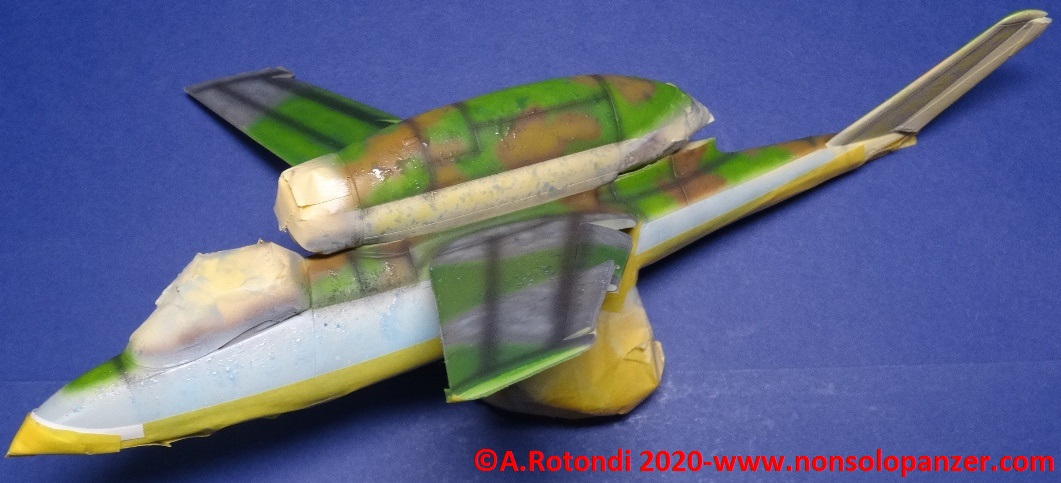 A questo punto ho ripassato le pannellature e incrementato le sfumature del disegno mimetico base con veli di giallo (su verde e marrone) e bianco (su grigio).