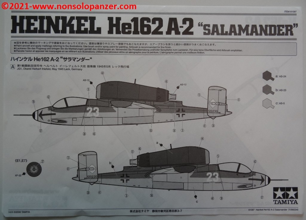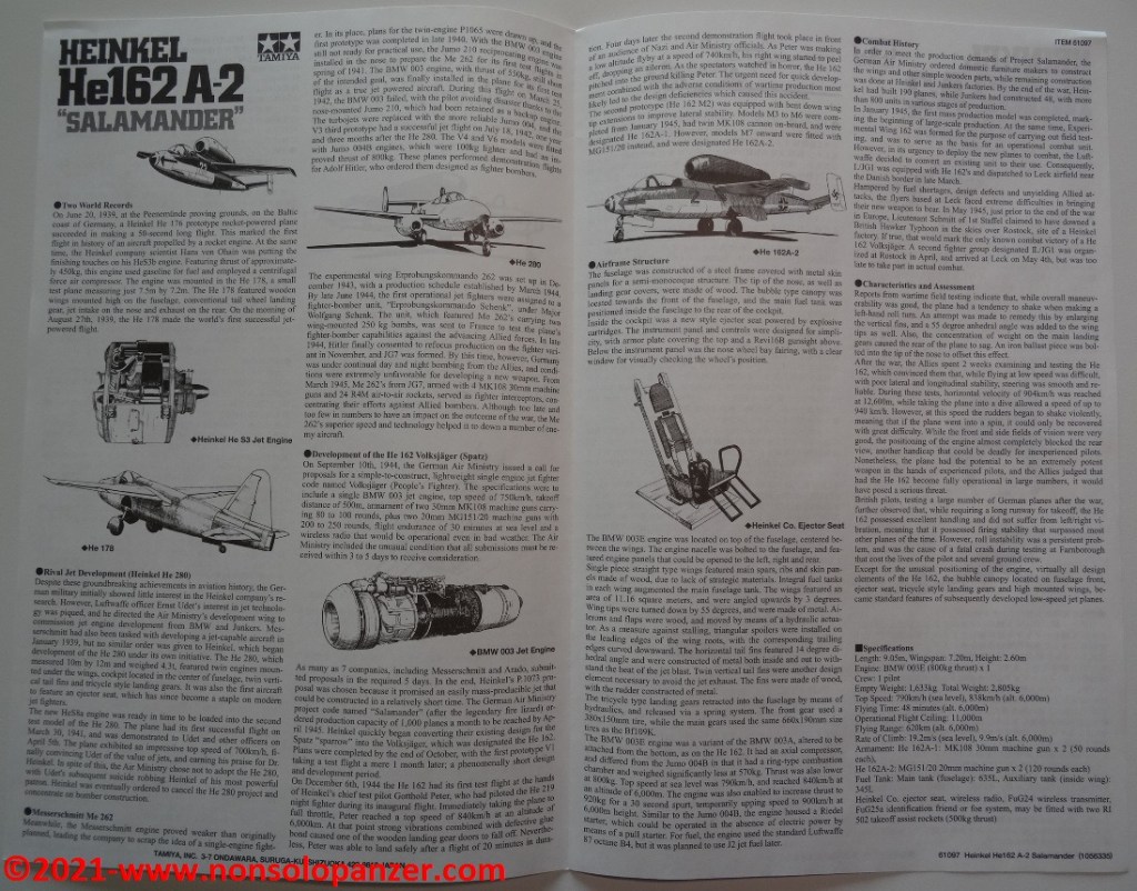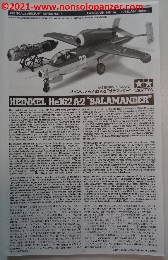 Il mio interesse per il caccia He-162 A “Spatz” è facilmente dimostrato dal fatto che proprio in questo periodo sto realizzando il modello in scala 1/48 della versione D oggetto del kit commercializzato da Dragon Models Ltd. Se ciò non bastasse, posso vantare anche il possesso della scatola di montaggio dell’He-162 A di Tamiya Inc., anch’esso in scala 1/48.