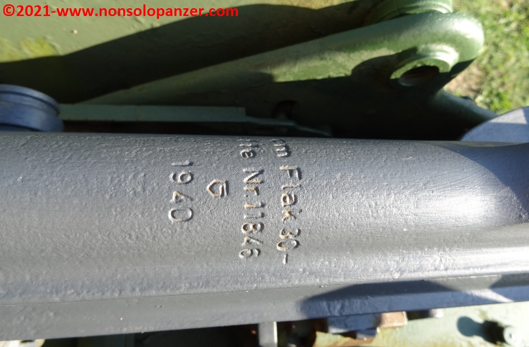 La 2cm Flak-30 del Museo Storico Militare delle “Alpi Giulie“ avrebbe probabilmente molto da raccontare sulla sua storia. Difficile dire quale sia la sua origine e come sia finita nella collezione di tale museo. Ciò detto, questo esemplare di Flak-30 è di una rarità non indifferente e si presenta in buono stato seppur manchino alcuni componenti, primo fra tutti il mirino. Durante la mia visita ho scattato molte foto a quest’arma non solo per fornire la miglior testimonianza possibile ad appassionati e modellisti ma anche allo scopo di evidenziare come siano presenti, tanto sull’arma quanto sul relativo carrello, un’ampia serie di marchi, date ed indicazioni che, a mio parere, impreziosiscono il valore storico di questo residuato bellico.