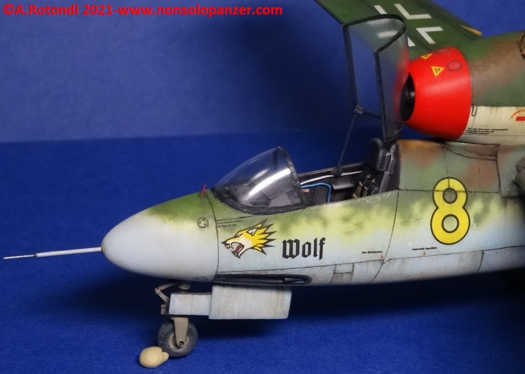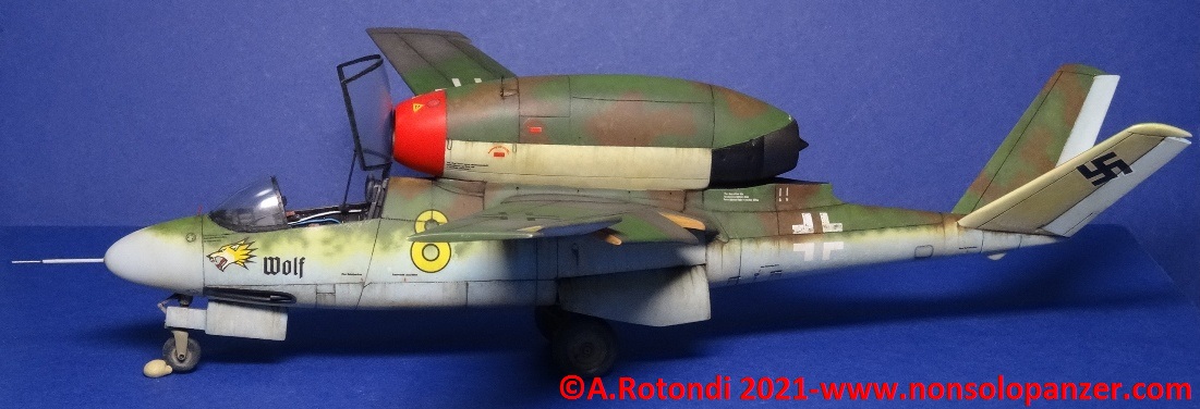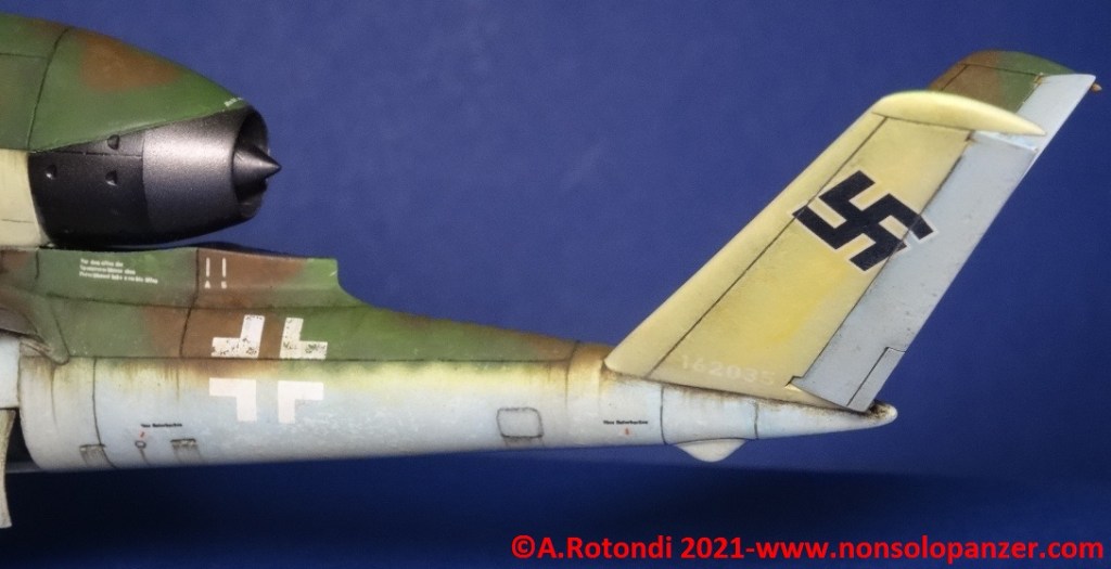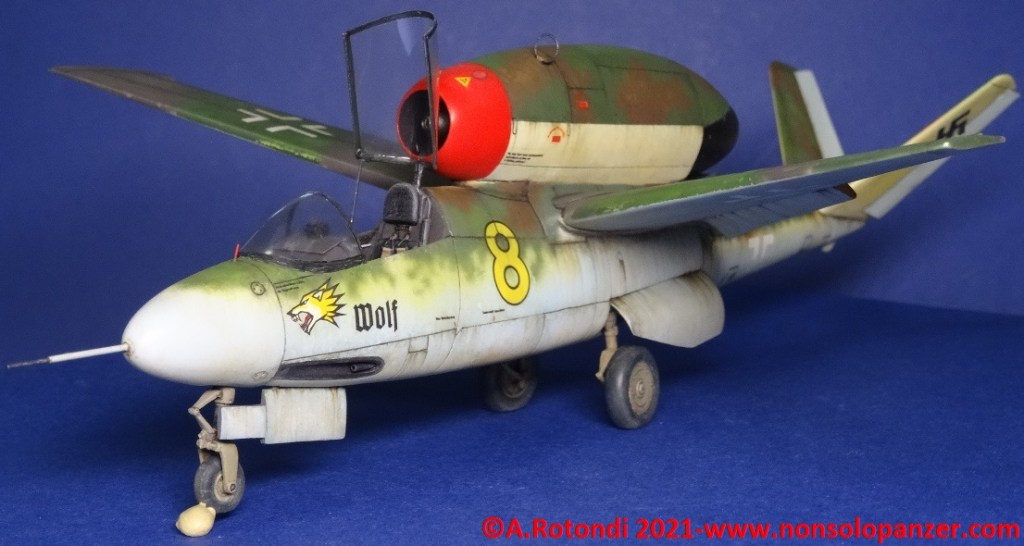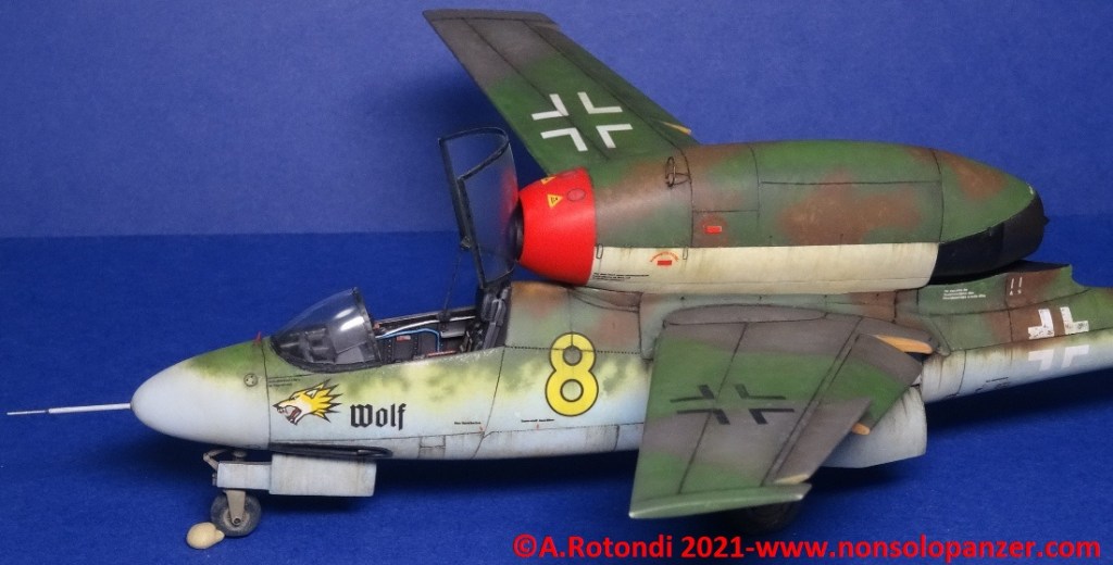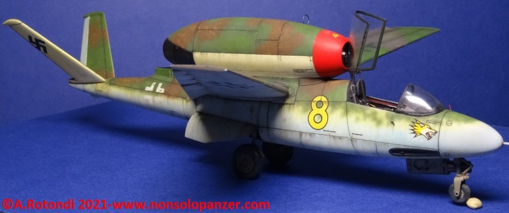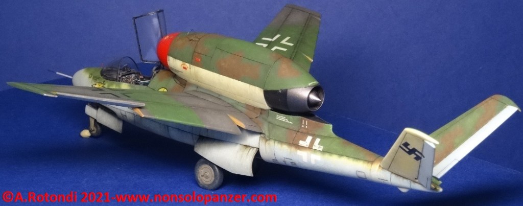 After many articles dedicated to the various stages of construction of my He-162 D, I finally show the fighter completed in all its parts. To my great joy, the matte cover did not give me any problems and made fully visible the weathering done on the model. I am always anxious when it comes time to airbrush the opaque cover because of unpleasant past experiences but, treasuring the previous traumas, everything went well and I am very satisfied with the final result that I show below.