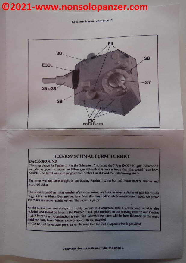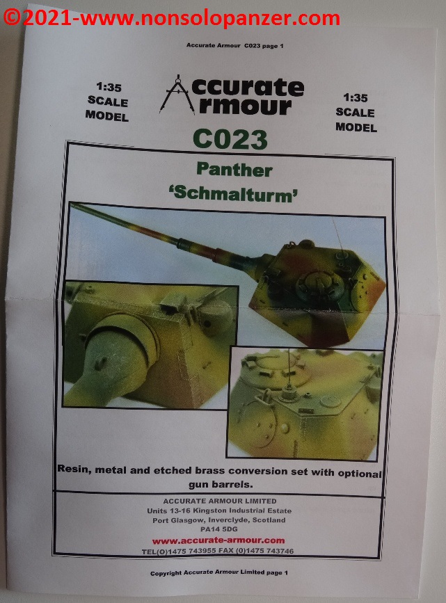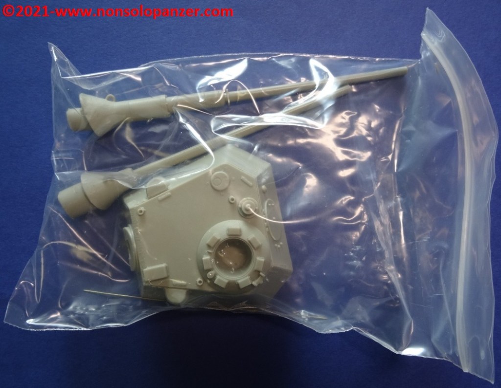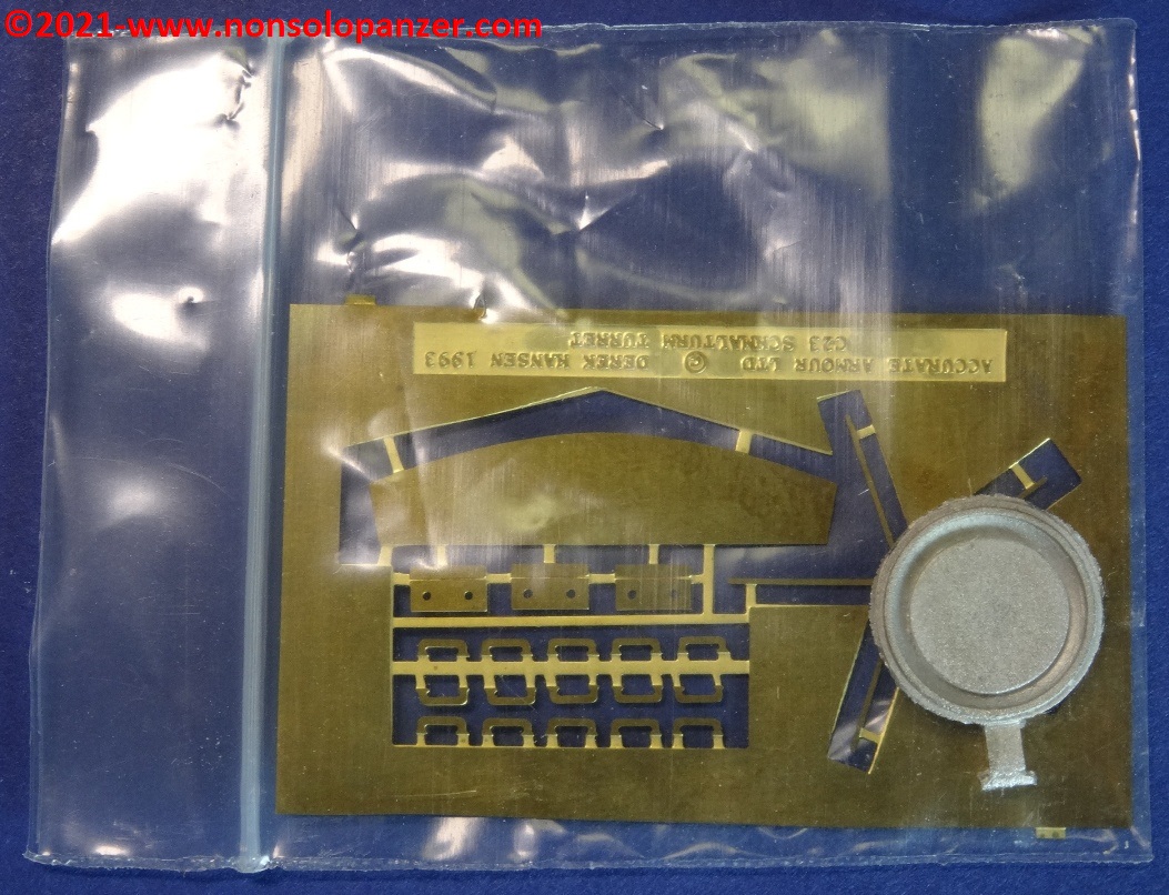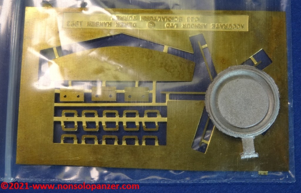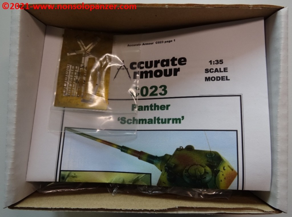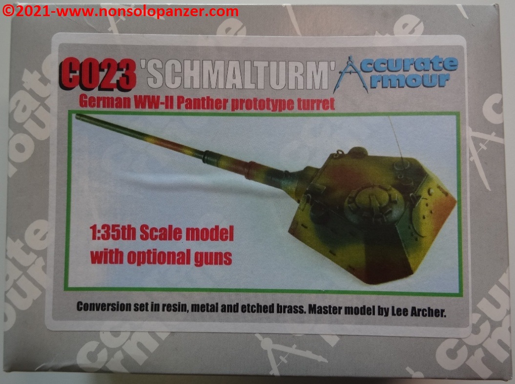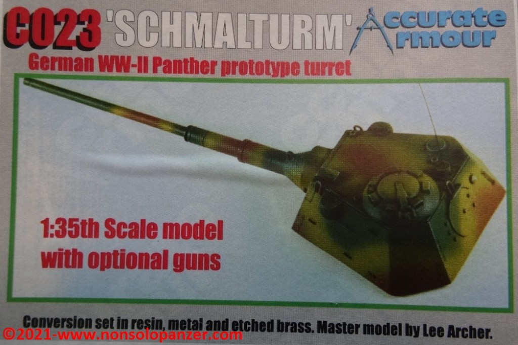 Nel mondo del modellismo militare, la “Schmalturm” è spesso abbinata non solo al “Panther” Ausf. F. ma anche al “Panther II” ed all’E-50. Senza voler dissertare sulla correttezza di tali accostamenti, è importante segnalare che fino a pochi anni fa i modelli dedicati ai progetti di Panzer erano rarissimi ed il modo più efficace per procurarsi soggetti come la “Schmalturm” era rivolgersi al mercato delle conversioni in resina. Accurate Armour era una delle case più attive nel proporre kit di soggetti inusuali e quello oggetto di questo articolo rientra a pieno titolo in tale categoria. Il set contiene la torretta in un unico pezzo in resina, due cannoni opzionali (da 7.5cm e 8.8cm), il portello in metallo della cupola del capocarro ed alcune fotoincisioni. Queste ultime sono particolarmente spesse e di non facile manipolazione mentre dei due cannoni opzionali sono utilizzabili solo i mantelli corazzati; è preferibile, infatti, sostituire le canne con riproduzioni in metallo tornito. Segnalo altresì che è assai discutibile che un KwK-43 da 8.8cm potesse equipaggiare il modello di “Schmalturm” proposto dal kit della Accurate Armour. Gli spazi interni erano sicuramente troppo piccoli per poter accogliere un tale cannone ed il suo arco di rinculo.