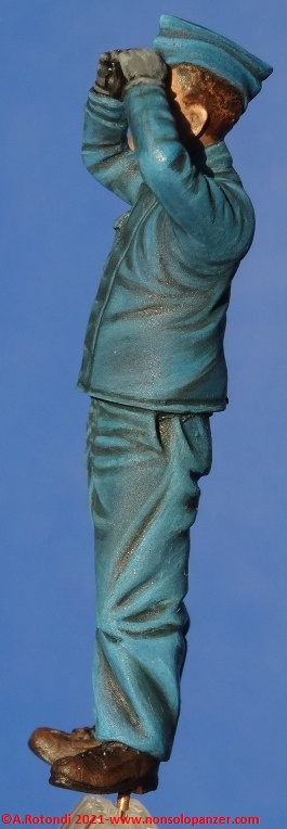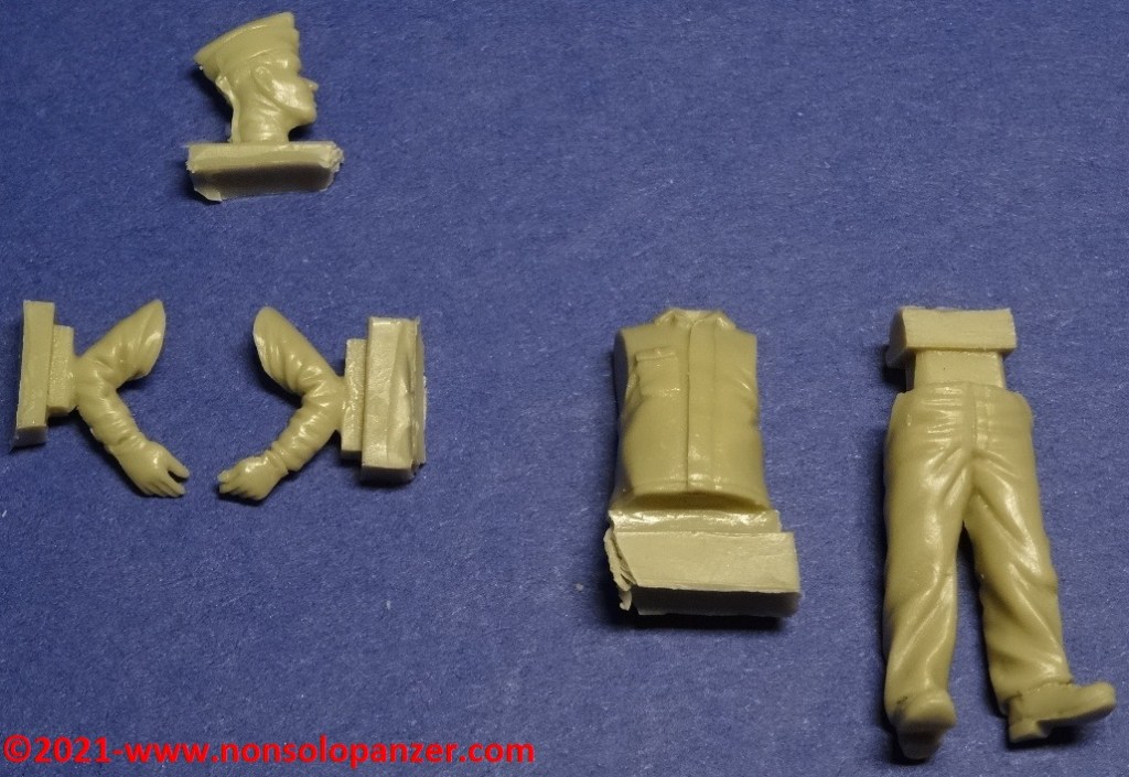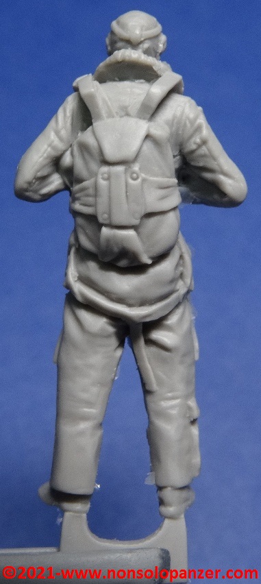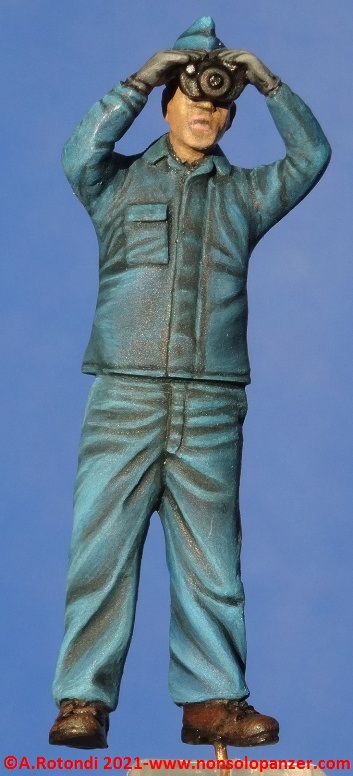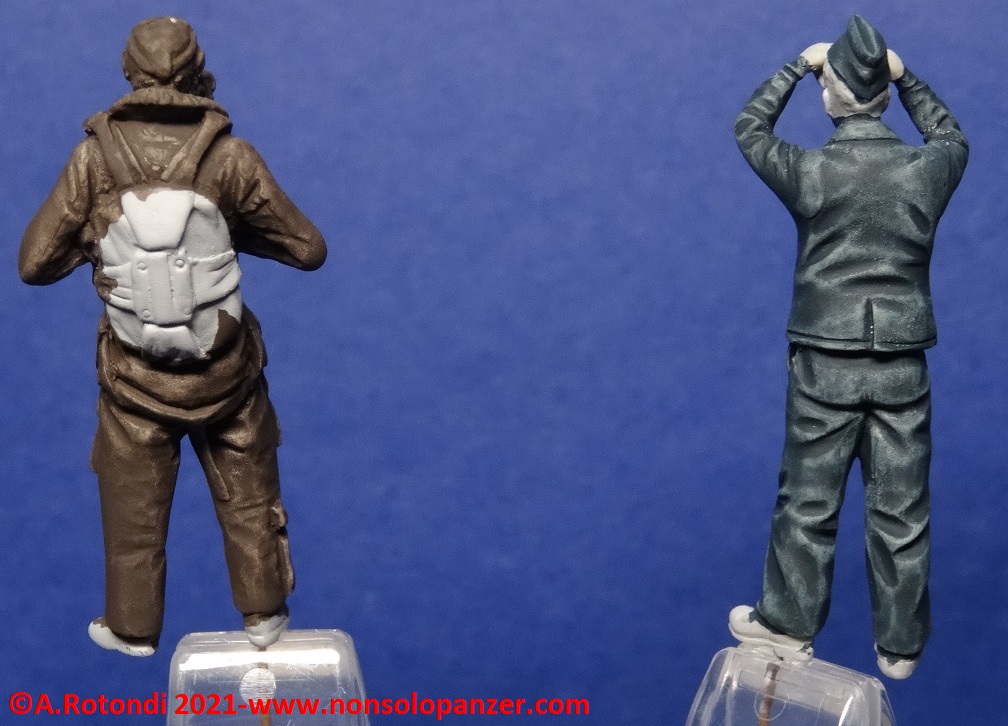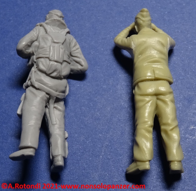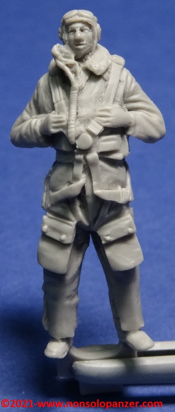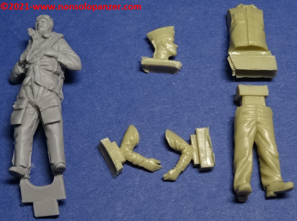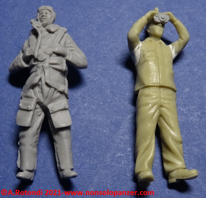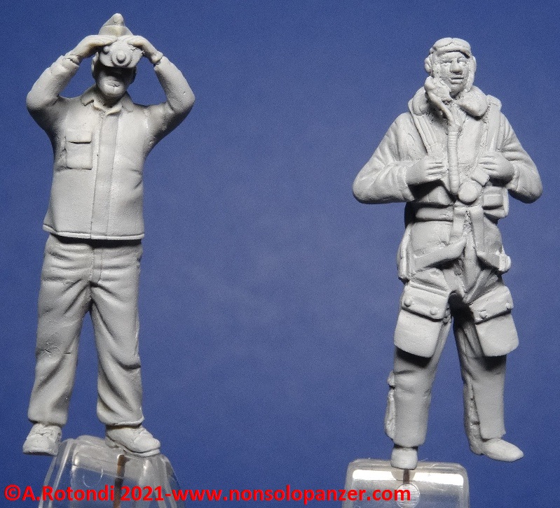 Grazie ad una posa già di per sé ideale allo scopo, ho utilizzato il pilota esattamente come commercializzato da Zoukei-Mura. Al contrario, ho dovuto leggermente modificare il meccanico così da posizionare la braccia in modo che tenere davanti agli occhi una macchina fotografica recuperata da vecchi pezzi di scarto. Nonostante i due figurini siano stati scolpiti a trent’anni di distanza uno dall’altro, non si notano grandi differenze fra di loro. Ho particolarmente apprezzato il fatto che entrambi i soggetti abbiamo esattamente la stessa altezza, dimostrazione di come gli scultori abbiano rispettato la scala di riferimento. Rispetto al meccanico che veste una semplice tuta da lavoro, il pilota gode di un ottimo dettaglio di tutto l’equipaggiamento di volo ma, a mio parere, è dotato di una testa leggermente troppo piccola.
