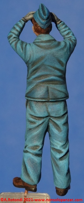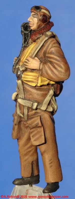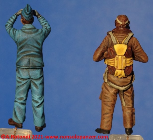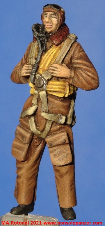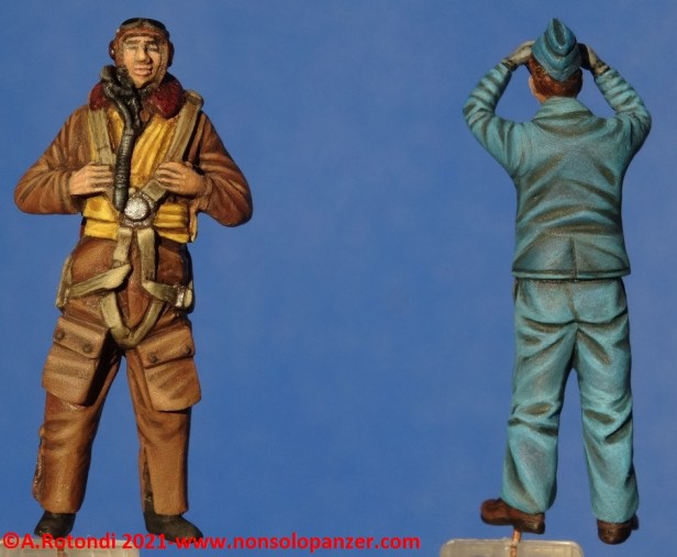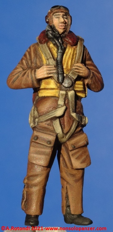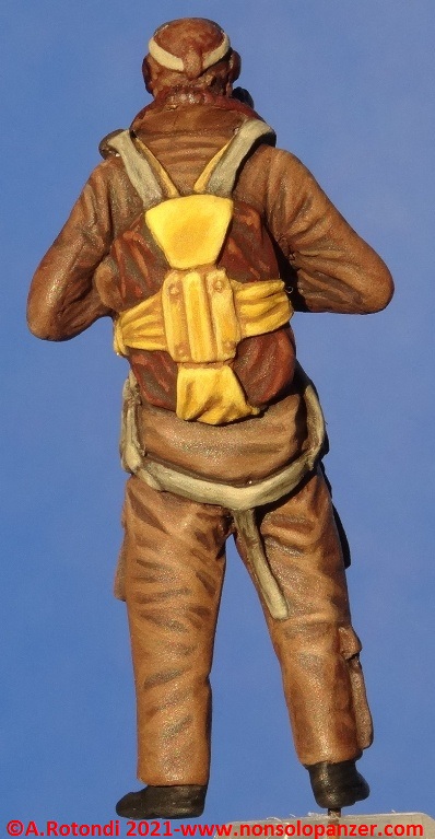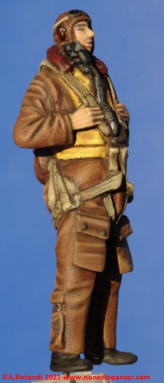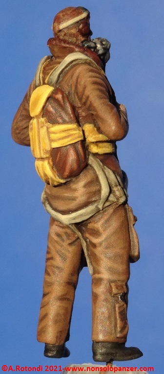 Per quanto concerne la pittura dei due soggetti, il meccanico indossa la tipica tutta da lavoro blu della Luftwaffe; più complesso è certamente l’abbigliamento e l’equipaggiamento del pilota. Facendo una ricerca su Internet e chiedendo aiuto nei gruppi Facebook specializzati, ho accertato che il figurino indossa una tuta di volo nel 1945 realizzata interamente in cuoio e confezionata in tre colori: pelle naturale, grigio e nero. Ho optato per la pelle naturale. Per i colori dell’equipaggiamento di volo ho utilizzato le seguenti referenze fotografiche. Non essendo un esperto della Luftwaffe, non escludo di aver commesso errori ma il risultato finale dovrebbe avere una buona aderenza storica.