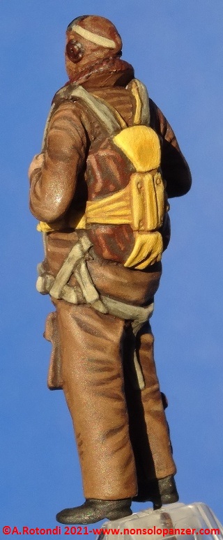 As far as the painting, the mechanic wears the typical Luftwaffe blue suit; the clothing and equipment of the pilot is certainly more complex. By doing a search on the Internet and asking for help in specialized Facebook groups, I ascertained that the pilot wears a 1945’s flight suit made entirely of leather and manufactured in three colors: natural leather, grey and black. I opted for natural leather. For the colors of the flight equipment I used the following photographic references. As I am not an expert on Luftwaffe, I do not exclude that I have made mistakes, but the end result should have a good historical fit.