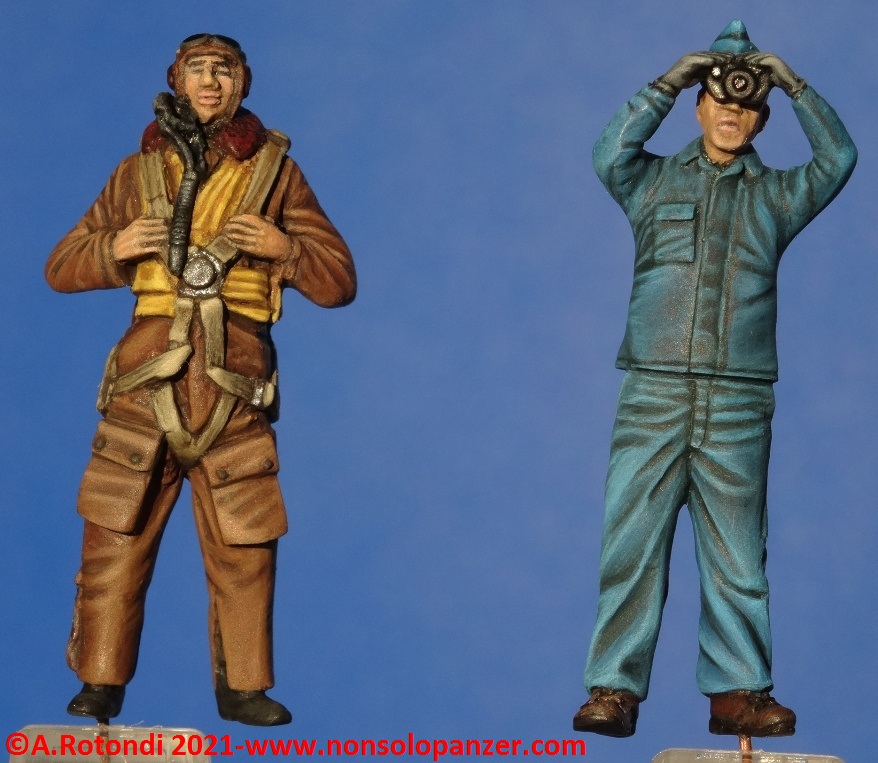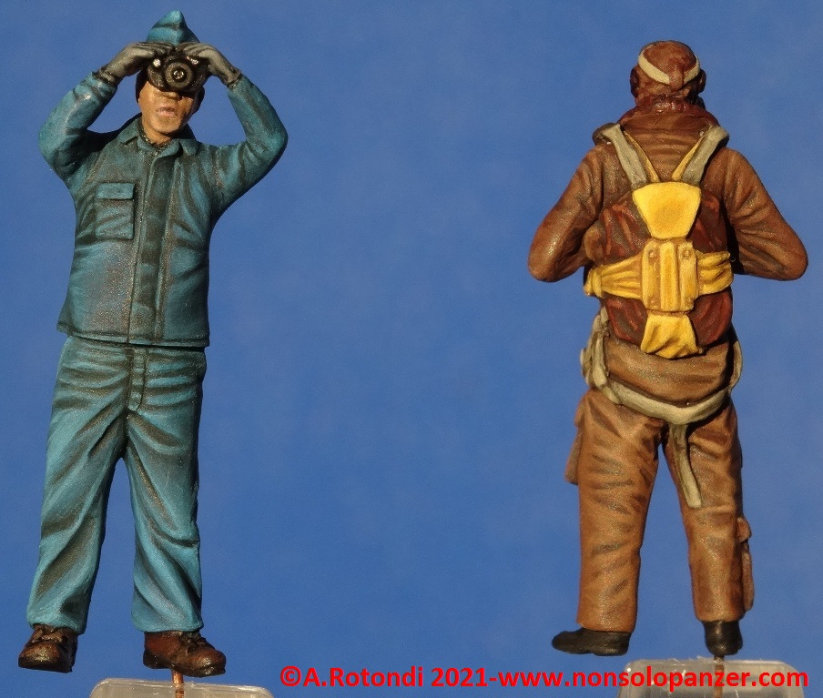 Grazie ad una posa già di per sé ideale allo scopo, ho utilizzato il pilota esattamente come commercializzato da Zoukei-Mura. Al contrario, ho dovuto leggermente modificare il meccanico così da posizionare la braccia in modo che tenere davanti agli occhi una macchina fotografica recuperata da vecchi pezzi di scarto. Nonostante i due figurini siano stati scolpiti a trent’anni di distanza uno dall’altro, non si notano grandi differenze fra di loro. Ho particolarmente apprezzato il fatto che entrambi i soggetti abbiamo esattamente la stessa altezza, dimostrazione di come gli scultori abbiano rispettato la scala di riferimento. Rispetto al meccanico che veste una semplice tuta da lavoro, il pilota gode di un ottimo dettaglio di tutto l’equipaggiamento di volo ma, a mio parere, è dotato di una testa leggermente troppo piccola.