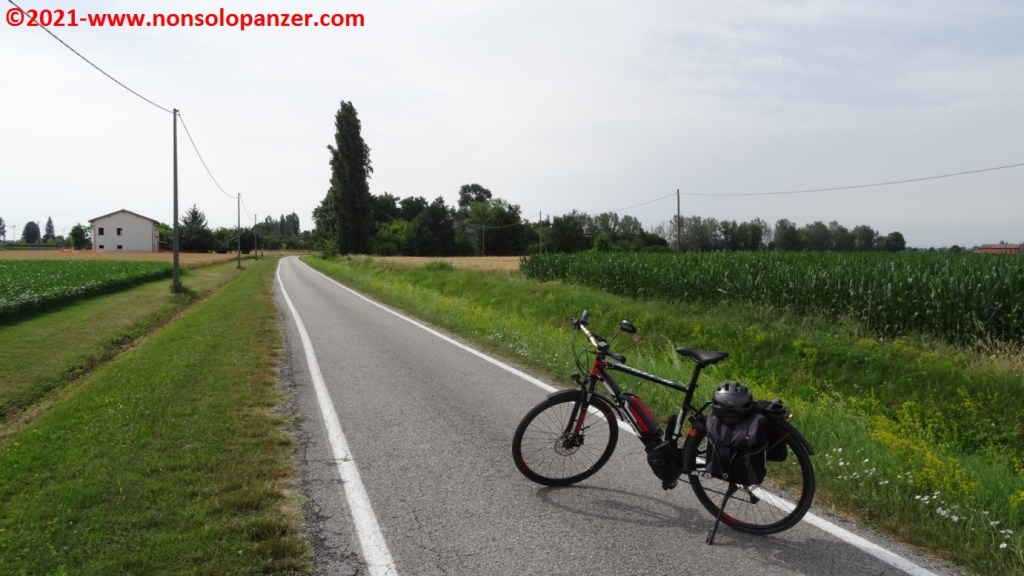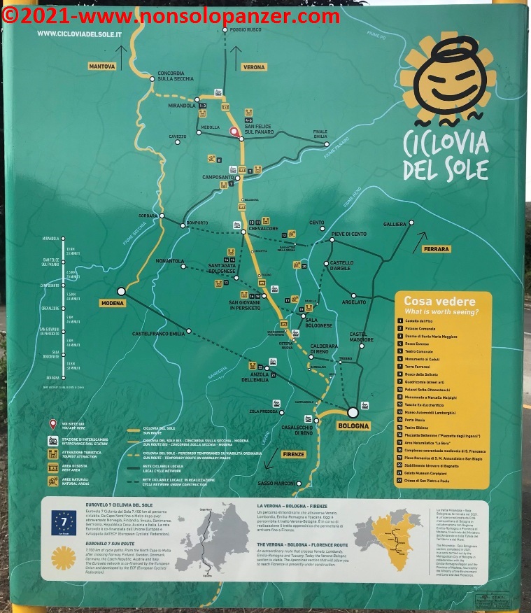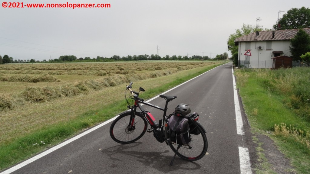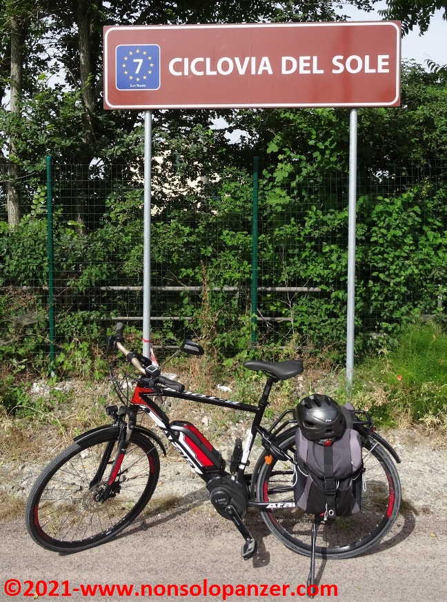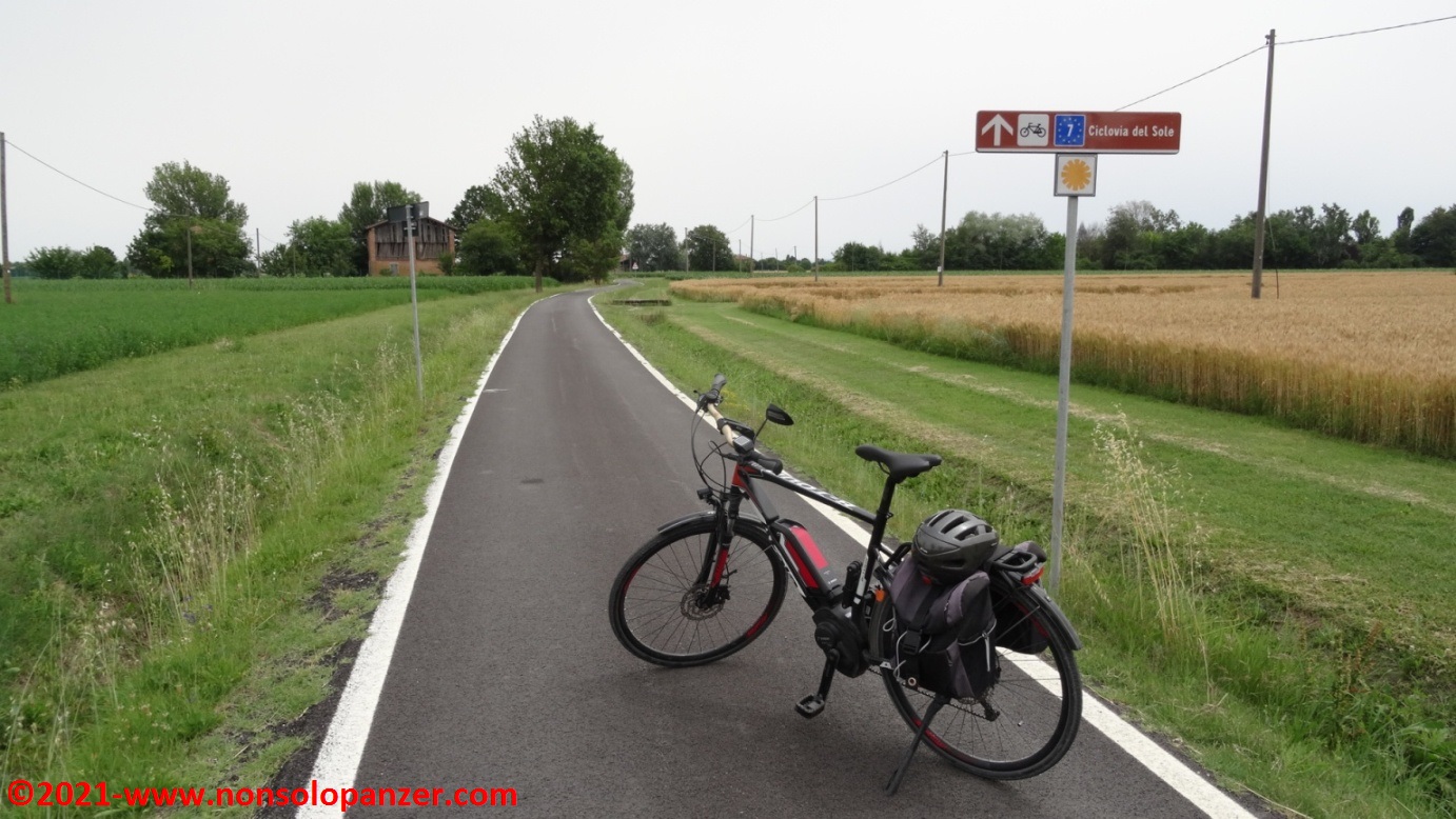 Grazie ad alcuni articoli apparsi sui giornali e sui canali online, sono venuto a sapere della recente inaugurazione della “Ciclovia del Sole” nel tratto da Mirandola ad Osteria Nuova, distante pochi chilometri da Bologna. La “Ciclovia del Sole” è un grande progetto europeo che ha come obiettivo la realizzazione di una pista ciclabile che, tagliando verticalmente l’intera Europa, congiungerà Capo Nord con il Sud Italia. In attesa del suo completamento, non mi sono fatto sfuggire l’occasione di percorrerne il nuovo tratto emiliano. Partito il venerdì 18 giugno con la mia fedele Fiat 500 equipaggiata di portabici personalizzato, ho raggiunto Mirandola in serata ed ho inforcato la bicicletta la mattina successiva, sabato 19 giugno.