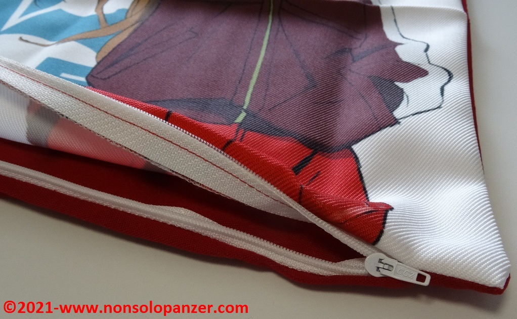 Nella confezione dello “Shikinami Asuka Langley Cushion Cover” è presenta la sola fodera. L’imbottitura deve essere acquistata a parte ma non si tratta di una difficoltà insormontabile. Per fortuna, le misure della fodera sono uno standard 45×45 centimetri. E’, quindi, sufficiente recarsi in un negozio di articoli casalinghi per trovare un’imbottitura adeguata ed ottenere il tanto agognato cuscino.