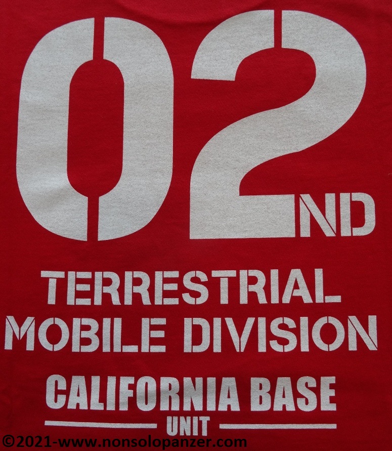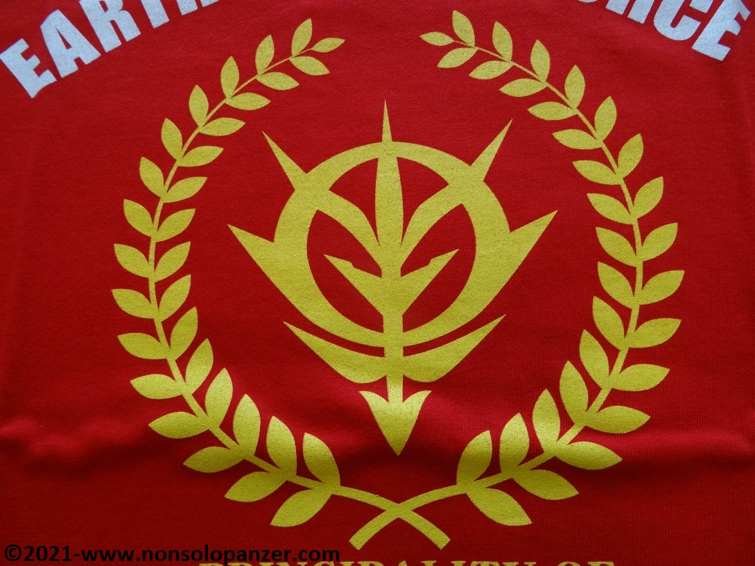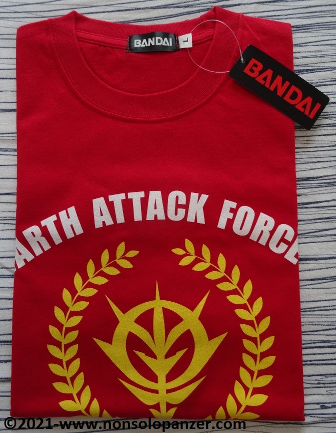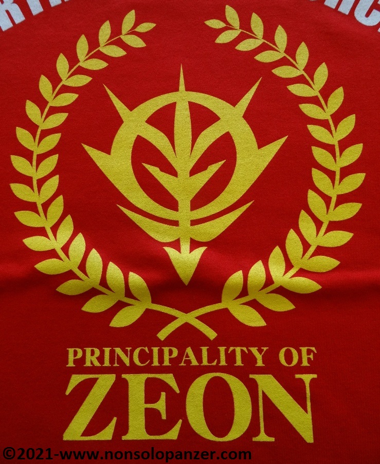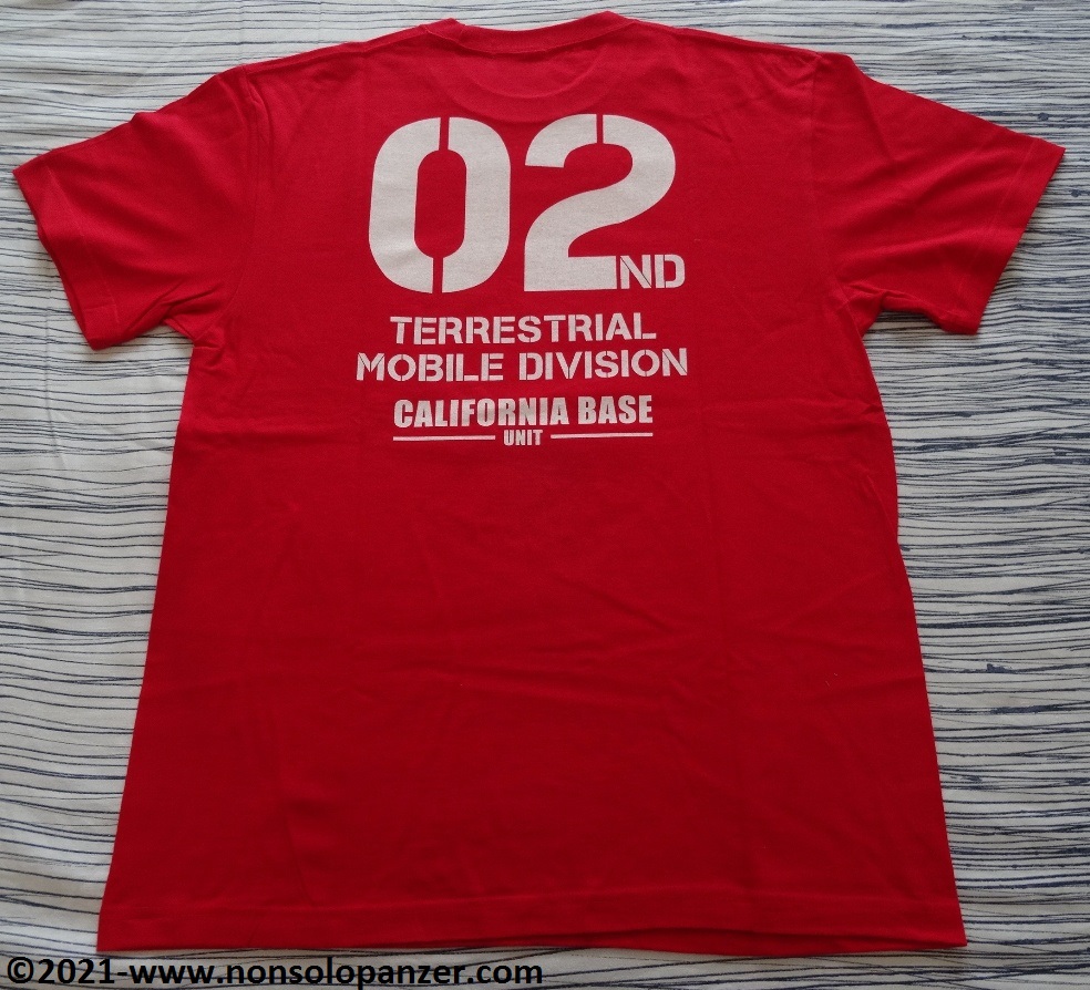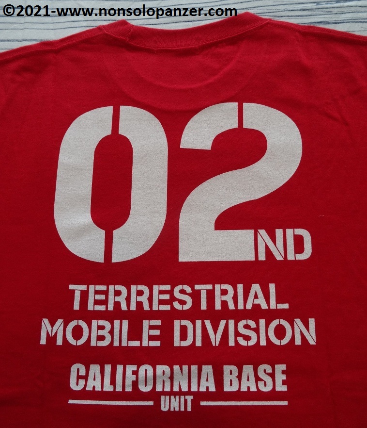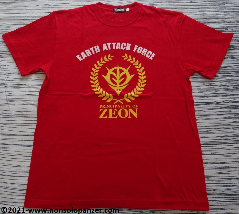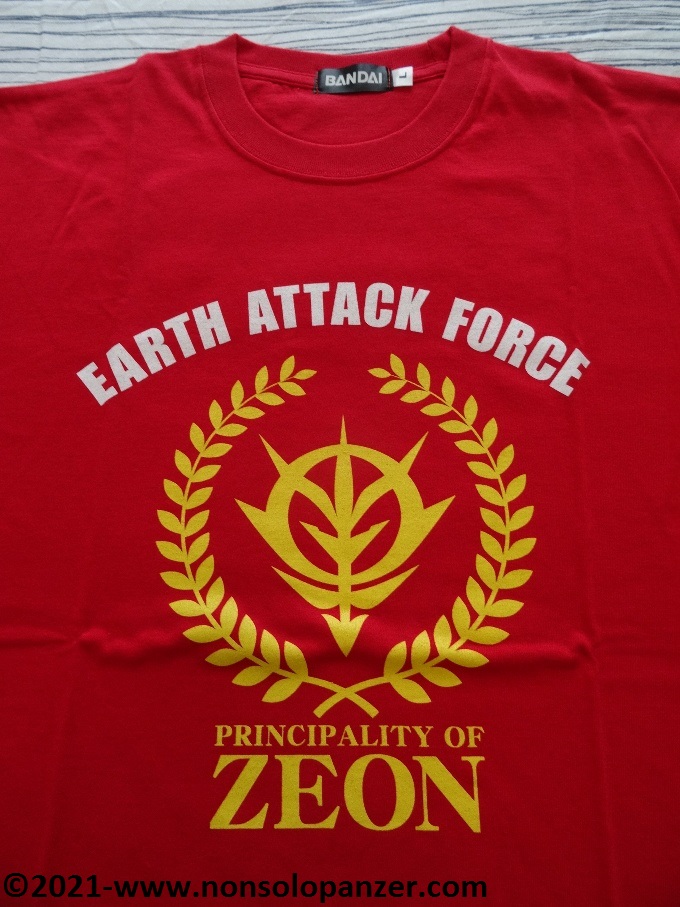 Acquistata sull’efficiente portale Hobby Link Japan, questa maglietta dal rosso brillante non si limita a riprodurre sul petto l’araldica del Principato di Zeon; il vero pregio della T-Shirt è sulla schiena dove sono riportati i riferimenti della seconda divisione mobile del EAF (Earth Attack Force), il corpo d’invasione della Terra.