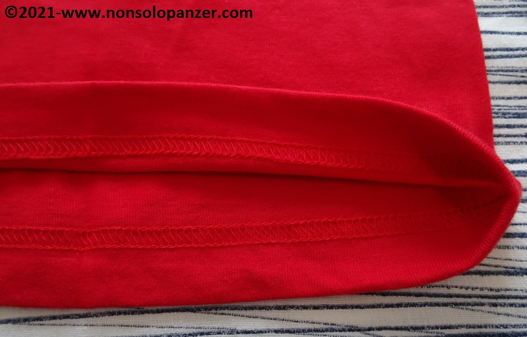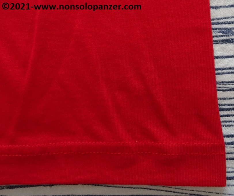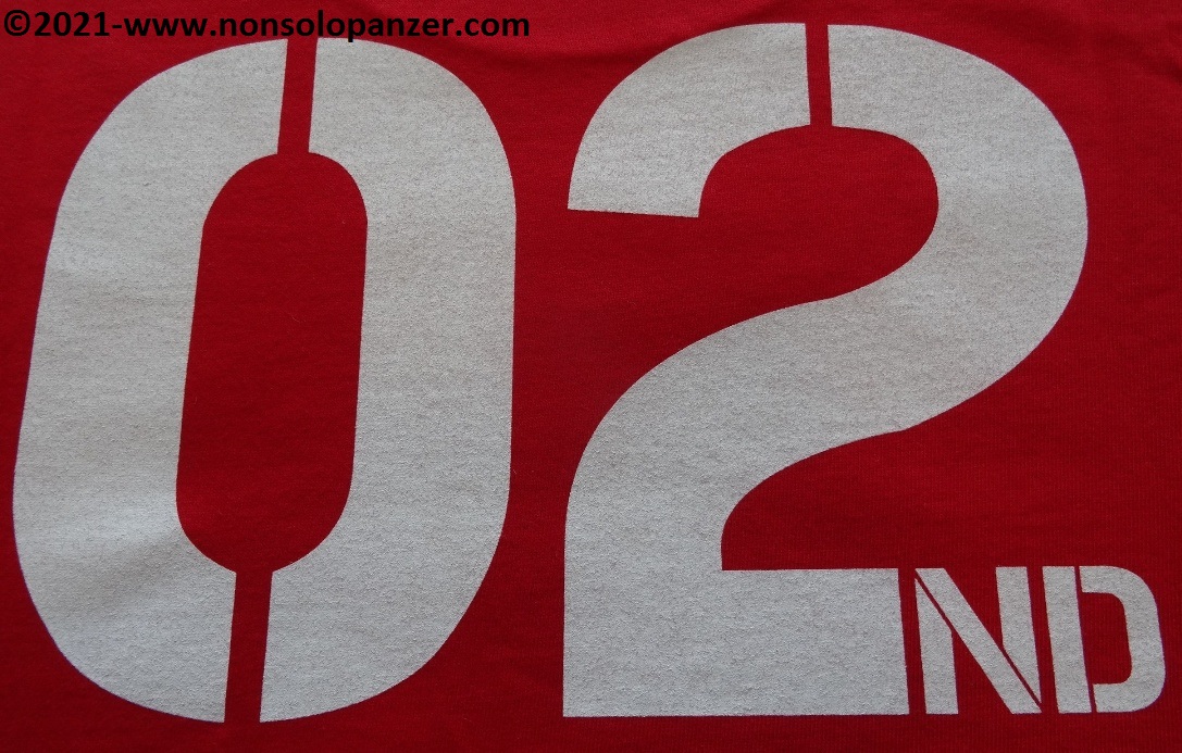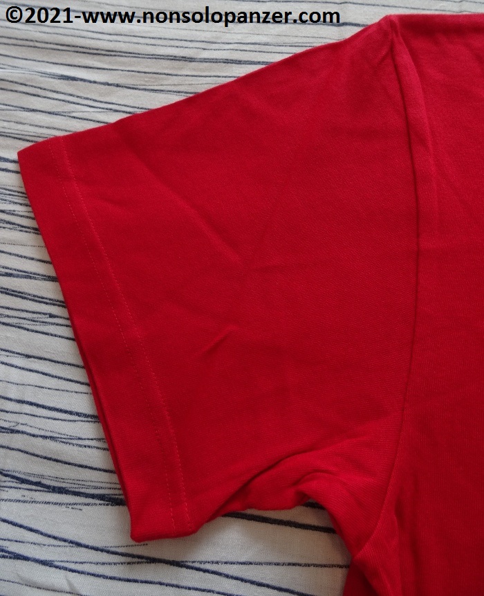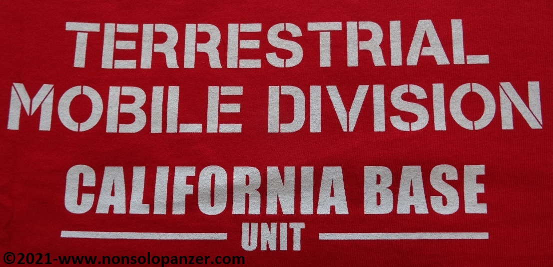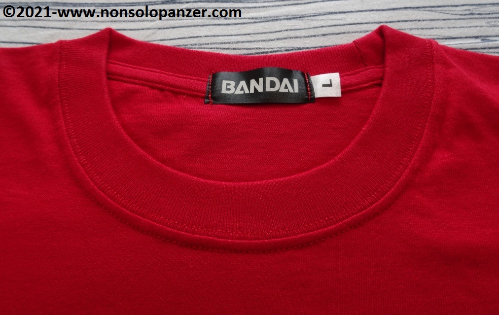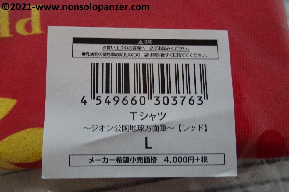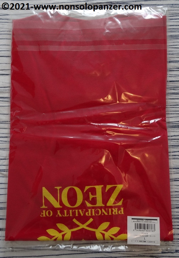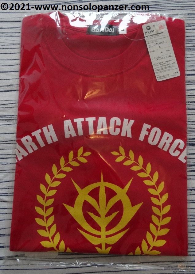 Acquistata sull’efficiente portale Hobby Link Japan, questa maglietta dal rosso brillante non si limita a riprodurre sul petto l’araldica del Principato di Zeon; il vero pregio della T-Shirt è sulla schiena dove sono riportati i riferimenti della seconda divisione mobile del EAF (Earth Attack Force), il corpo d’invasione della Terra.