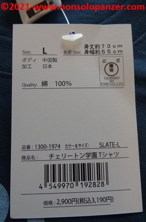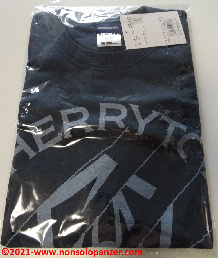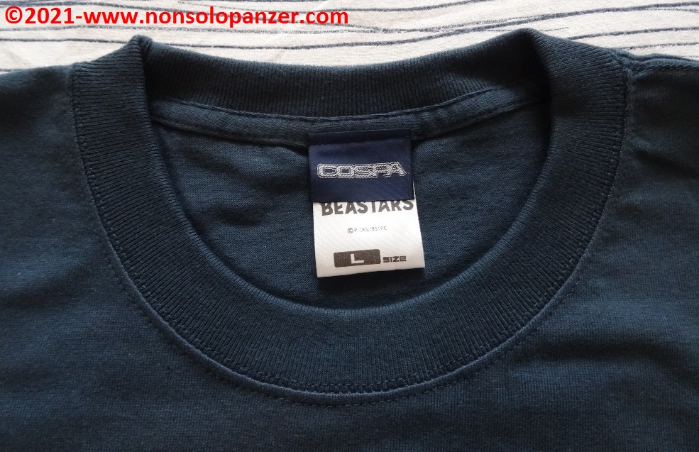 Come molte altre in mio possesso, anche questa T-shirt è prodotta da Cospa, società giapponese specializzata in merchandising dedicato agli Anime e Manga di maggior successo. Senza togliere nulla alla qualità complessiva della maglietta, non la reputo fra le migliori prodotte da Cospa. Il blu di fondo è opaco ed anonimo e la grafica apposta non è di immediata comprensione. Ritengo che Cospa avrebbe potuto sforzarsi maggiormente per rendere miglior omaggio ad un’opera di prestigio come “Beastars”. Devo, purtroppo, anche segnalare un difetto di produzione sulla manica sinistra che, corretto prontamente con ago e filo, non migliora il giudizio complessivo sulla maglietta.