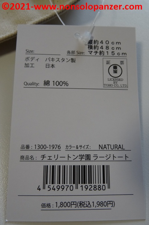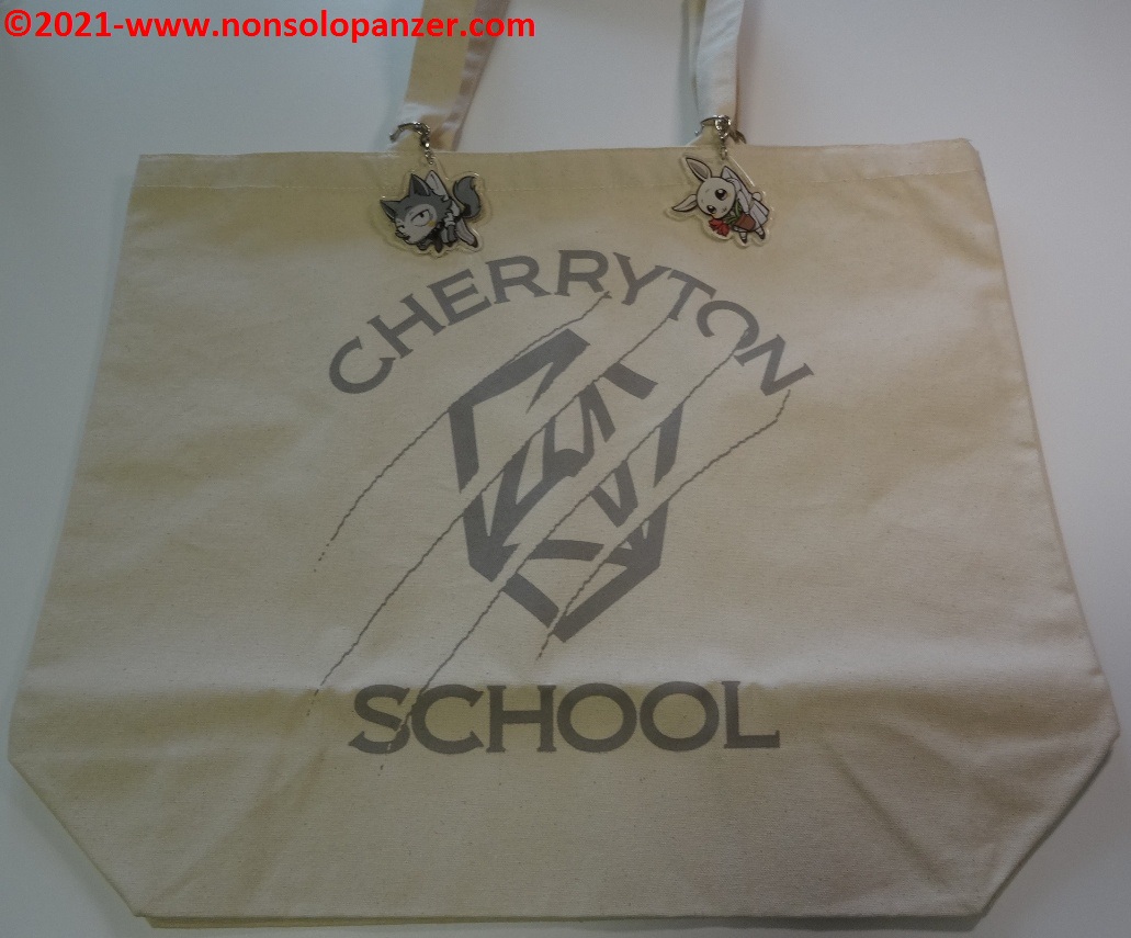 As in the case of the “Urusey Yatsura” Shopping Bag, this bag is produced by Cospa, a Japanese company specialising in merchandising dedicated to successful Anime and Manga. As usual for Cospa items, this bag is of very good quality. The canvas and the stitching are very strong, as it should be since it has to bear a heavy weight. As for the “Cherryton School” T-Shirt, my only personal criticism is the graphic design, which I find banal and not very understandable.