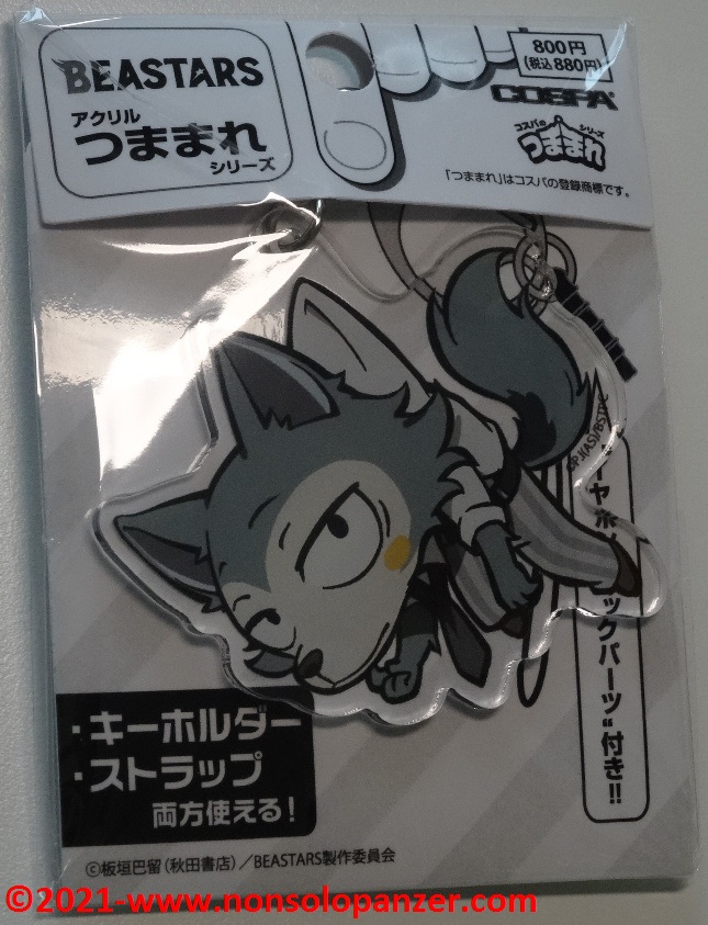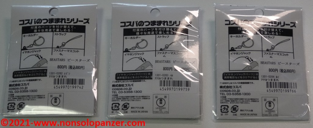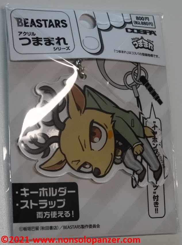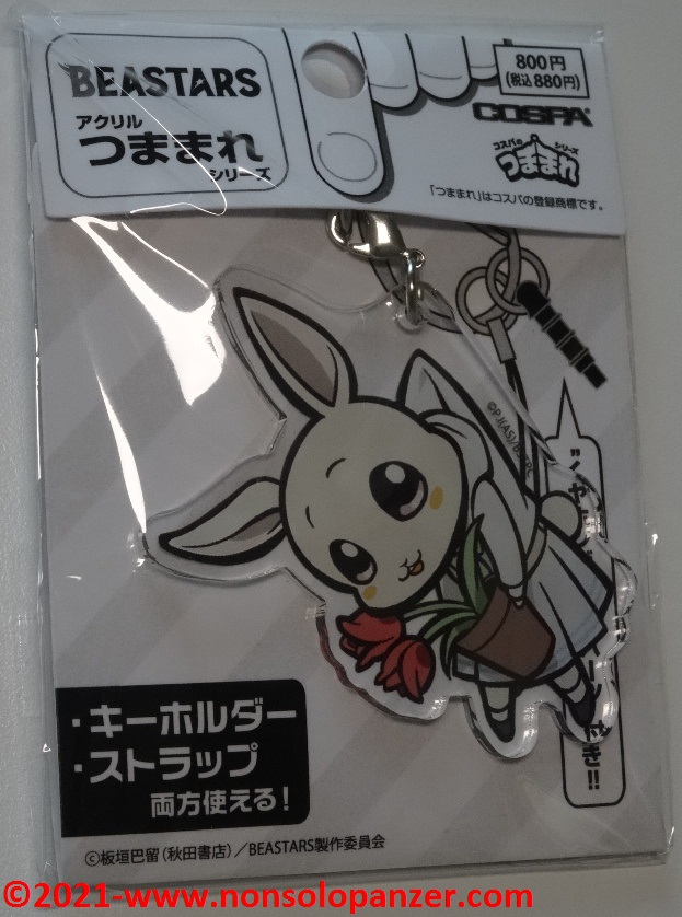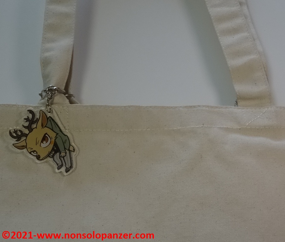 Proprio per compensare quest’ultimo aspetto, sempre tramite l’ottimo servizio di vendita online offerto da Hobby Link Japan, ho comprato tre simpatici Tsumamare, immagini stampate su supporto acrilico che possono essere usate come portachiavi, cinturini per cellulare o semplici mascotte da fissare a borse e zaini grazie ai diversi agganci disponibili. Gli Tsumamare in questione ritraggono ovviamente personaggi di “Beastars”: Legoshi, il lupo grigio protagonista, la coniglietta Haru di cui è innamorato ed il cervo rosso Louis, senpai di entrambi. Le illustrazioni riprodotte sono una simpatica versione superdeformed dei personaggi con alcune caratteristiche peculiari. Per esempio, Legoshi indossa la divisa scolastica della “Cherryton School” ed Haru ha in mano un vaso di fiori data la sua passione per la botanica. La simpatia di questi Tsumamare è incrementata dal fatto che i personaggi sembrano davvero appesi per i gancetti inclusi nelle confezioni.