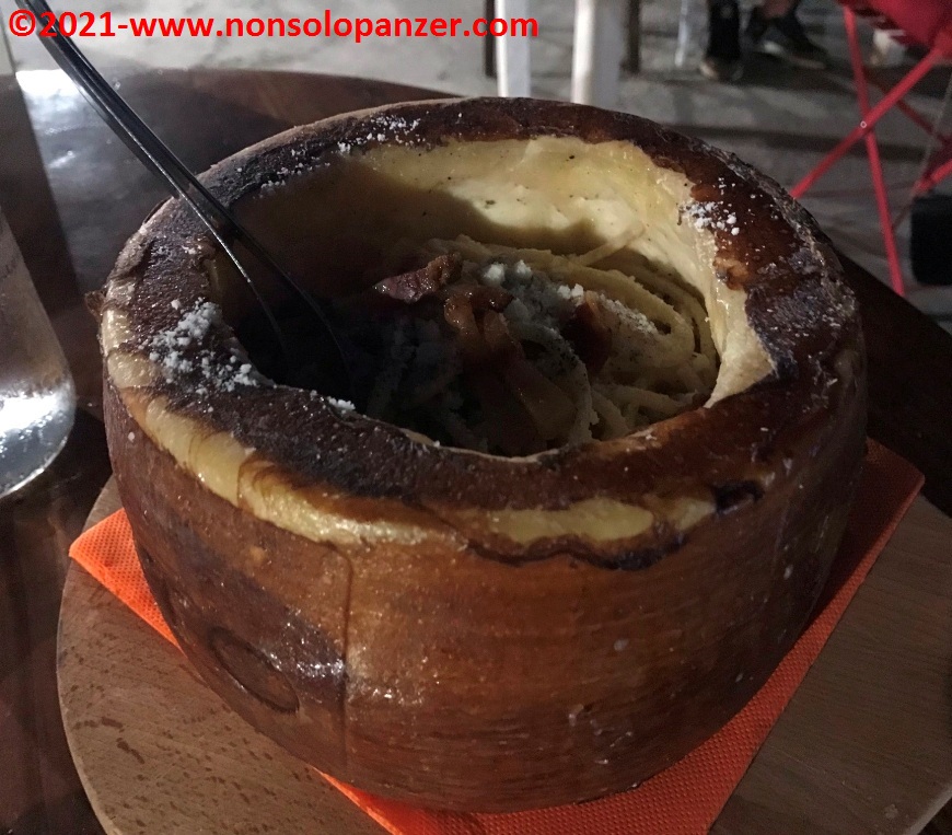 On the way back to Ascoli Piceno, I stopped almost by chance at the Osteria “La casa della api” where I had a very good dinner. I recommend the restaurant not only for the pleasant location and the exuberant all-female staff but also for an extraordinary Pasta Alla Gricia served inside a wheel of pecorino cheese.