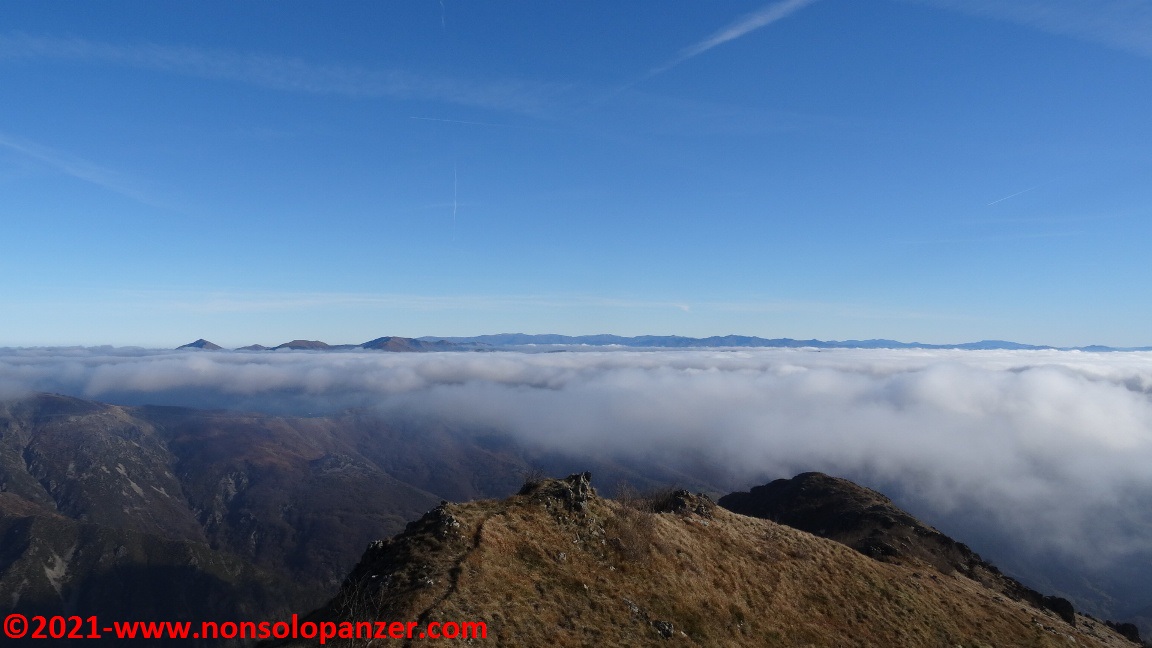 Two weeks after the beautiful trip upon top of Monte Resegone, at an altitude of 1,860 metres, the friends of the CAI (Club Alpino Italiano) involved me in another trek that won my heart. On Saturday 20 November, leaving early in the morning, I arrived in Liguria to meet up with all the others at the car park of the restaurant “La Nuvola sul Mare” – a very appropriate name given the rest of the day. From here, we took a path that, drawing a large loop of about 17 kilometres, led us to the Argentea Refuge and to the summit of Monte Rama, at an altitude of 1,150 metres. The experience was particularly positive for two main reasons. Firstly, I had never been to the Ligurian Apennines. The environment I found there impressed me a lot, right from the panorama visible from the road I drove along to get to the meeting point. I have been told that State Road 73 is one of the most beautiful roads in the Ligurian hinterland and I have no reason to believe otherwise, so much so that I intend to cycle it again as soon as I can. Finally, it was the weather conditions of the day that contributed decisively to my absolute fascination with the places I visited. The whole route offered an incredible panorama: behind us, the clear sky allowed our gaze to embrace the entire snow-covered Alpine tops, while in front, just below us, the coast and the whole sea were covered by an expanse of low clouds. When we reached the top of Monte Rama, the effect was incredible, so much so that we had the impression of being on board an aircraft at a height of a few thousand meters.