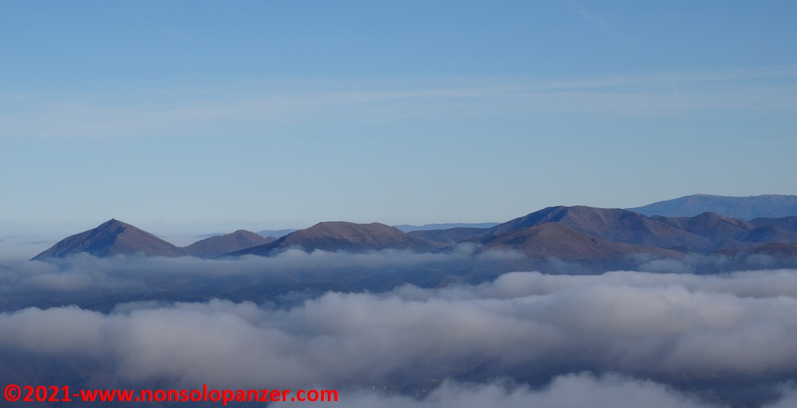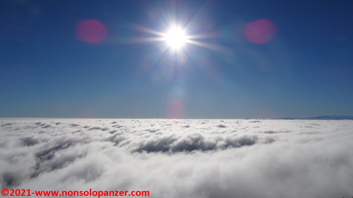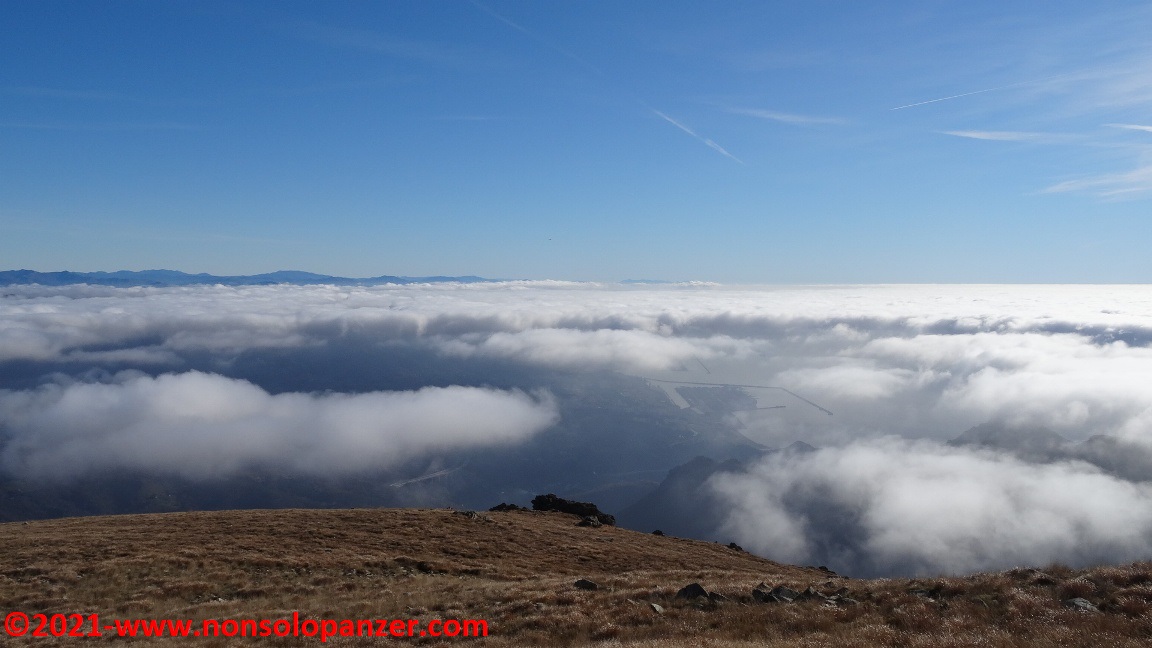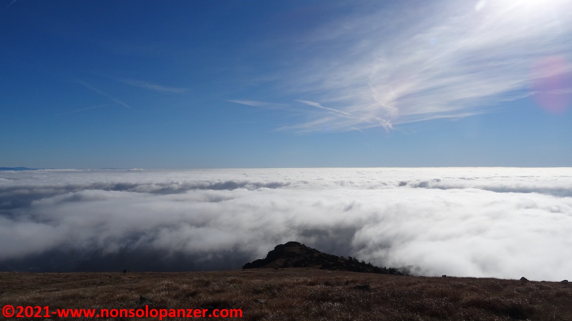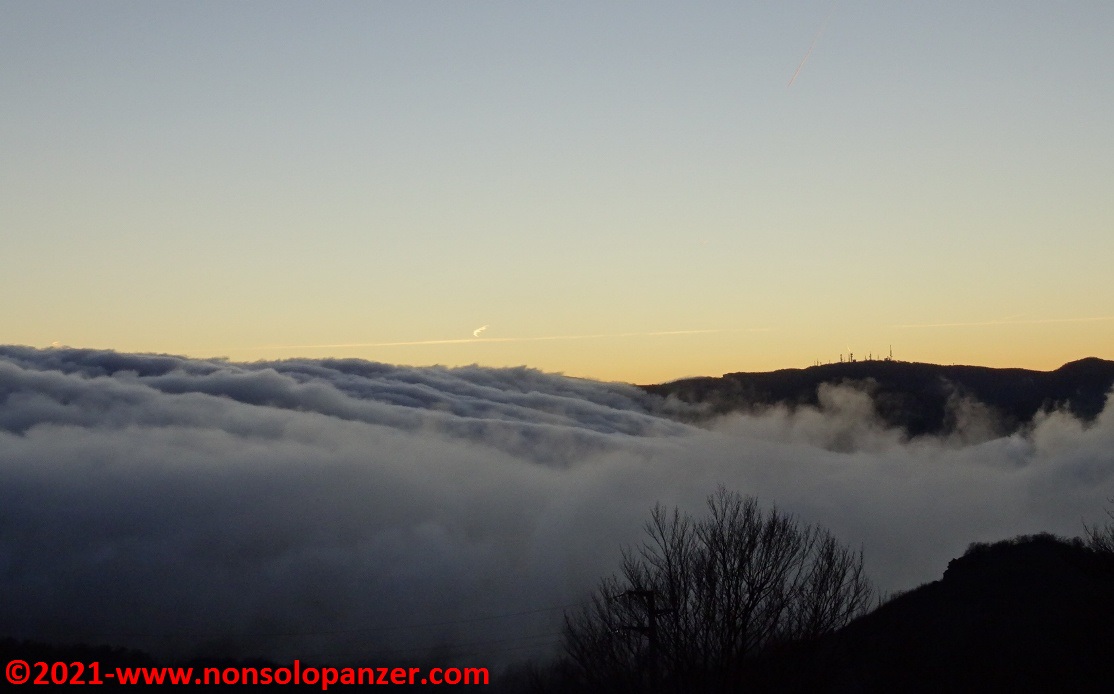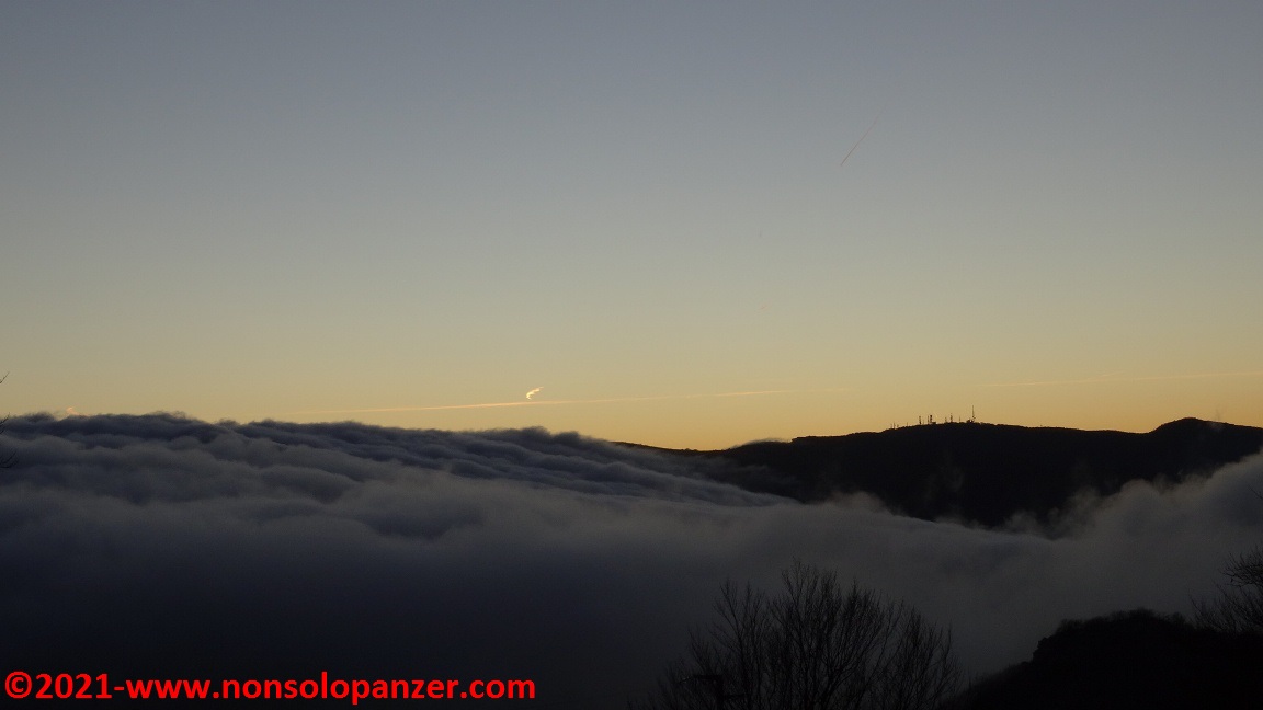 Sulla via del ritorno, il tramonto non è stato da meno grazie al mare di nuvole che, spinto dall’aria, è salito di quota inondando l’altopiano su cui camminavamo.