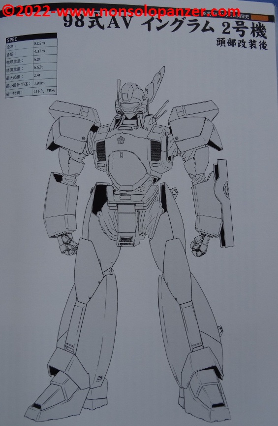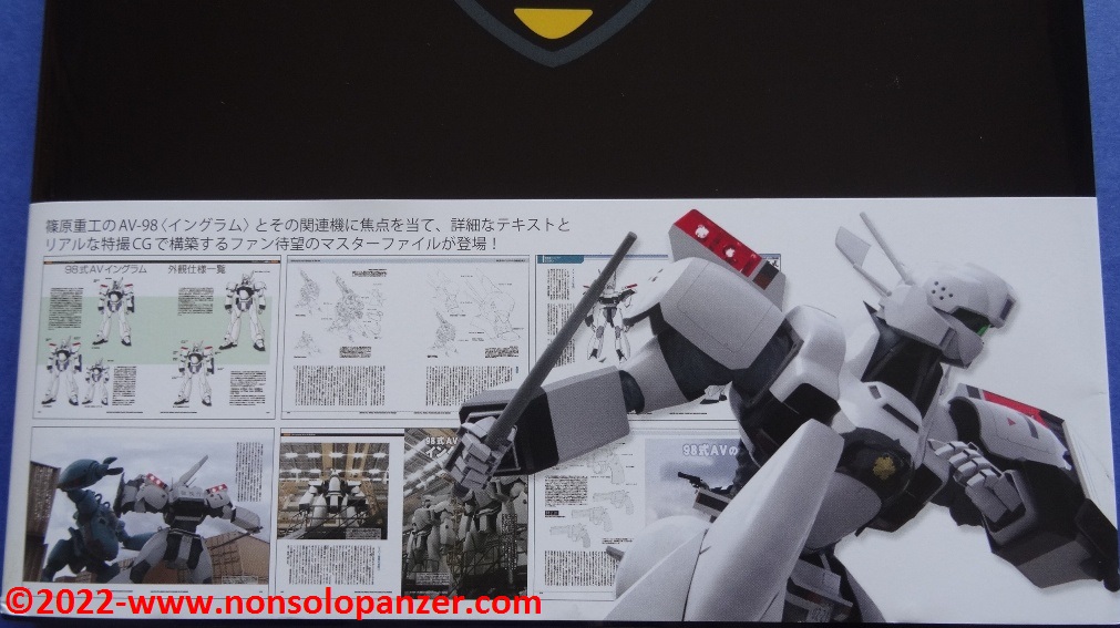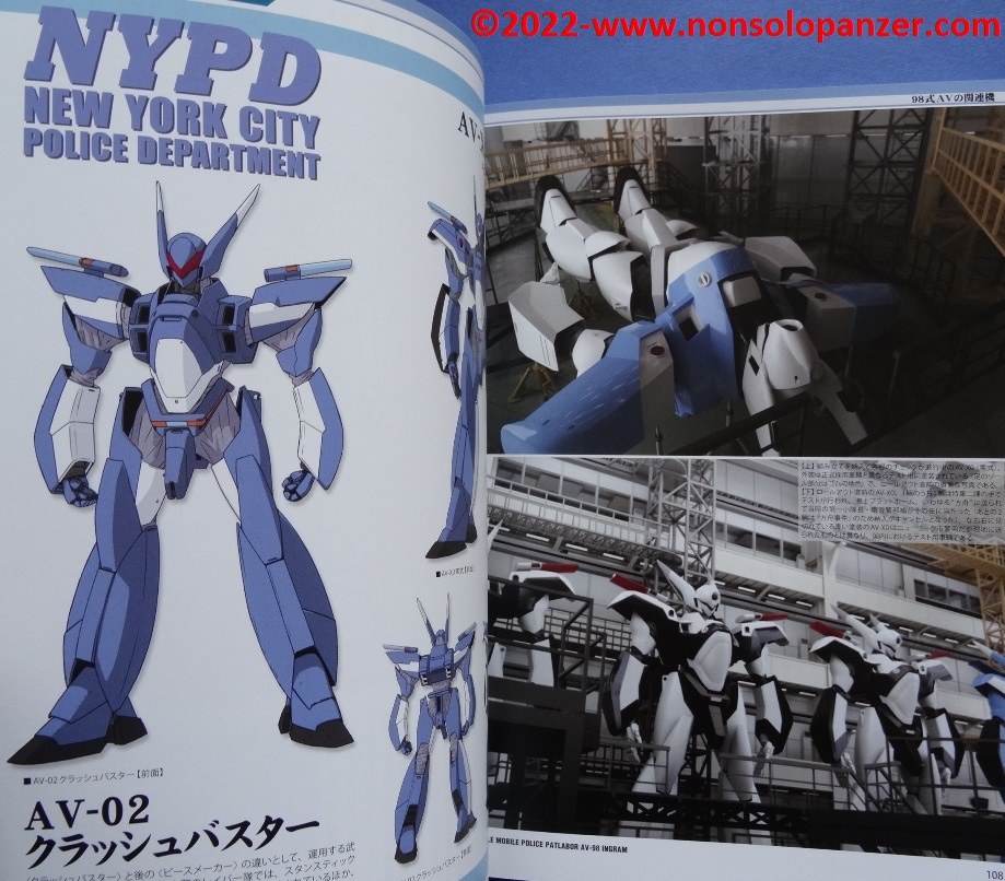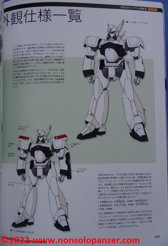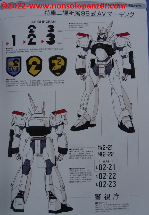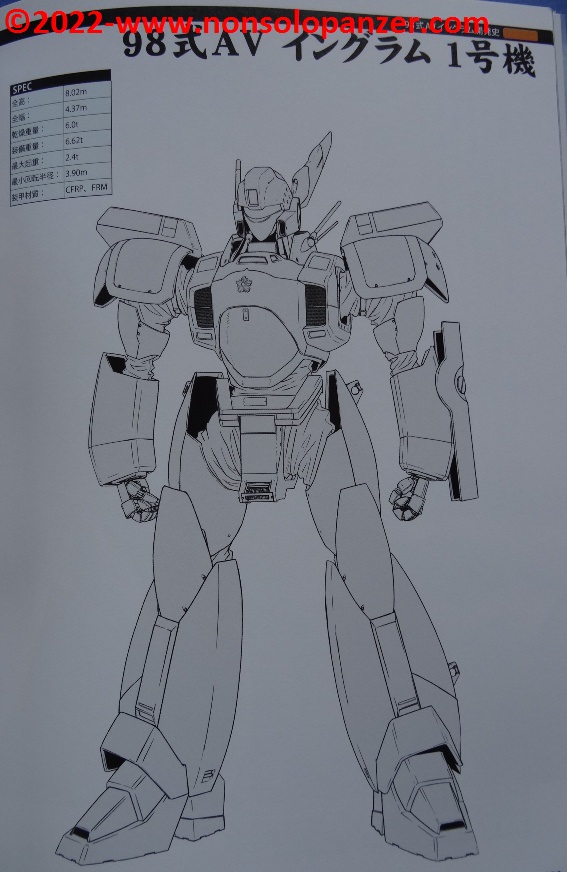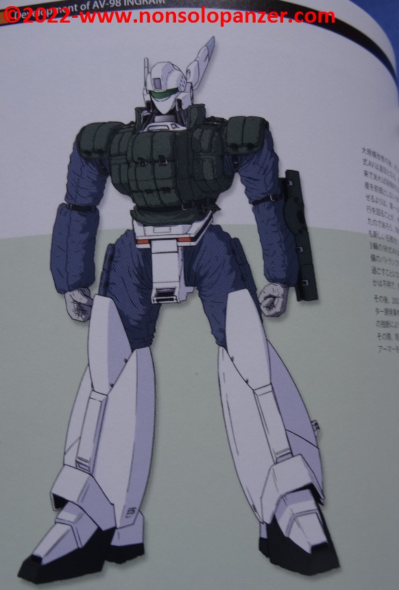 Gran parte del volume è dedicato al AV-98 “Ingram” in tutte le sue varianti. Ciò non stupisce in quanto si tratta del Labor sviluppato per la polizia di Tokyo dalla Shinohara Heavy Industries. Benché il testo, rigorosamente in lingua giapponese, sia incomprensibile, bellissime ed affascinanti sono le pagine ricche di profili e disegni tecnici espressamente realizzati per il volume in questione. L’ AV-98 “Ingram” è mostrato in tutti suoi dettagli, con spaccati tecnici che ne riproducono gli interni e tutte le caratteristiche tecniche.