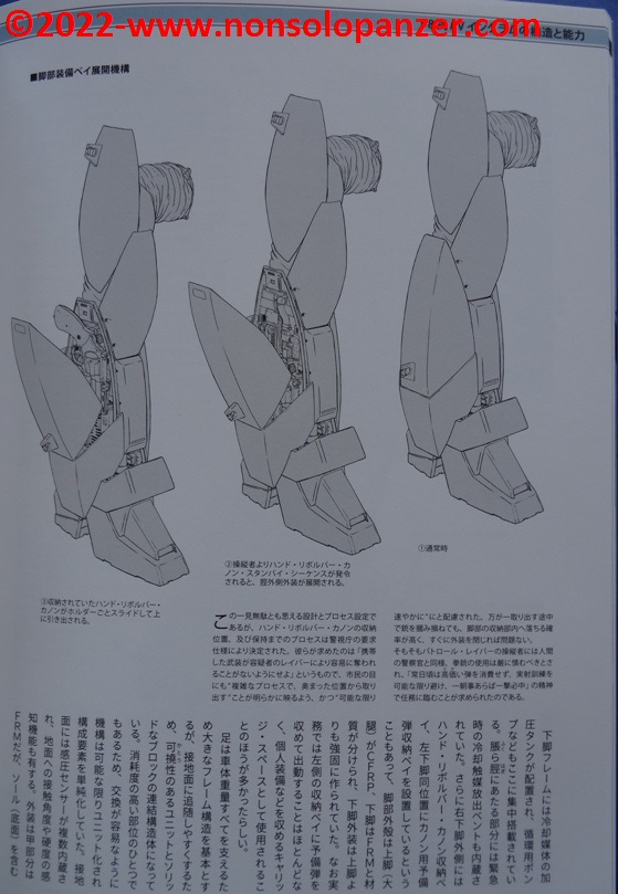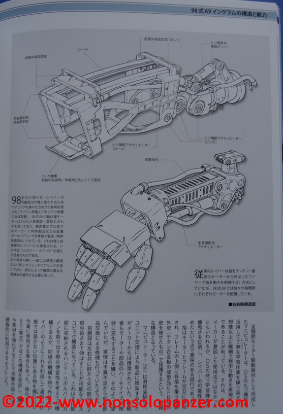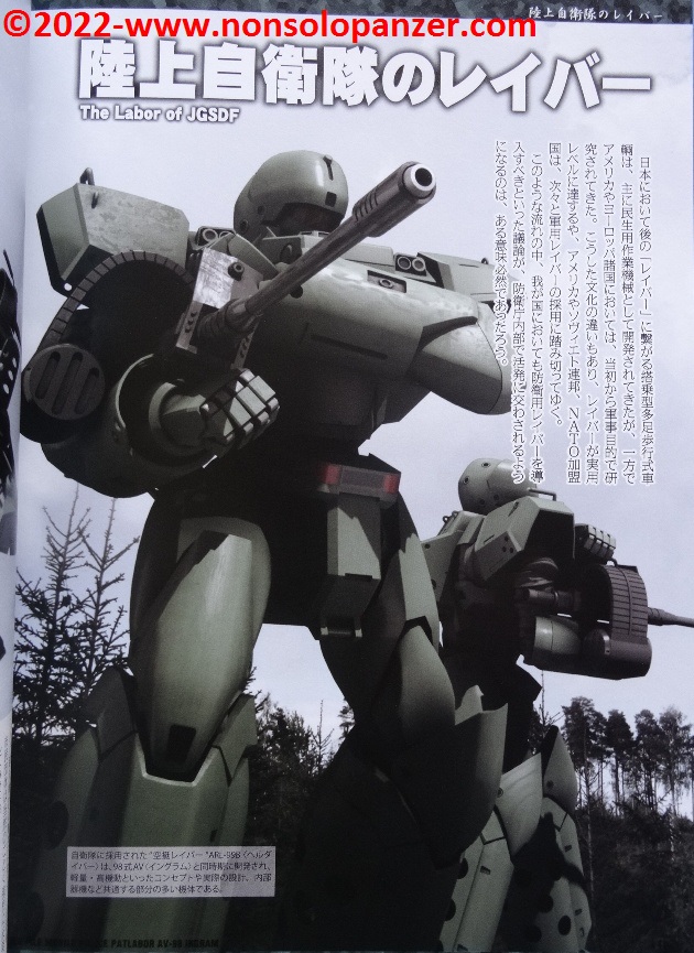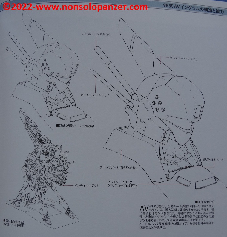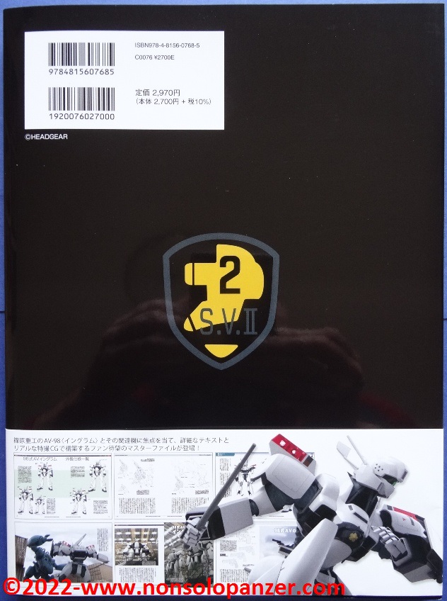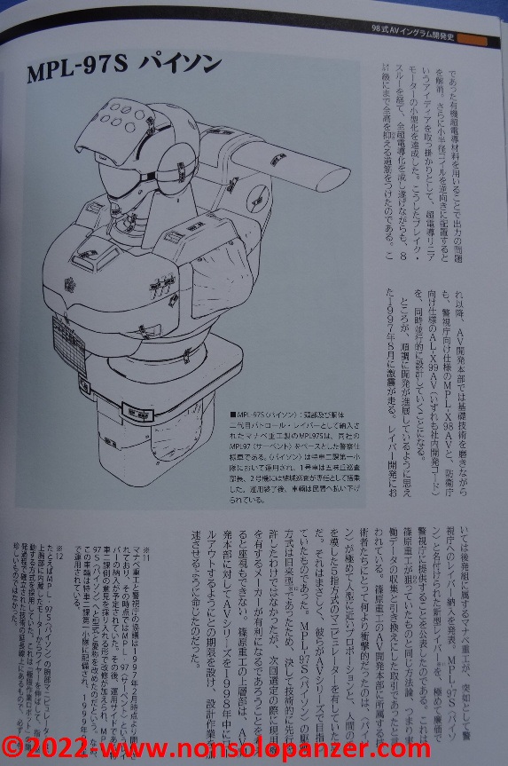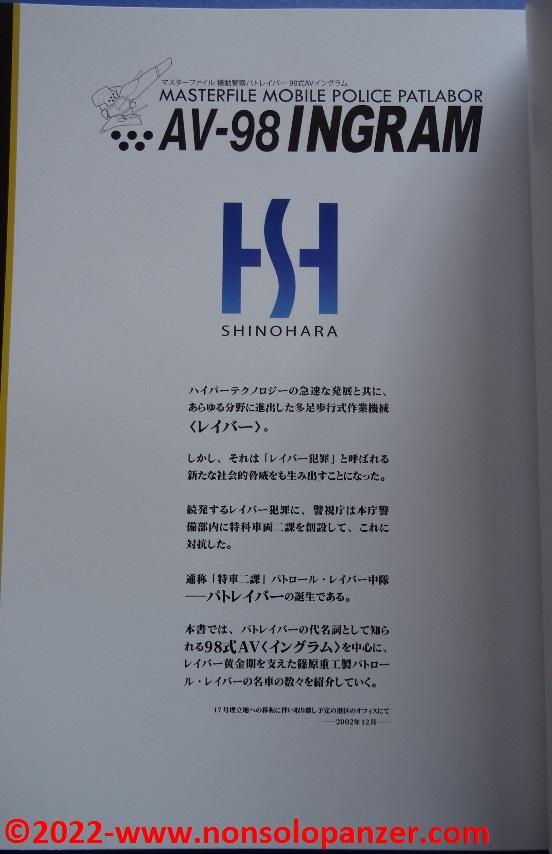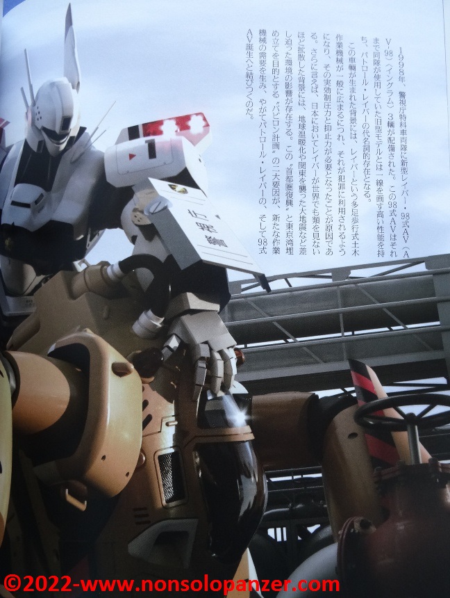 Gran parte del volume è dedicato al AV-98 “Ingram” in tutte le sue varianti. Ciò non stupisce in quanto si tratta del Labor sviluppato per la polizia di Tokyo dalla Shinohara Heavy Industries. Benché il testo, rigorosamente in lingua giapponese, sia incomprensibile, bellissime ed affascinanti sono le pagine ricche di profili e disegni tecnici espressamente realizzati per il volume in questione. L’ AV-98 “Ingram” è mostrato in tutti suoi dettagli, con spaccati tecnici che ne riproducono gli interni e tutte le caratteristiche tecniche.