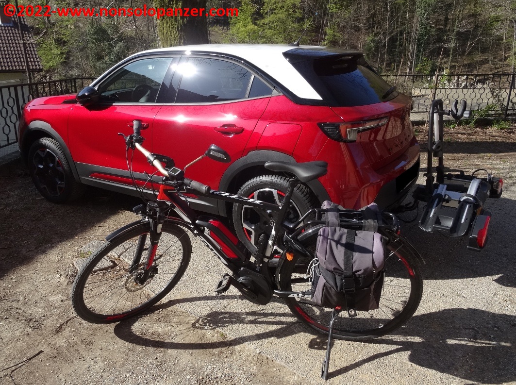 The retirement of my Fiat 500 and the purchase of an Opel “Mokka” miraculously delivered to me only two months after the order was placed, started a new season of cycling tours. With an essential tow hitch installed on the “Mokka”, I can now attach the bike rack to the car. An accessory that I did not fail to snatch up from my father for bicycle tours in comfort. My father’s bike rack is much more modern than the one I repainted for my Fiat 500. In addition to more secure bike fixings, it also has a very good mechanism that allows the trunk to be opened while still having the bikes already attached to the rack. This is not a small technical gimmick that, together with the capable Opel “Mokka” and the high-performance pedal-assisted Atala bike, creates a trio that concedes no excuses: continual bicycle trips are required to make the most of the potential of so much equipment.