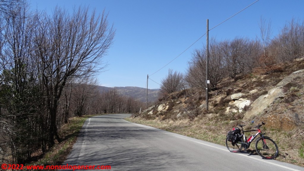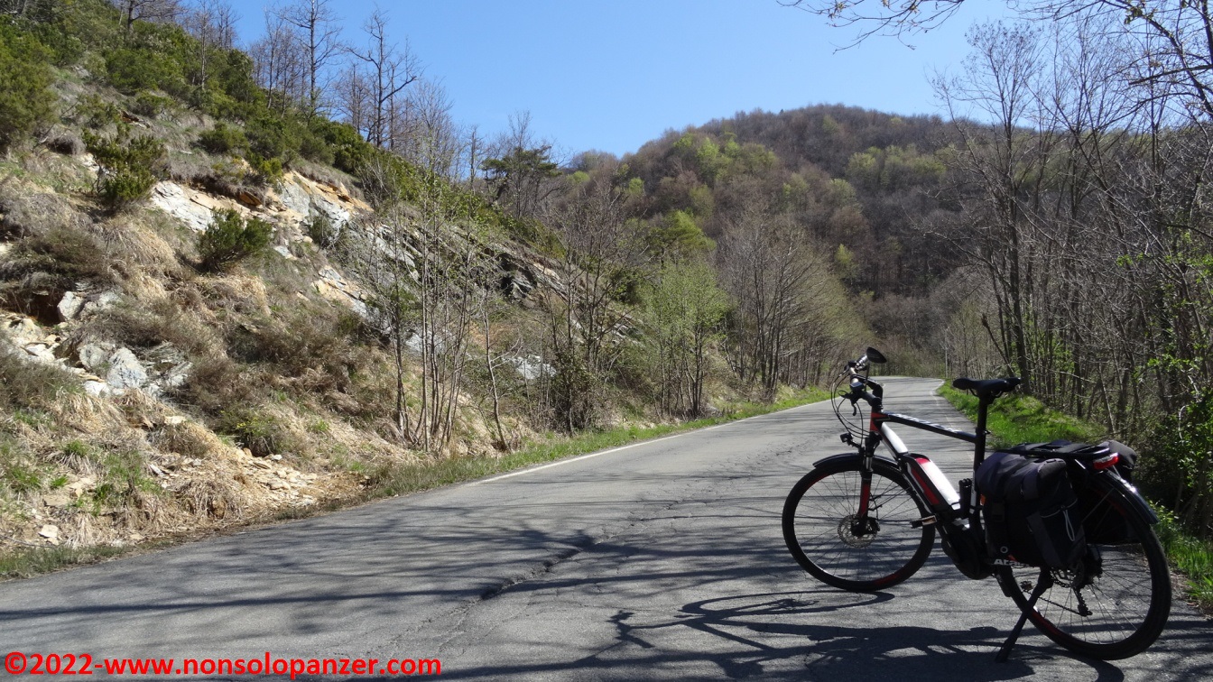 Di nuovo in sella, sono tornato sul Passo del Faiallo ed ho ripercorso la Strada Provinciale 40 fino al bivio con la Strada Provinciale 64 che mi ha portato fino ad Acquabianca, Tiglieto e poi Casavecchia, più a nord di Martina Olba. Dopo una breve salita iniziale, la strada ha attraversato un tranquillo paesaggio montano con scorci che mi hanno ricordato l’Alto Adige. Davvero una scoperta sorprendente che ha contribuito all’ottimo giudizio che ho maturato su questa zona dell’entroterra ligure.