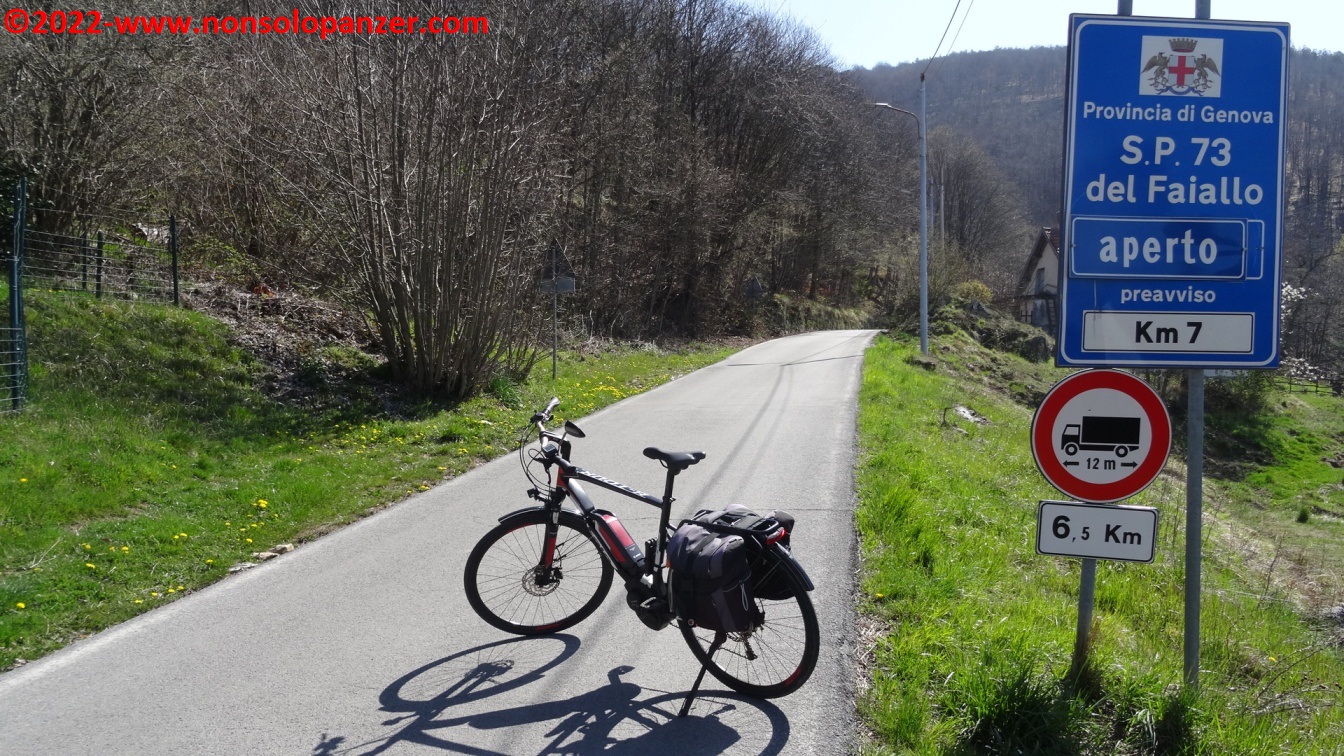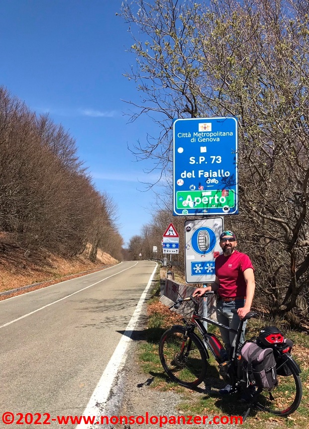 Inforcata la bici, ho puntato verso San Pietro D’Olba percorrendo la Strada Provinciale 53. Mi sono subito accordo di numerose ville storiche appartenute all’aristocrazia ed all’alta borghesia genovese. Ho successivamente scoperto che la zona era molto apprezzata per le bellezze naturali e, date le copiose nevicate, per le attività invernali. Poco prima di San Pietro, all’altezza del ponte sul fiume Orba, ho imboccato la Strada Provinciale 40 che, serpeggiando lungo il fianco delle montagne, mi ha portato fino al Passo del Faiallo dove ho pranzato ai tavoli esterni del Rifugio “La Nuvola sul Mare”.