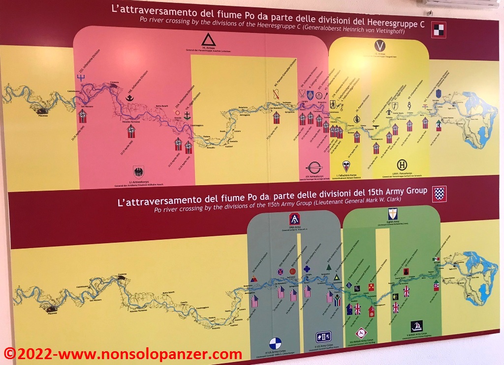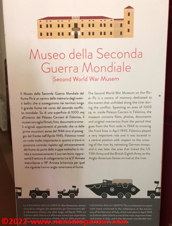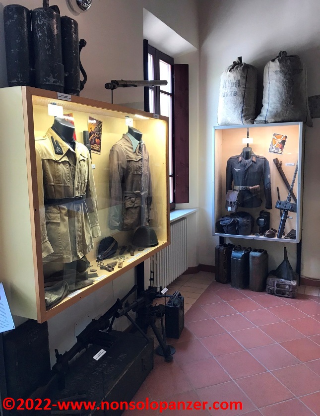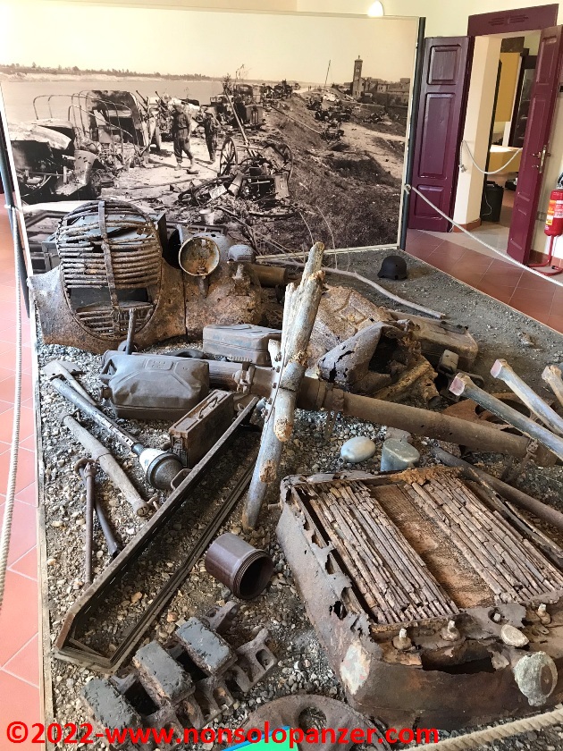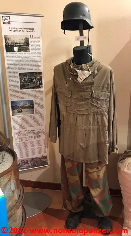 The pages of this blog contain accounts of many military history museums I have visited over the years: the Defense Technology Museum in Koblenz, the Deutsches Panzermuseum in Munster, the December 44 Museum in La Glaize, to name but a few. On the strength of this experience, I can say that the Second World War Museum Of Po River really has nothing to envy the best European military museums. Of course, it cannot boast a rare “Tiger II” off its premises like the December 44 Museum in La Glaize, but the quality of the collection, the historical value of every single piece and the care that permeates the entire exhibition has nothing to envy from more renowned museums. Spontaneous is the parallelism with the December 44 Museum. Both museums have a particularly modern and engaging exhibition layout as well as a collection composed of pieces from the surroundings. Just as the December 44 Museum exhibits uniforms and equipment of the Kampfgruppe Peiper that dissolved at La Glaze, so the Second World War Museum Of Po River collects the remains of the German and Allied units that fought along the banks of the Po River in the last weeks of the war.
