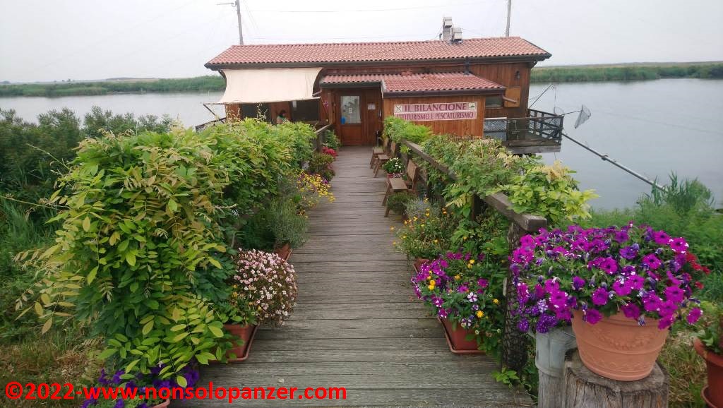 Proprio percorrendo l’argine, abbiamo scoperto il ristorante “Il Bilancione” dove abbiamo trovato ristoro pranzando molto bene nel tipico contesto di un locale ricavato da una vecchia palafitta per la pesca.