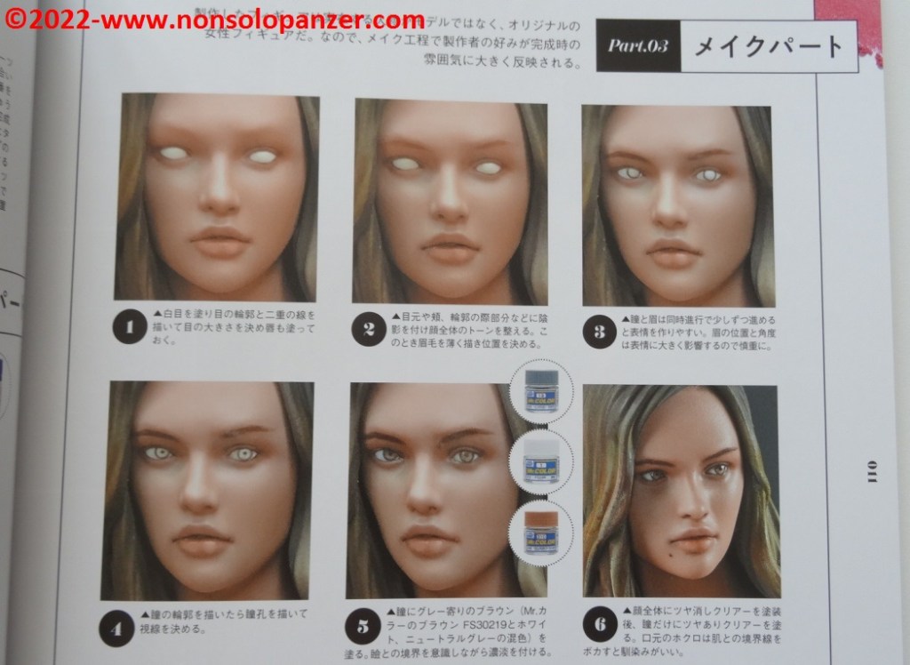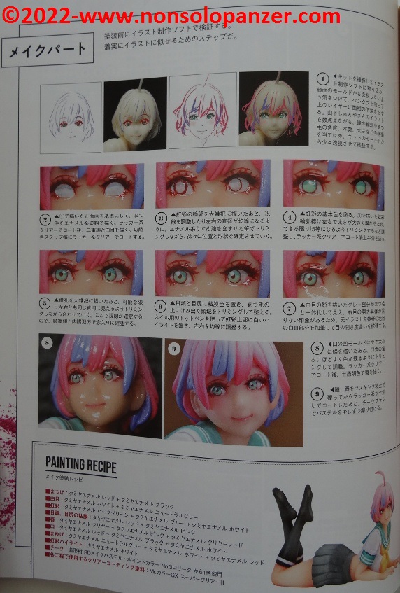 Come fa intuire il titolo, “Figure Beauty Makeup Paint Female Figures To Your Liking!” è principalmente dedicato alle tecniche di pittura del volto e dell’incarnato. Non si tratta di un difetto, il viso di una Japan Figure, così come quello di qualsiasi miniatura, ha un ruolo fondamentale essendo il primo aspetto che attira l’attenzione dell’osservatore e ne condiziona l’apprezzamento.