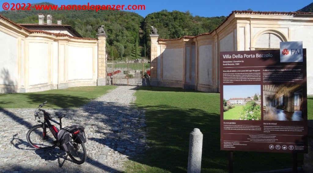 Nell’aprile del 2019 feci un piacevole trekking sui Pizzoni di Laveno grazie ad un anello che, partendo da Vararo, mi portò fino al Passo del Cuvignone. Lo scorso sabato 17 settembre, sfidando il primo vento gelido dell’autunno in arrivo, ho deciso di tornare in quei luoghi muovendomi, però, in bicicletta. Come ormai usuale, la potente Opel “Mokka” (purtroppo ancora con i segni di una grandinata presa a fine luglio) e la mia Atala a pedalata assistita mi hanno accompagnato nell’avventura. Verso le nove del mattino, ho parcheggiato la “Mokka” negli spazi esterni di Villa Della Porta Bozzolo, bene del FAI che troverò certamente occasione di visitare.
