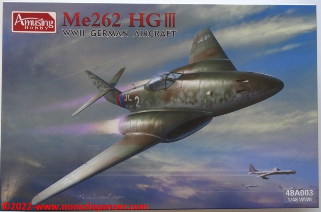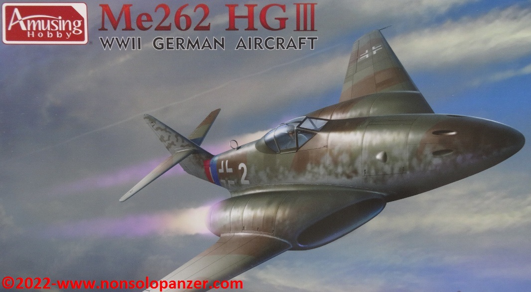 ll Messerschmitt Me-262 fu il primo caccia con motore a getto ad essere usato in combattimento. Equipaggiato con due Jumo 004, il Me-262 entrò in servizio nel 1944 in seno alla Luftwaffe. Il Me-262 era un aereo tecnologicamente molto avanzato per l’epoca ed influenzò fortemente i progetti postbellici delle nazioni vincitrici. Il salto tecnologico fu tale da compromettere l’efficienza del caccia stesso. La Luftwaffe impiegò quasi un anno a comprendere che il Me-262 non era un normale aereo dotato di un motore innovativo bensì un velivolo completamente nuovo che imponeva un impiego operativo specificatamente sviluppato sulla base delle sue particolari caratteristiche. Come impone la corsa agli armamenti durante un conflitto mondiale, i progettisti tedeschi iniziarono ad ipotizzare versioni migliorate del Me-262 non appena lo sviluppo di quest’ultimo fu sostanzialmente concluso. Uno dei progetti più interessanti è certamente il Me-262 HG III. Tutta la serie HG (Hochgeschwindigkeit) era finalizzata ad incrementare le prestazioni del Me-262 sia a livello aerodinamico che di autonomia. L’HG III prevedeva delle modifiche strutturali radicali come un canopy più compatto, i timoni di coda a V ed ali interamente ridisegnate così da contenere al loro interno le turbine a getto ed avere un’inclinazione a 45 gradi (contro i 18.5 gradi del Me-262 standard). Il risultato di tutti questi interventi è un caccia dall’aspetto aggressivo e singolare come ben dimostra il kit recentemente commercializzato da Amusing Hobby.