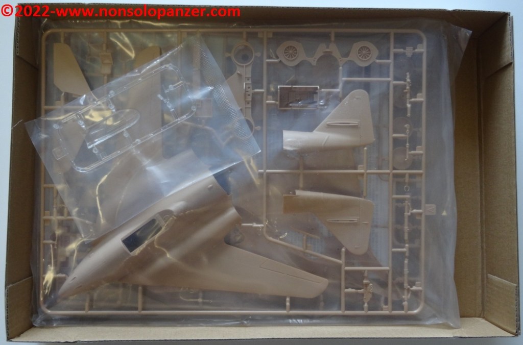 Per tutti gli appassionati come me di progetti tedeschi rimasti sulla carta, questo kit di Amusing Hobby è una vera benedizione come lo è stata la precedente scatola di montaggio dedicata al Focke-Wulf “Triebflügel”. E’, infatti, la prima volta che viene commercializzato un modello in plastica del Me-262 HG III in scala 1/48. Pur godendo appieno della gioia concessa da una tale, inaspettata uscita, va riconosciuto che, come il precedente Focke-Wulf “Triebflügel”, il kit è molto semplice. Si tratta di due stampate composte da una ventina di pezzi. Le ali sono unite alla fusoliera in due scocche (superiore ed inferiore). La coda, anch’essa divisa in due parti, è separata dalla fusoliera. Il resto dei pezzi riproducono in modo molto basico i carrelli, il cockpit e poco altro. Nonostante le inusuali scelte progettuali del kit (normalmente le ali sono divise dalla fusoliera e la coda è parte integrante della stessa), quanto offerto da Amusing Hobby è un modello basico, con un livello di dettaglio minimo.