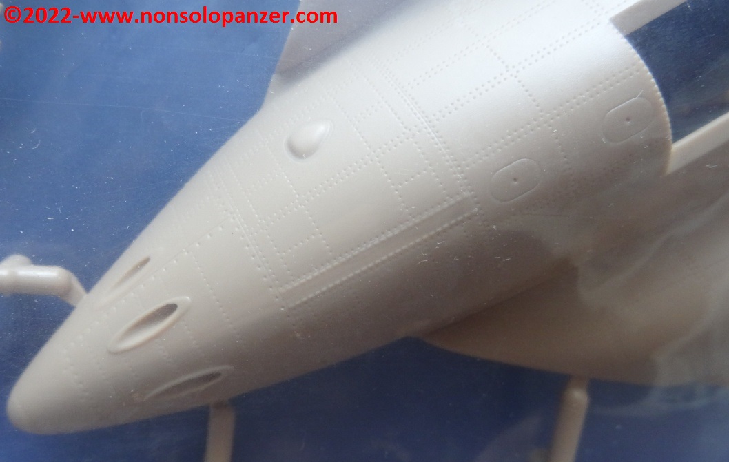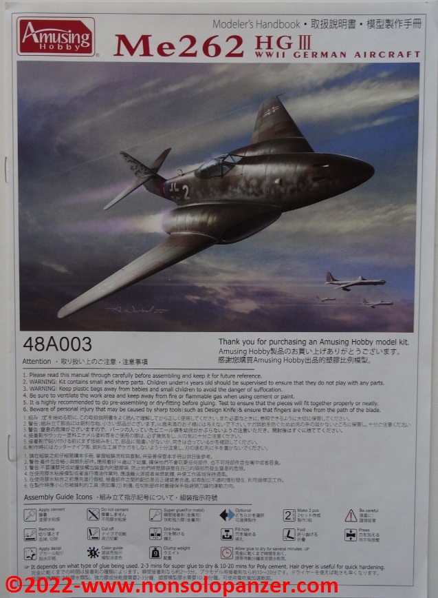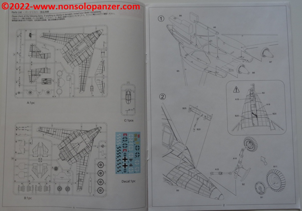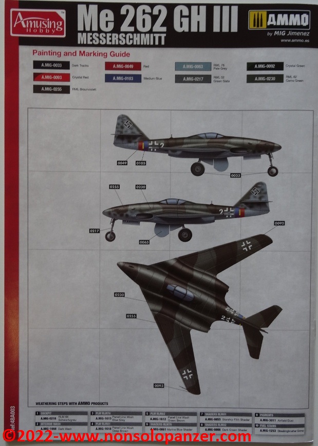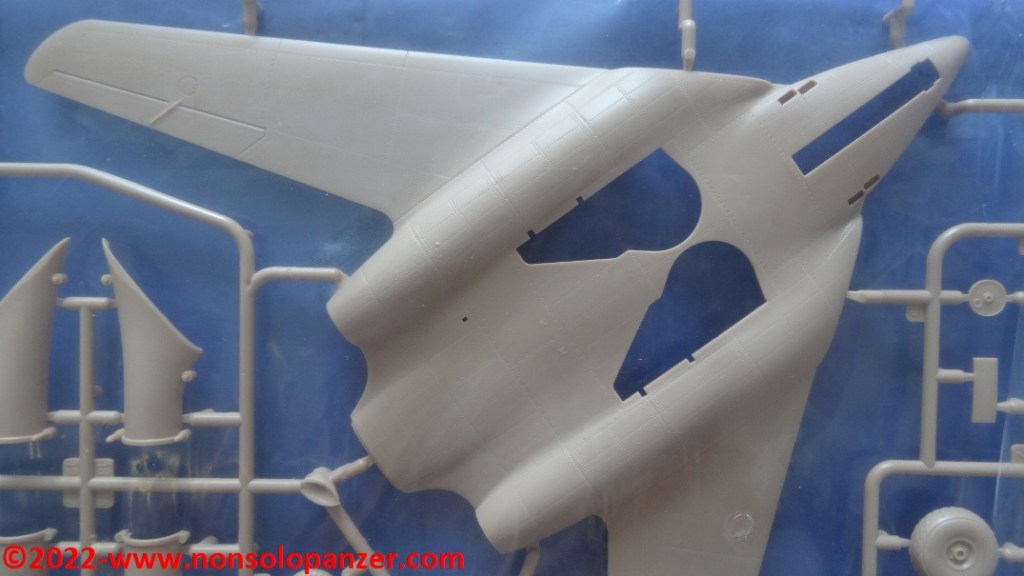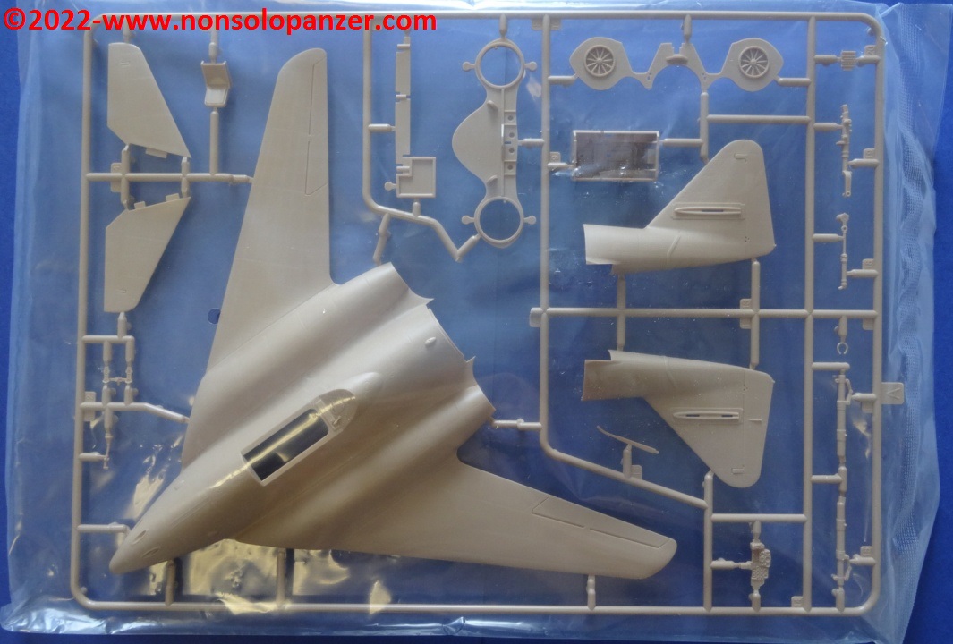 For all fans like me of German designs that have remained on paper, this kit from Amusing Hobby is a true blessing as was the previous assembly box dedicated to the Focke-Wulf “Triebflügel.” It is, in fact, the first time a plastic model of the Me-262 HG III has been marketed in 1/48 scale. While fully enjoying by such an unexpected release, it must be acknowledged that, like the previous Focke-Wulf “Triebflügel“, the kit is very simple. It consists of two molds composed of about 20 pieces. The wings are joined to the fuselage in two shells (upper and lower). The tail, also divided into two parts, is separated from the fuselage. The rest of the parts reproduce in a very basic way the undercarriages, cockpit, and little else. Despite the unusual design choices of the kit (normally the wings are separated from the fuselage and the tail is an integral part of the fuselage), what Amusing Hobby offers is a basic model with a minimal level of detail.