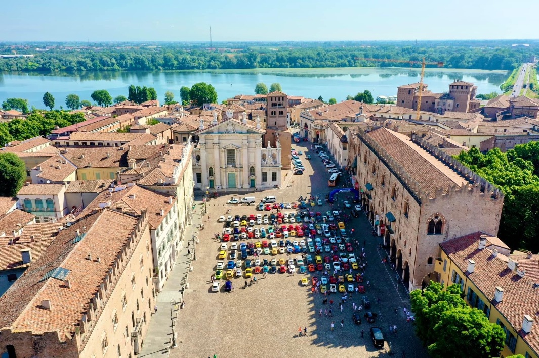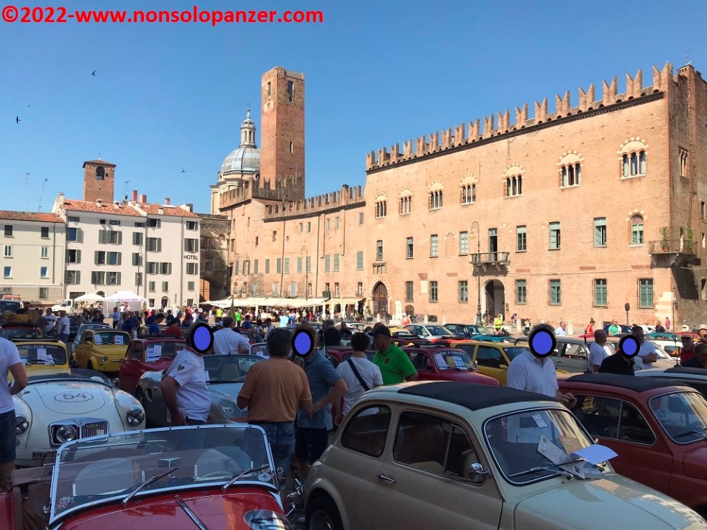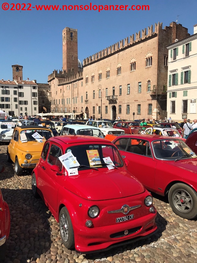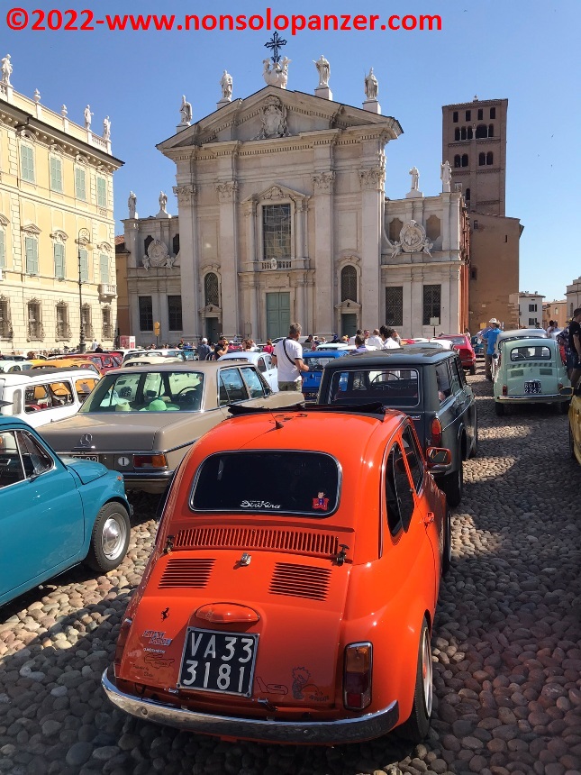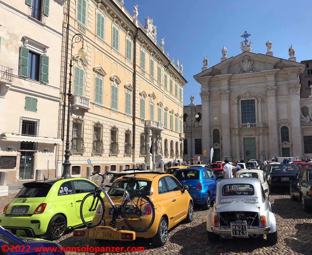Il raduno ha goduto di una splendida giornata di sole ma soprattutto della meravigliosa cornice di Piazza Sordello, ove si sono riunite tutte le auto partecipanti alla ventiquattresima edizione del Mantova Meeting, evento ormai ben noto dedicato alle auto storiche ed in particolare alla Fiat 500 in tutte le sue versioni. Ho avuto il piacere di parteciparvi con la mia “Chicca” a cui ho aggiunto, per non passare inosservato, il portabici dipinto dello stesso colore.