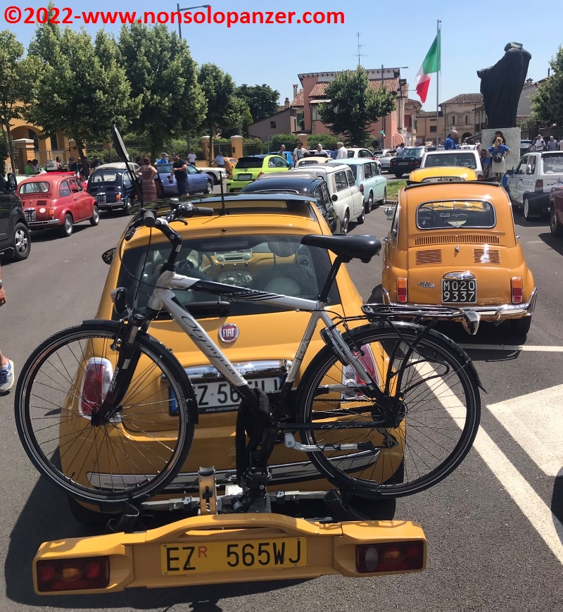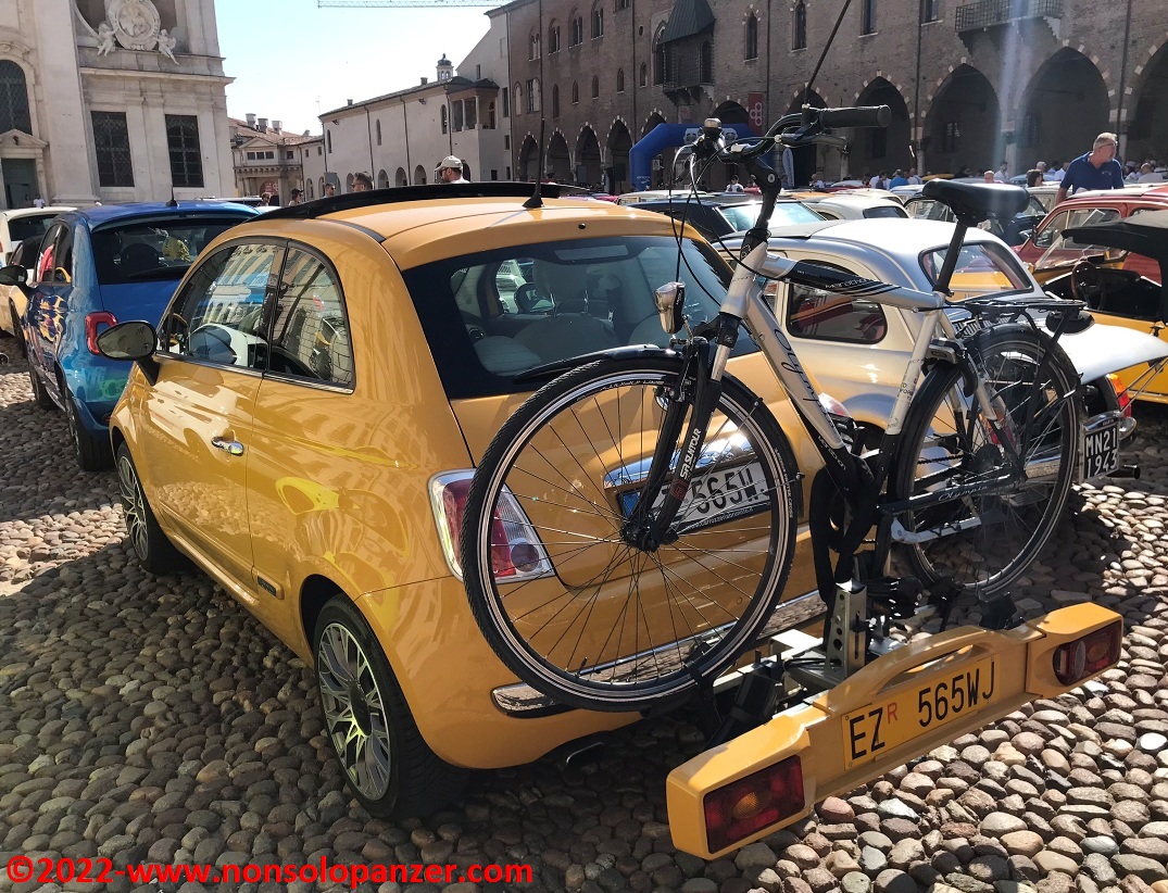 The rally enjoyed a splendid sunny day but above all the wonderful setting of Piazza Sordello, where all the cars taking part in the 24th “Mantova Meeting 500”, a well-known event dedicated to historic cars and in particular to the Fiat 500 in all its versions, were assembled. I had the pleasure of participating with my “Chicca” to which I added, not to go unnoticed, the bike rack painted the same colour.