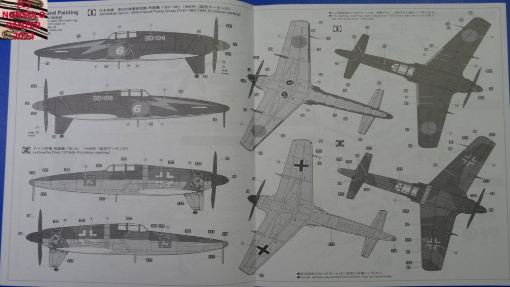 Proposto in edizione limitata, il kit riproduce il Kyūshū J7W1 “Shinden” nell’ipotetica livrea adottata nel 1946 dal 302nd Japanese Navy Air Corps, con codice velivolo “Yo-D-106“. A tale soggetto è dedicata la bella boxart del talentuoso Koige Shigeo ed un foglio decal che include tutti i dettagli, fulmine compreso, di un’araldica decisamente affascinante. Il medesimo kit, include anche le decal per riprodurre uno “Shinden” operativo nella Luftwaffe tedesca. Anche in questo caso si tratta di un “What if” che trae fondamento dagli scambi tecnologici avvenuti fra Giappone e Germania in forza dell’alleanza firmata nel 1940.