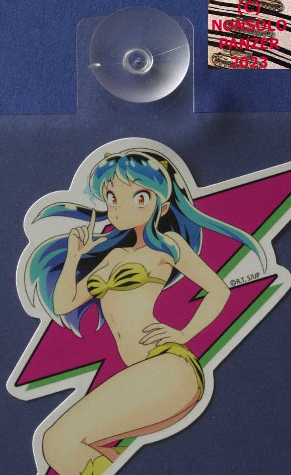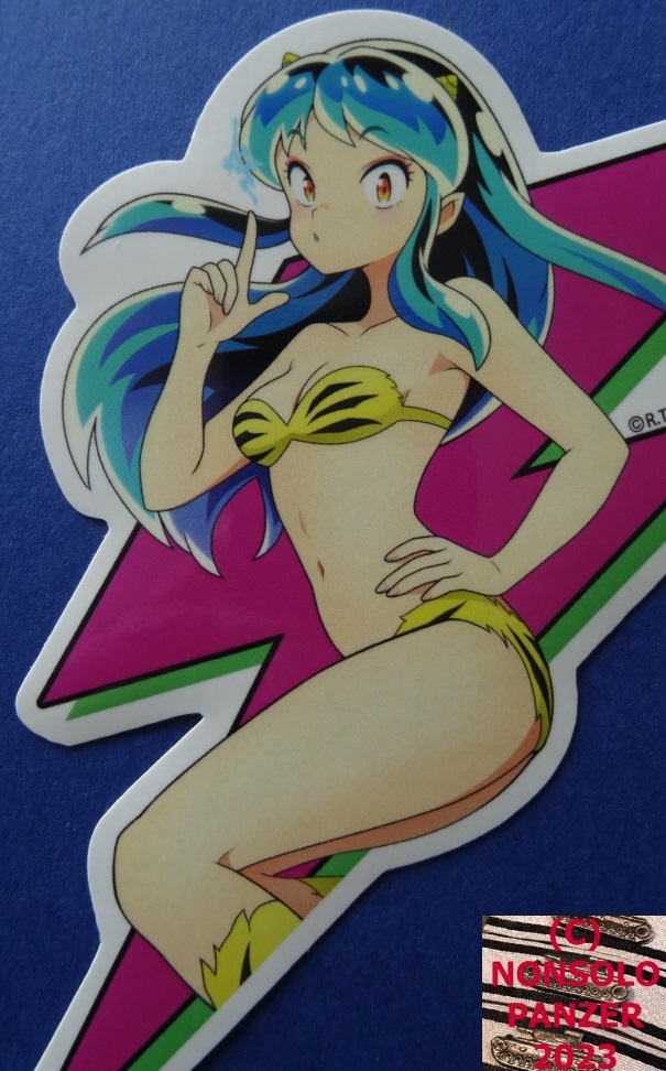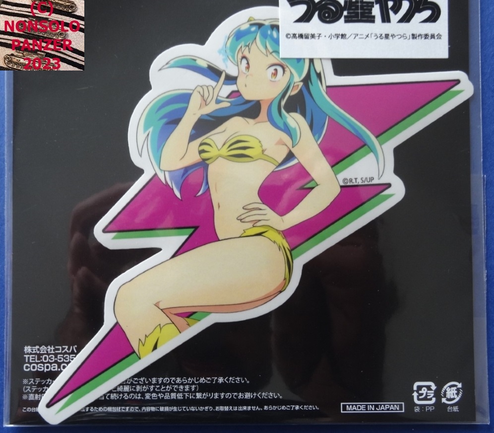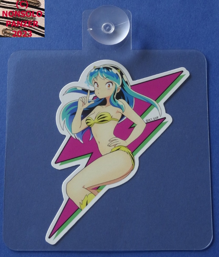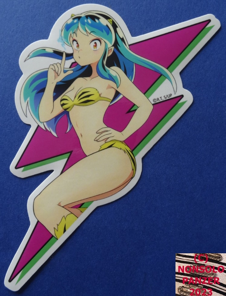 Commercializzato da Cospa, questo adesivo è di ottima qualità e ritrae la protagonista nella postura che adotta quando esprime la soddisfazione per aver colpito Ataru con un fulmine particolarmente potente. Lamù, infatti, è un’aliena in grado di lanciare scariche elettriche, dote che usa regolarmente per punire Ataru a causa della sua incapacità di resistere alla tentazione di corteggiare qualsivoglia ragazza gli capiti a tiro.
